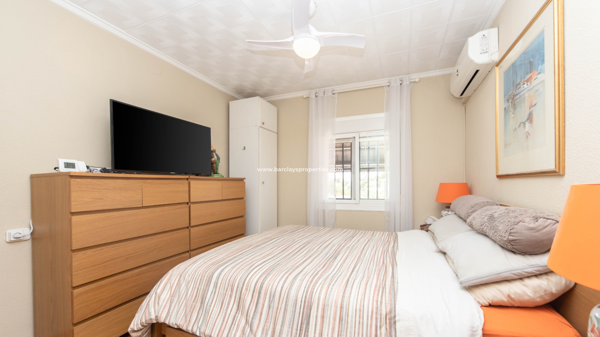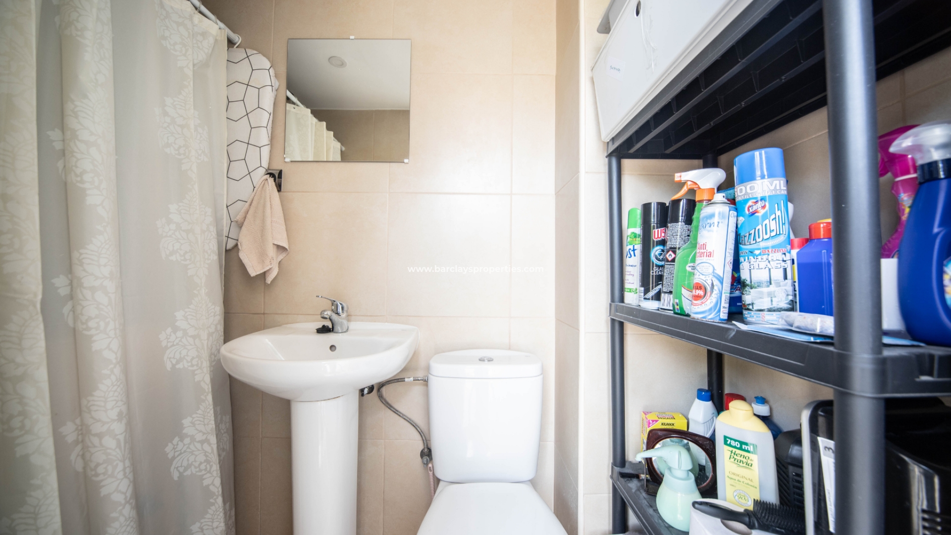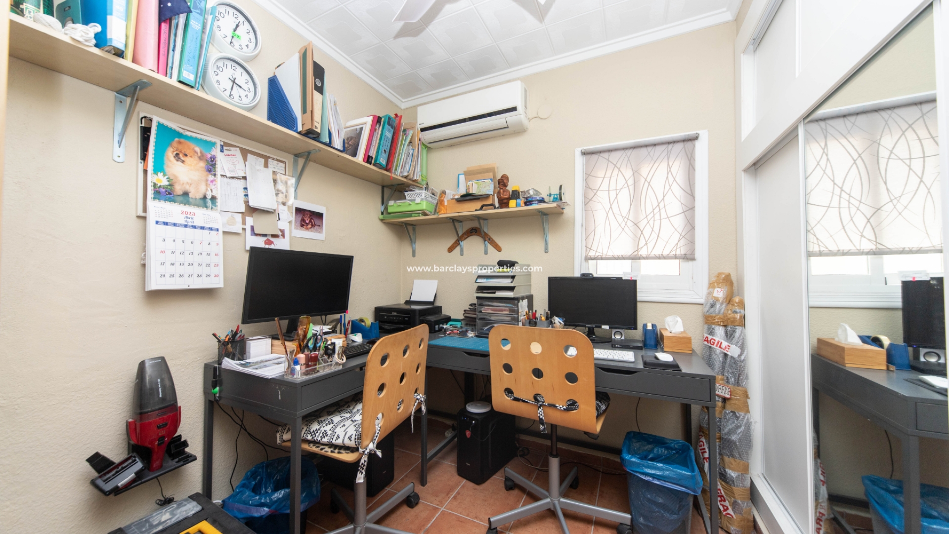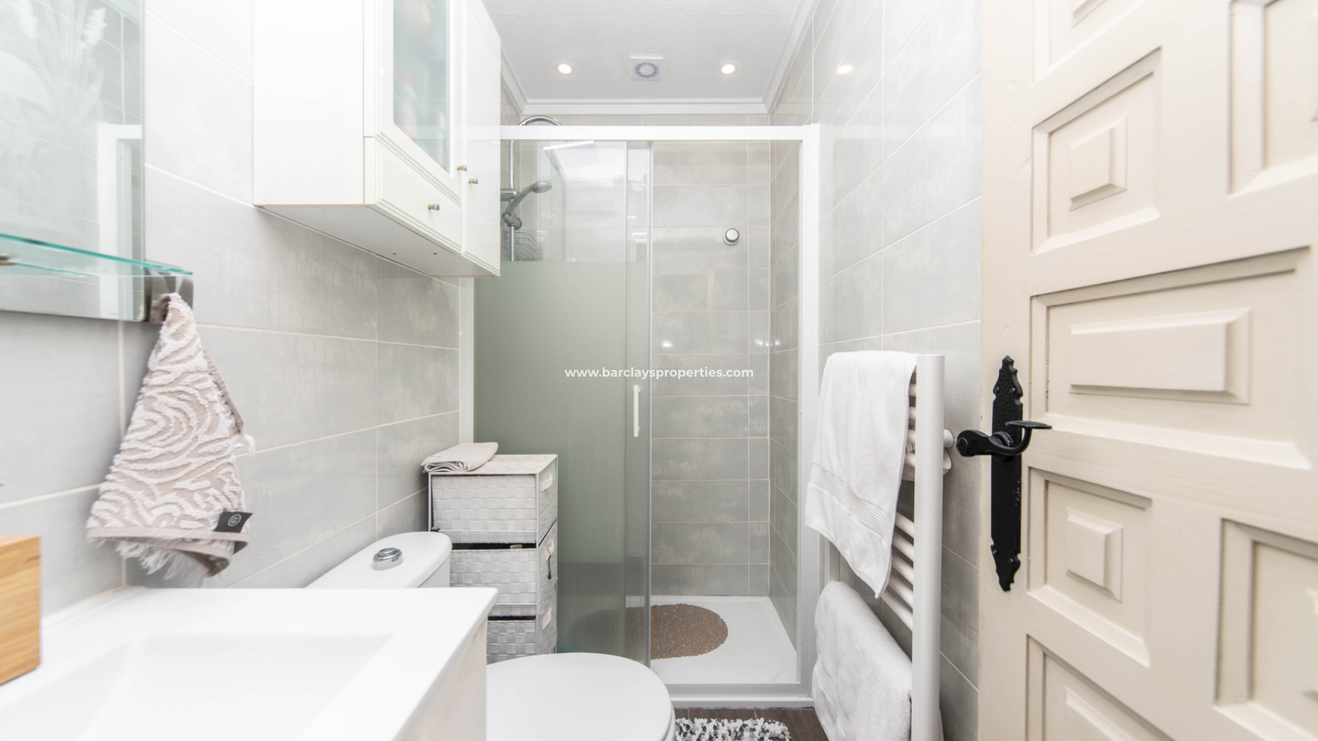 Vanuit de hal hebben we toegang tot een badkamer met douche van muur tot muur, wastafel, badmeubels, wc, elektrisch handdoekenrek en verwarming, twee slaapkamers met inbouwkasten, plafondventilatoren en airconditioning. Een van de slaapkamers wordt momenteel gebruikt als studeerkamer.