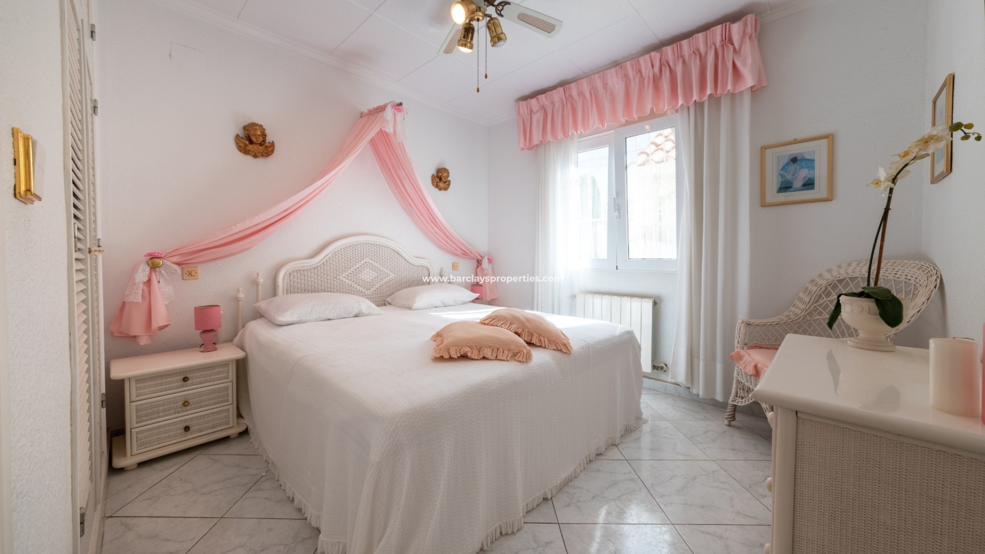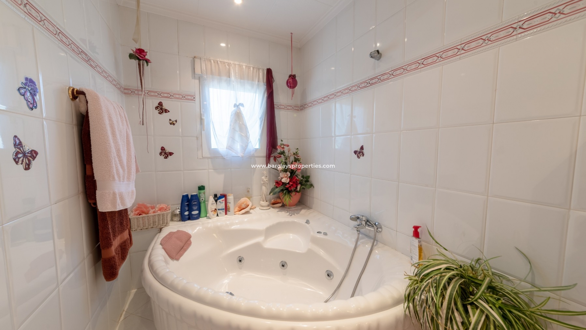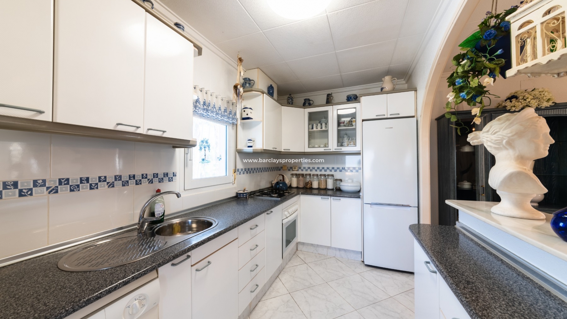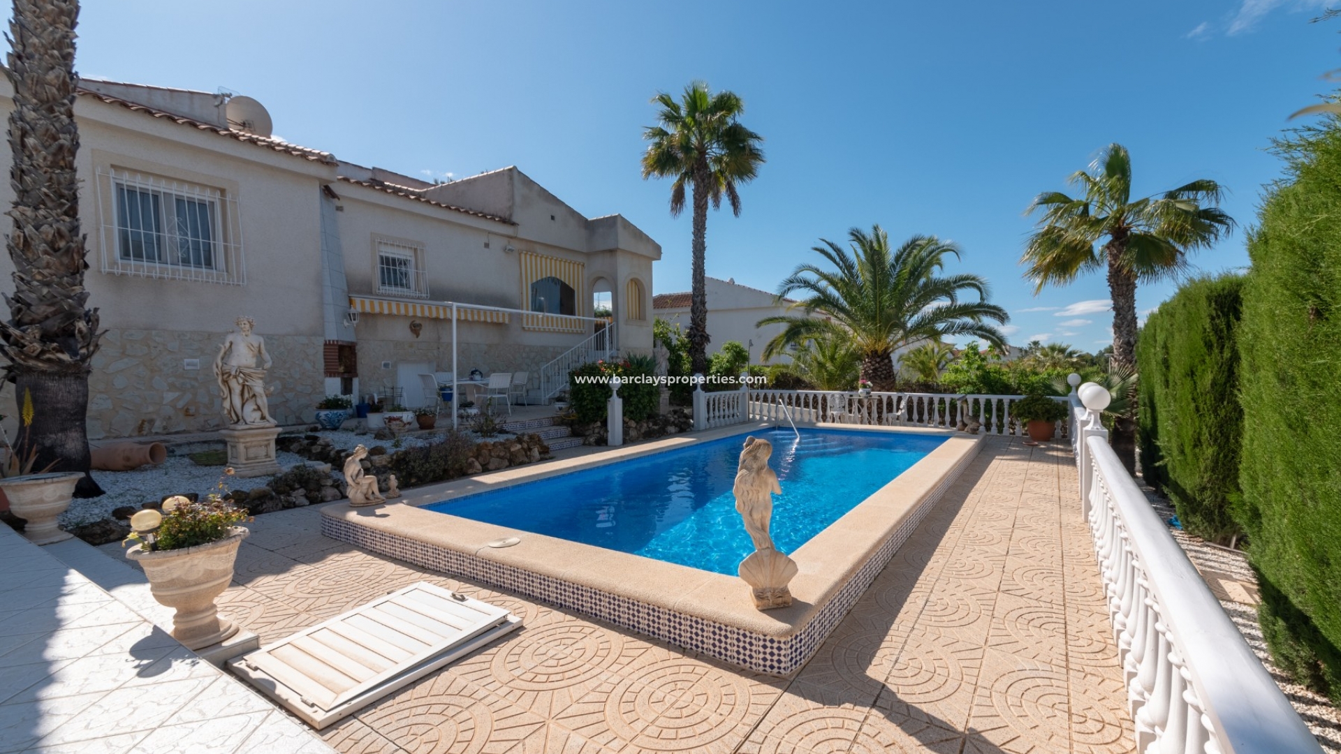 Deze prachtige woning heeft het allemaal! Het is gelegen op een toplocatie in de self-catering en multi-nationale urbanisatie van La Marina. Gelegen op een grote 800m2 hoekperceel, deze op het zuidwesten gelegen villa ligt naast twee parken en op slechts vijf minuten lopen van Consum Square waar u een grote supermarkt, diverse winkels en een scala aan bars en gemengde keuken restaurants, die live entertainment bieden tijdens de warmere maanden van het jaar te vinden. Vijf minuten in de tegenovergestelde richting brengt u naar een ander commercieel gebied, langs een groot sportcomplex met minigolf, een snookerhal en een waterpark voor kinderen op uw weg. Hier vindt u een apotheek, het gemeentehuis, een dokterspraktijk, banken, een supermarkt, samen met meer bars en restaurants. Er is ook een internationale supermarkt die zeven dagen per week open is, waar ze een verscheidenheid aan internationale producten en elke dag versgebakken brood aanbieden.