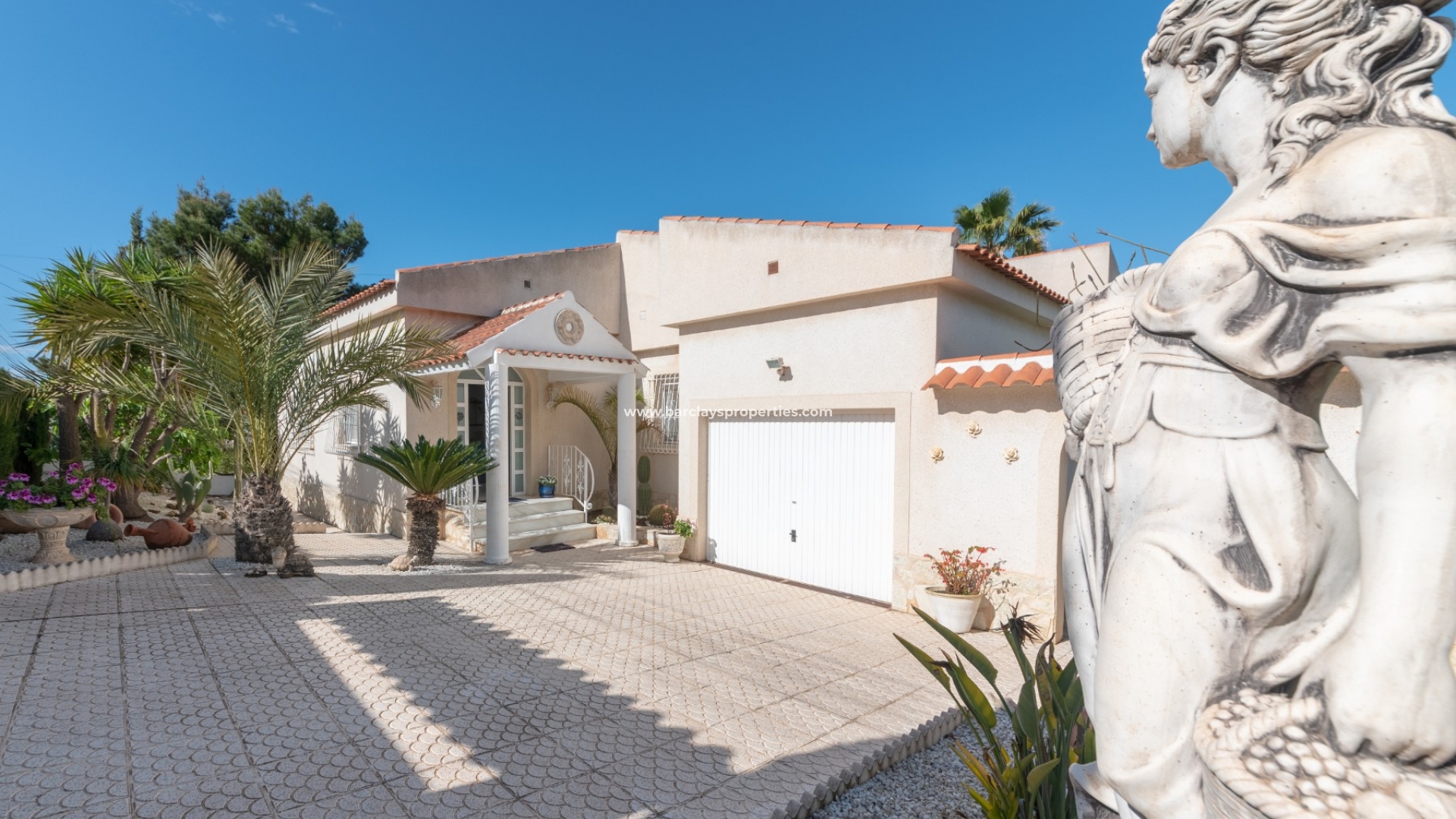 Verscholen achter grote witte buitenmuren in Andalusische stijl vindt u dit stijlvolle huis. We komen binnen in een prachtig aangelegde tuin via een grote schuifpoort, die ons leidt naar een privégarage voor off-road parking. De tuin is zowel verhard als met grind aangelegd, wat het onderhoud vergemakkelijkt, terwijl het toch een echt mediterraan paradijs blijft, dankzij de palmbomen en bloementuinen.