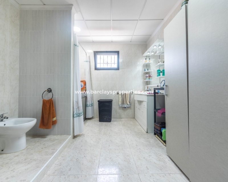 Terug binnen brengt een trap ons naar de benedenverdieping waar we een tweede woonkamer, nog twee slaapkamers, een volledig ingerichte badkamer, een grote eetkamer met een keuken en een ingebouwde BBQ, samen met een ruime berging vinden.