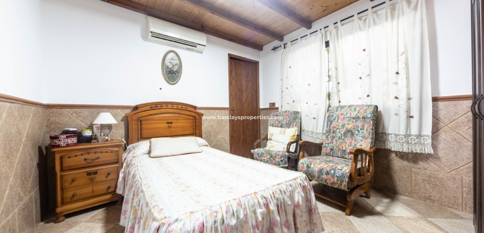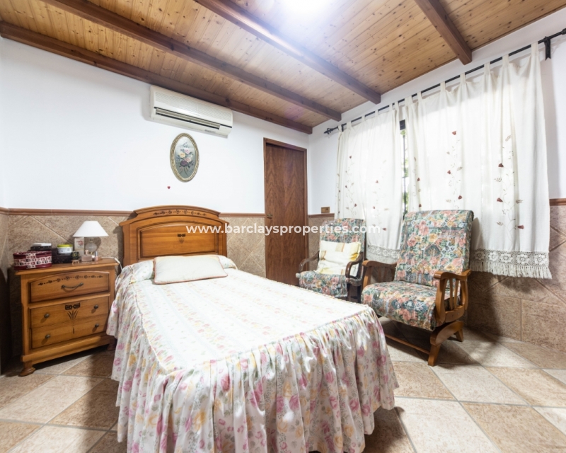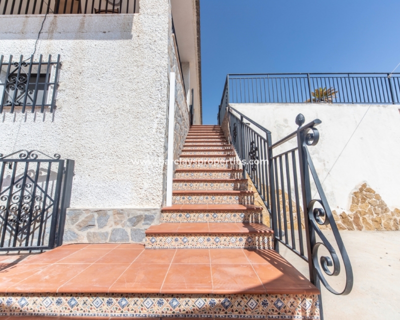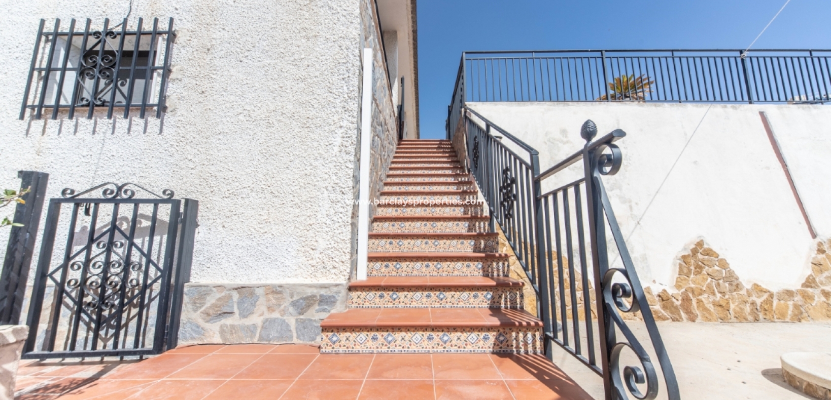 Vanaf het zwembad leidt een stijlvol betegelde trap naar de eerste verdieping waar zich vanaf het grote overdekte terras de toegang tot het hoofdgedeelte van de villa bevindt. Een lange hal met plafondspots geeft ons toegang tot vier ruime slaapkamers met grote buitenramen en rolluiken. Er is ook een ruime zit/eetkamer met een grote open haard in landelijke stijl, een volledig ingerichte badkamer met een douche van muur tot muur en een grote volledig ingerichte keuken met een aangrenzende bijkeuken. De keuken heeft een buitendeur die ons naar een verhoogd terras brengt waar zich nog een grote zithoek bevindt die bezoekers een absoluut spectaculair panoramisch uitzicht op de bergen en het platteland biedt, waar men adembenemende rode en paarse zonsondergangen en zonsopkomsten kan waarnemen. We kunnen ons geen betere omgeving voorstellen voor een diner 's avonds!