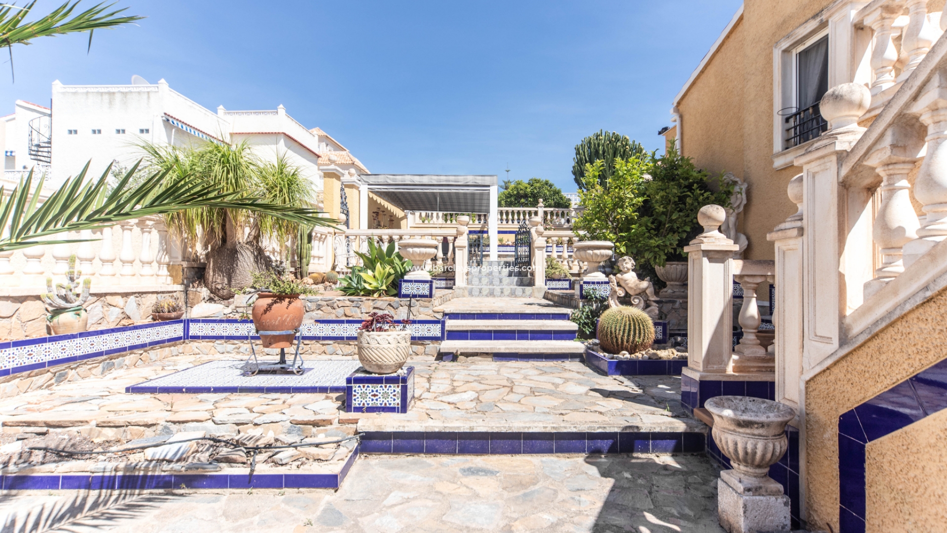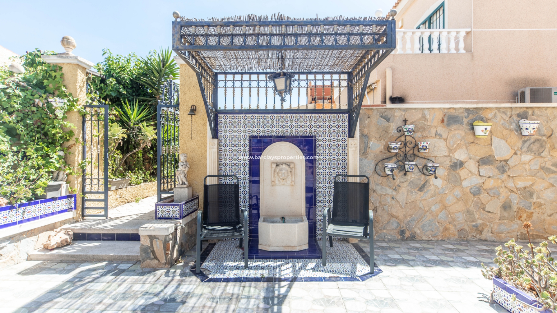 Deze op het zuidwesten gelegen woning ligt tegenover een groengebied en is toegankelijk via een zij-ingangspoort die leidt naar een schaduwrijke zithoek /gazebo, twee voetgangersingangen aan de voorzijde en een elektrische oprijpoort aan de voorzijde. We betreden de grote tuin om vele zitjes te vinden, perfect om te genieten van het warme, zonnige Spaanse klimaat, bijna 325 dagen per jaar! Het huis biedt parkeergelegenheid in de verharde tuin, buitenverlichting en een buitenwateraansluiting.
