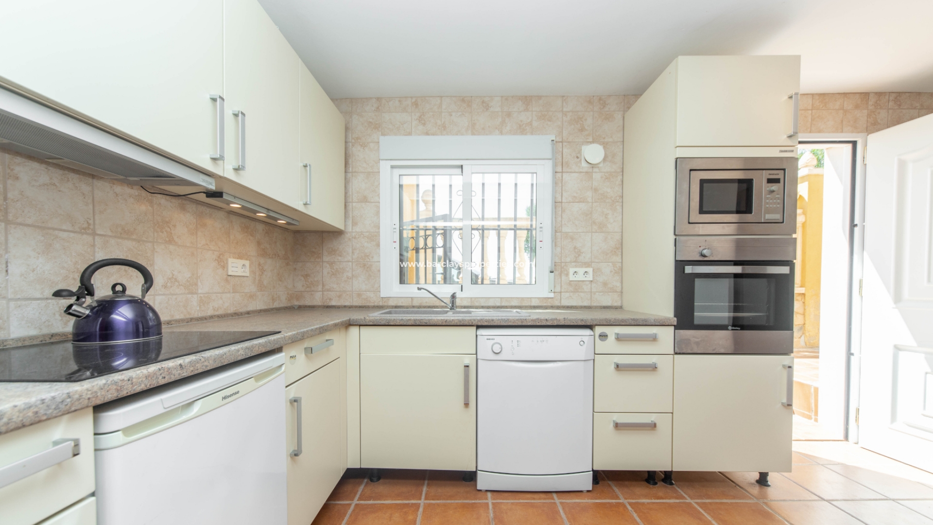 Een glazen serre geeft toegang tot het interieur van het pand en de lichte en luchtige woonkamer met airconditioning die leidt naar een onafhankelijke ingerichte keuken met een granieten werkblad, kookplaat, oven, koelkast / vriezer, magnetron en afzuigkap die leidt naar een eetkamer met bijkeuken en prachtig uitzicht op de bergen. Vanuit de eetkamer hebben we toegang tot een privé zonneterras en het fantastische solarium met adembenemend ononderbroken uitzicht op de bergen en de meest verbazingwekkende zonsondergangen. Een trap leidt naar beneden naar de tuin van waaruit de onderbouw kan worden bereikt.