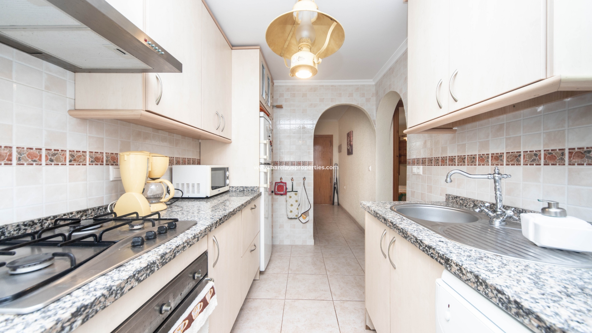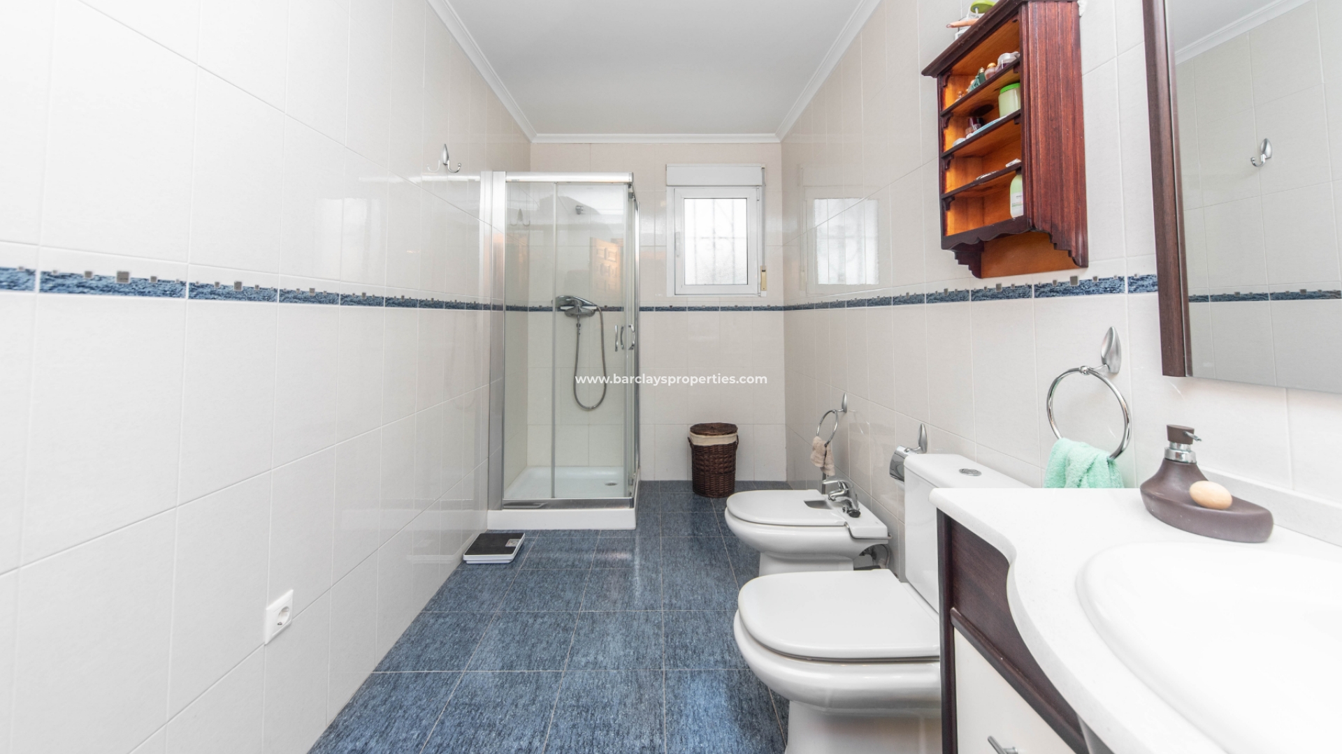 Binnen is de woonkamer uitgebreid met een ruime eethoek om voldoende ruimte te bieden voor ontspanning en gezelligheid. De kamer is versierd met een charmant houtvuur, dat een gezellige sfeer creëert tijdens de koelere maanden. Bovendien zorgt de airconditioning het hele jaar door voor optimaal comfort, zodat u de temperatuur naar wens kunt aanpassen. Vanuit het woongedeelte vinden we de onafhankelijke inbouwkeuken die is uitgerust met nieuwe eenheden en veel opbergruimte biedt. De keuken heeft ook een stijlvol marmeren werkblad, wat een vleugje verfijning geeft. Vanuit de hal vinden we 3 ruime slaapkamers en een grote badkamer met hoekdouche, wastafel en wc en bidet.