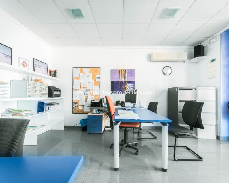 De begane grond beschikt over een kantoorruimte met, een goed uitgeruste keuken met opslag en een badkamer, die gemak en functionaliteit biedt voor zowel werknemers als klanten. De bovenverdieping bestaat uit twee afzonderlijke, grote kantoorruimten, die voor verschillende doeleinden kunnen worden gebruikt of eventueel afzonderlijk kunnen worden verhuurd, wat extra inkomsten oplevert.