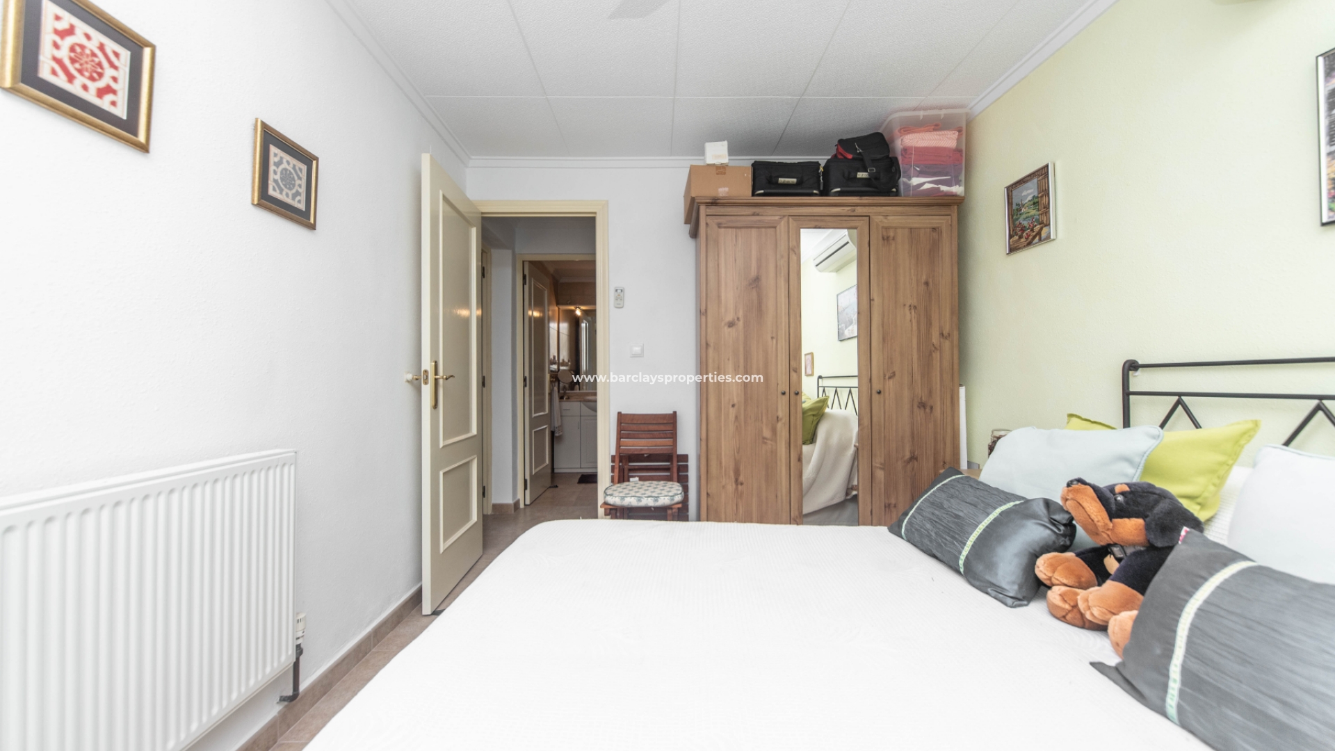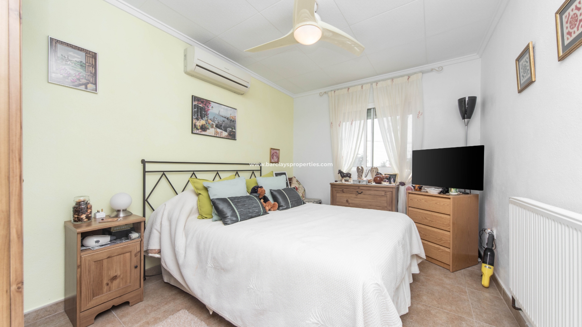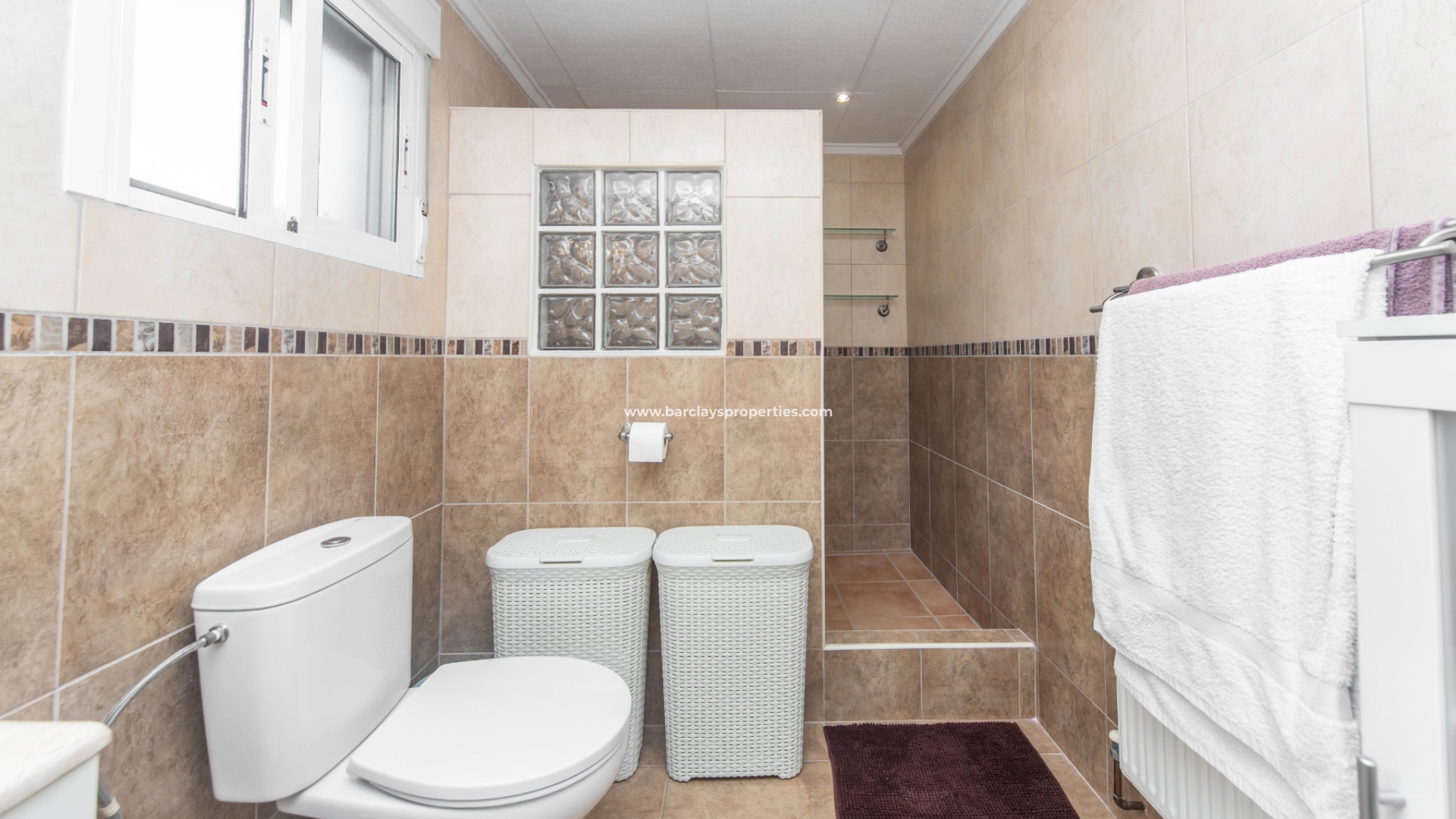 Naast de eetkamer, woonkamer en keuken bevindt zich op de begane grond een washok met een doorgang die gemakkelijk kan worden gebruikt als een studeerkamer. Van hieruit leiden de trappen naar de eerste verdieping, waar zich twee tweepersoonsslaapkamers bevinden, voorzien van airconditioning en plafondventilatoren, en een extra grote familiebadkamer met ruime inloopdouche. Een van de slaapkamers heeft toegang tot een privézonneterras met een zithoek buiten, compleet met zonnescherm.