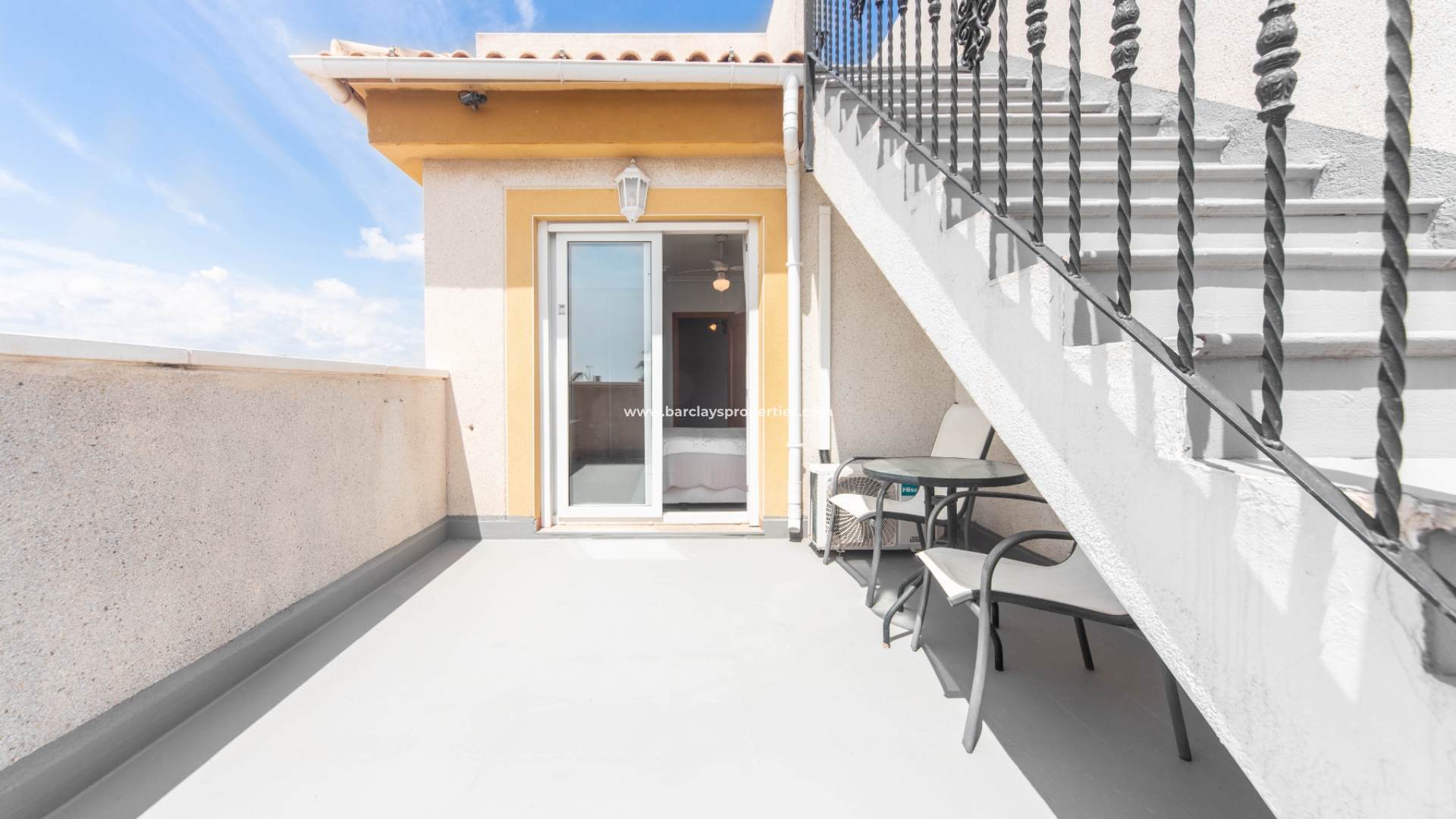 Granieten trappen leiden ons naar de eerste verdieping, waar we vanaf de overloop toegang hebben tot een familiebadkamer met bad/douche en een slaapkamer met inbouwkasten, airconditioning, een plafondventilator en toegang tot een zonneterras. Vanaf daar vinden we trappen die leiden naar het dakterras, dat een prachtig uitzicht biedt op de omliggende bergen en het platteland, waardoor een vredige toevluchtsoord ontstaat en de mogelijkheid om te genieten van de natuurlijke schoonheid van het gebied.