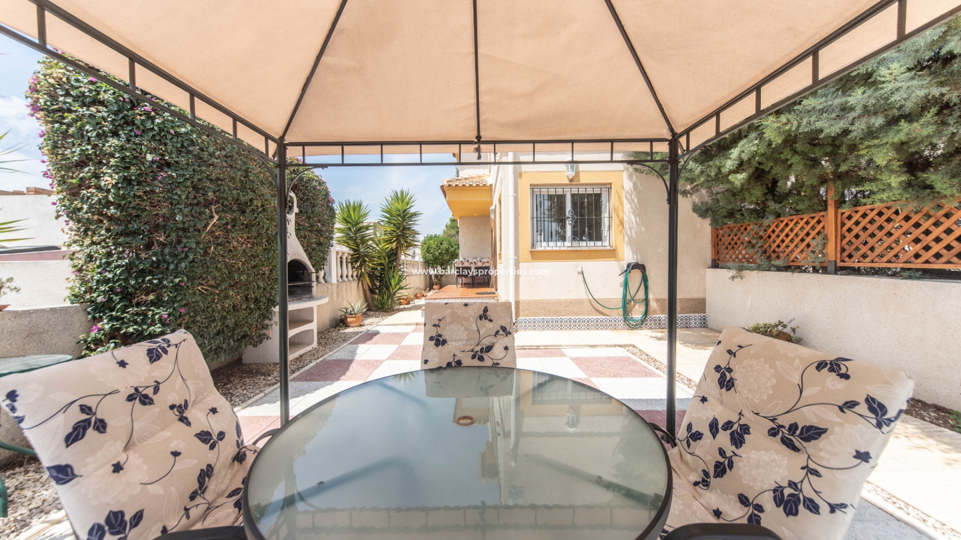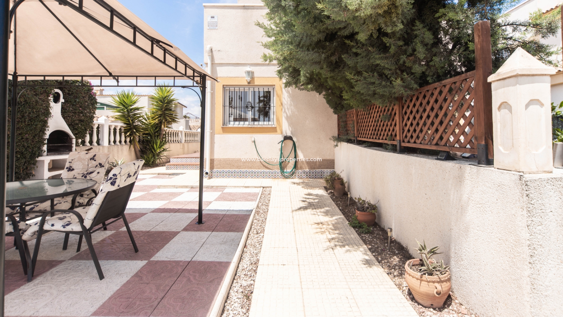 De tuin van de woning is groot met voldoende ruimte voor een zwembad en beschikt over een barbecuegedeelte, perfect voor buitenbijeenkomsten en het vermaken van gasten. Het perceel is vlak en verhard, waardoor een onderhoudsarme buitenruimte wordt geboden met off-road parkeren, een schaduwrijke eethoek en veel zonnige en schaduwrijke plekken om te genieten van het buitenleven. De tuin kijkt uit op een prachtig groen dennenbos, waardoor een aangenaam uitzicht en een gevoel van natuurlijke sereniteit ontstaat, met prachtige vogelgeluiden die dagelijks te horen zijn.