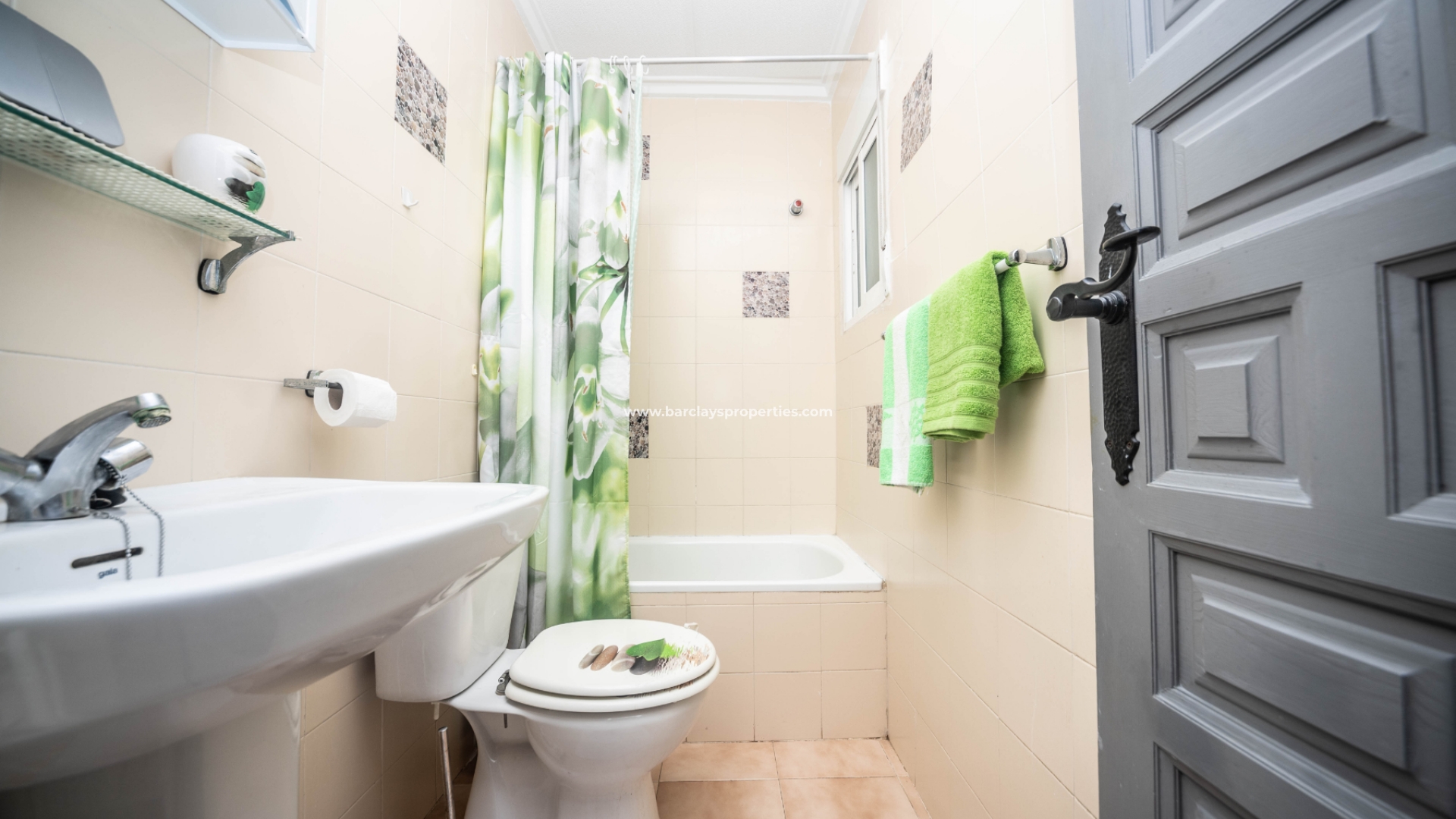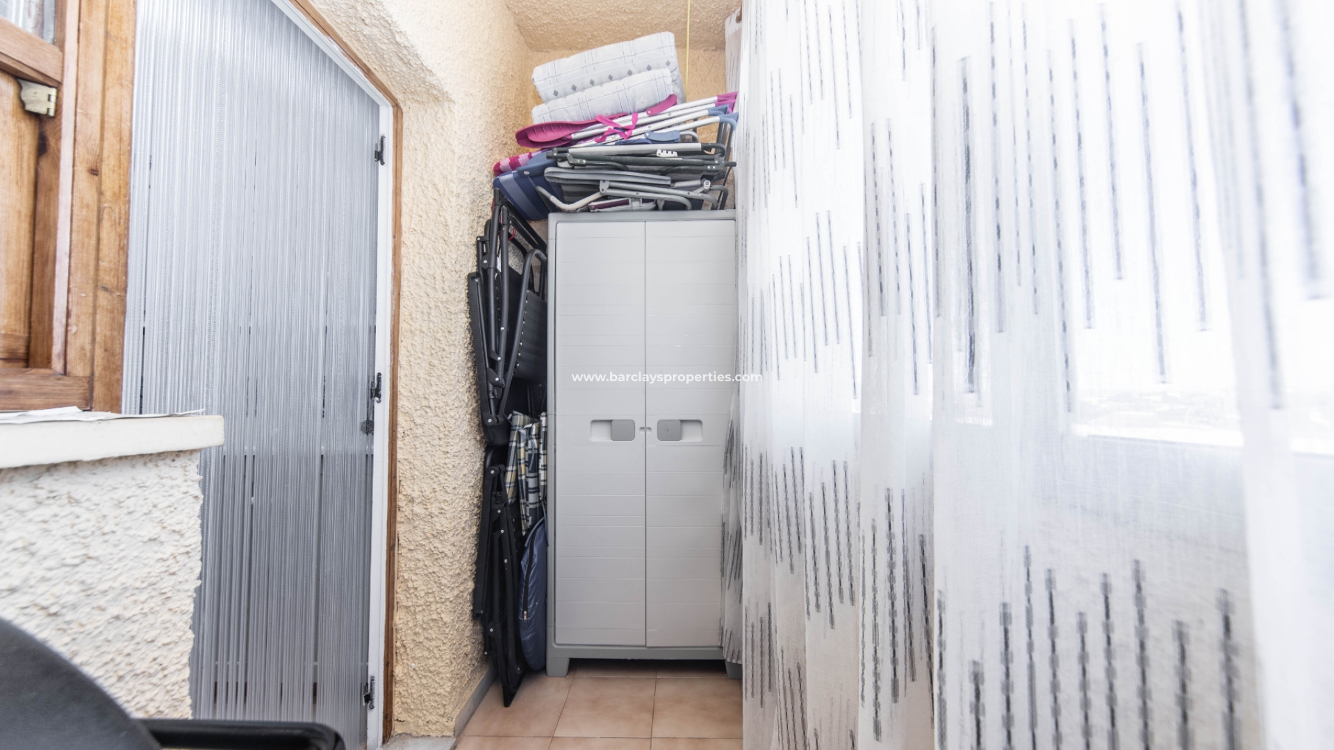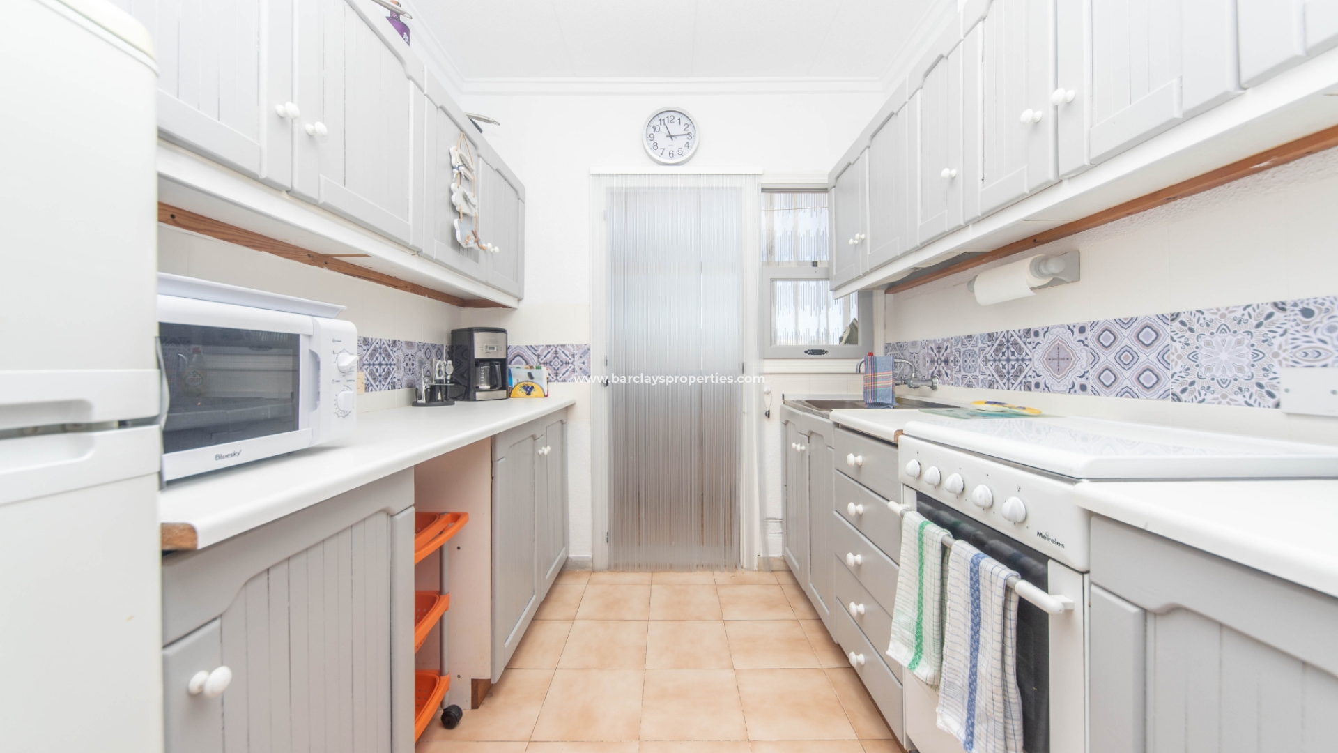 Het pand heeft een aparte keuken met stijlvolle grijze en witte eenheden, wat een eigentijdse touch geeft. Een bijkeuken is beschikbaar waar de boiler en een wasmachine staan, wat gemak en functionaliteit biedt. Vanuit de gang zijn er twee slaapkamers met inbouwkasten (één van de kamers heeft een plafondventilator). De badkamer in deze "Lola" biedt een bad/douche, wc en wastafel.