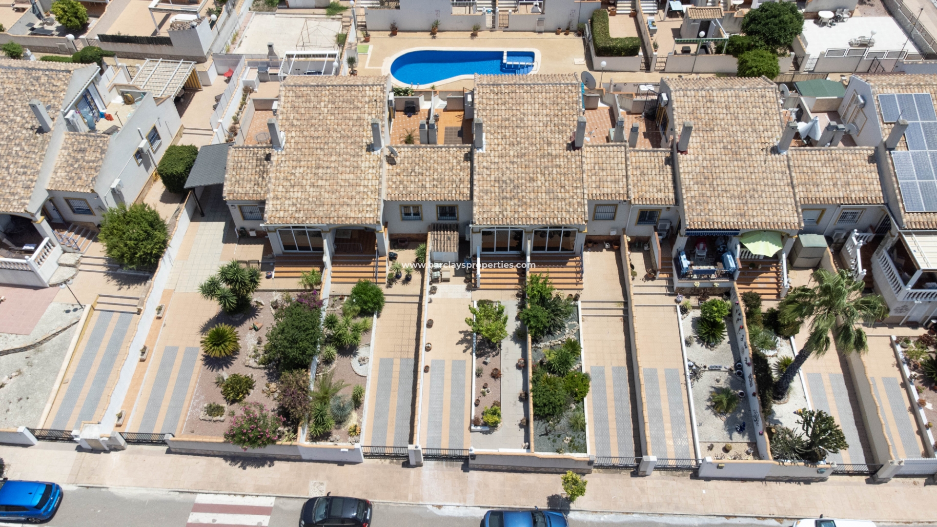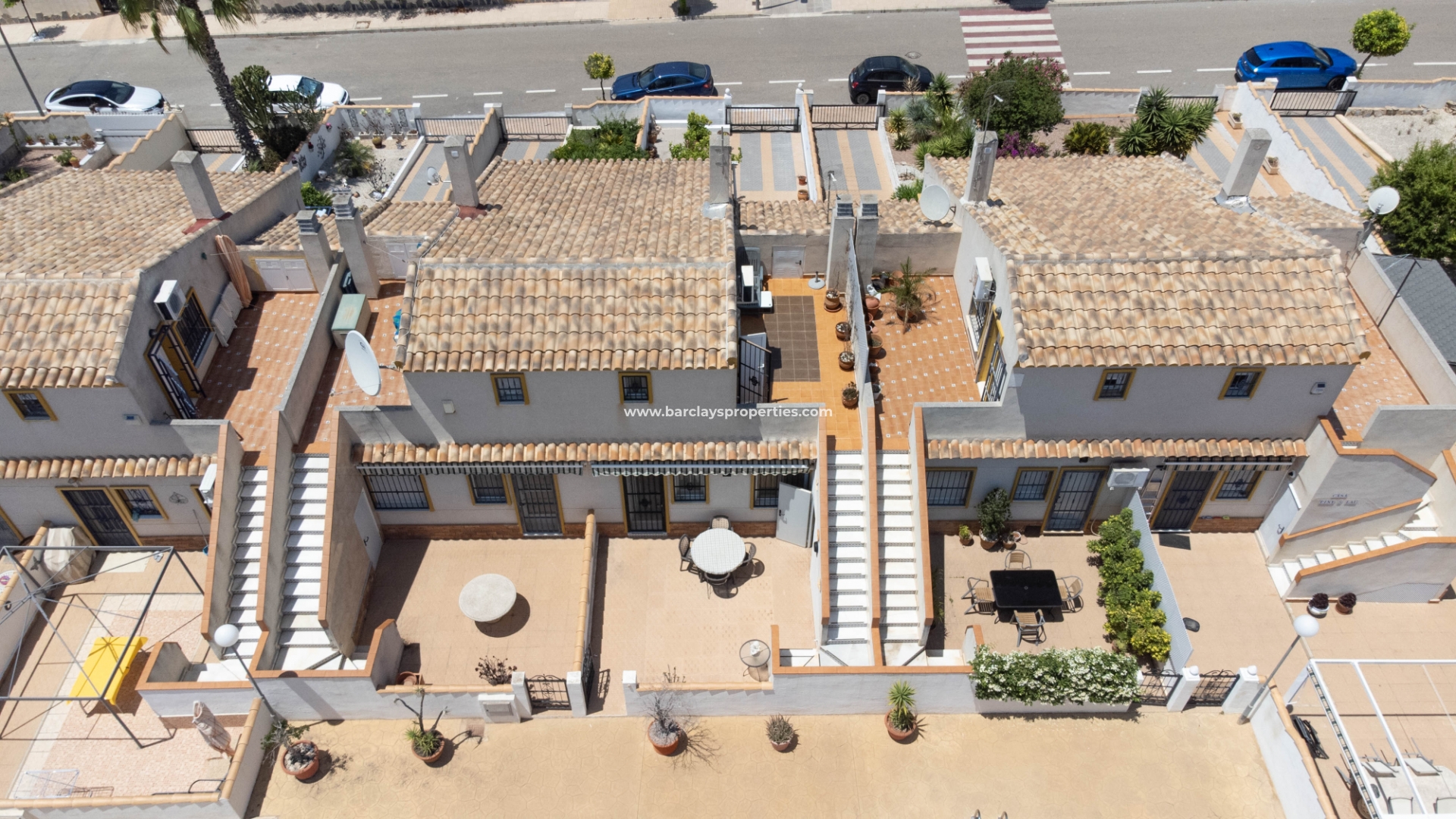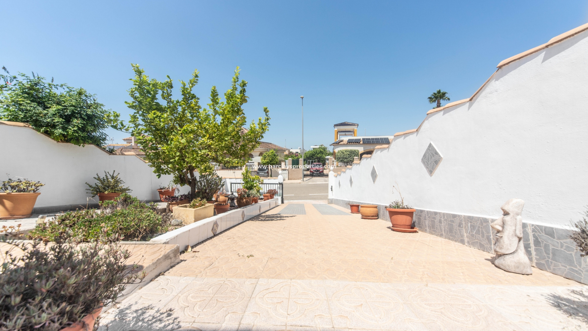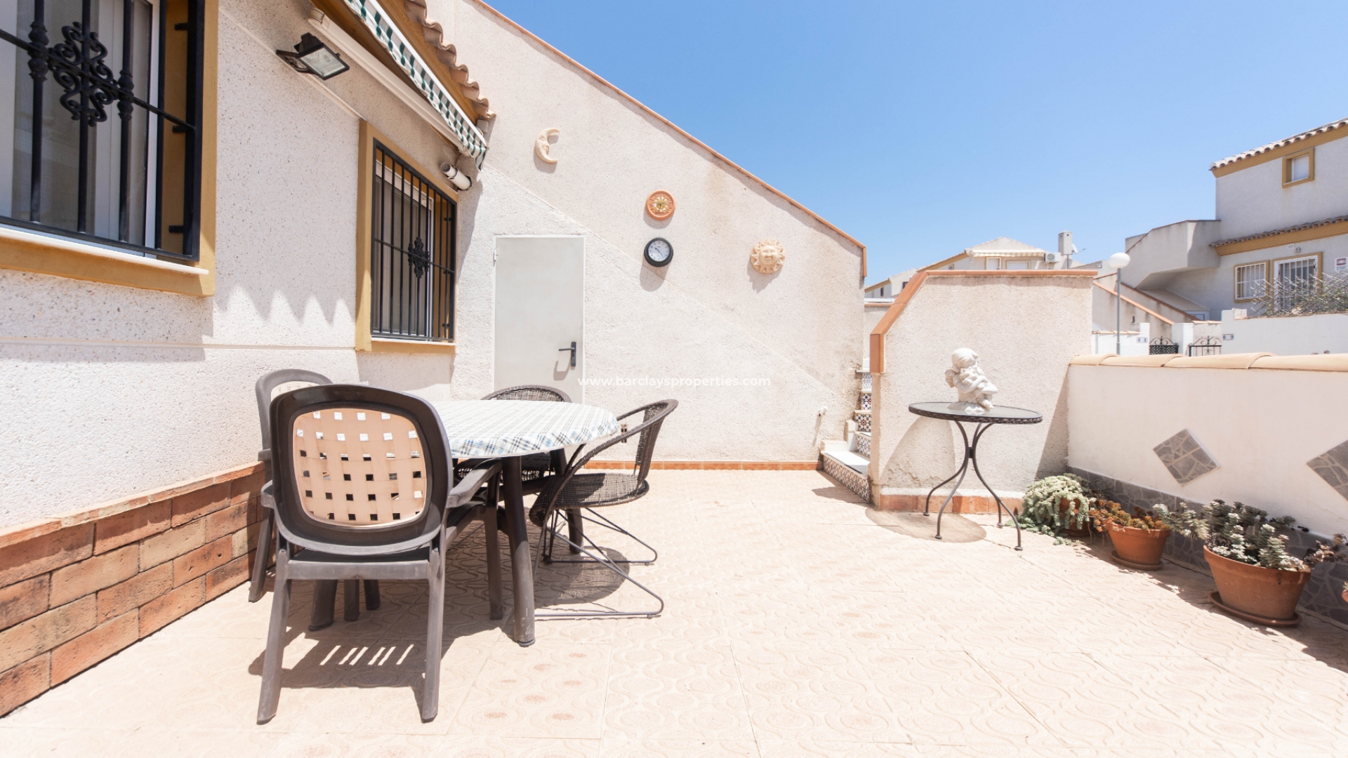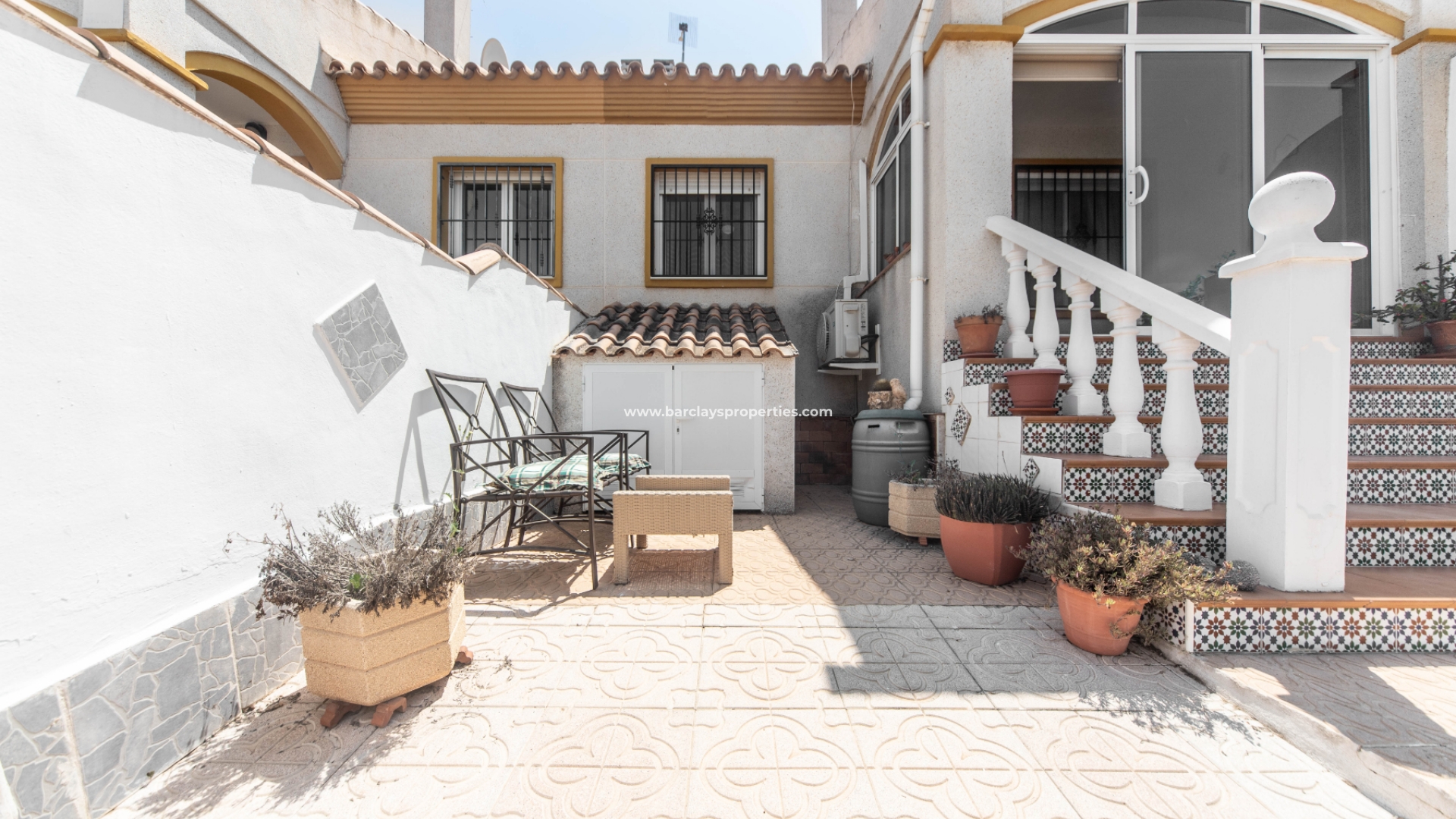 Deze charmante tussenwoning biedt een heerlijke woonervaring met verschillende wenselijke kenmerken. De mooie tuin is bestraat en voorzien van diverse planten, struiken en citroenbomen, en biedt ook parkeergelegenheid naast de weg. Trapjes leiden naar een glazen voorporch die ons naar het interieur van de woning brengt en naar de ruime, lichte woonkamer met een wandgemonteerde elektrische open haard en een plafondventilator.