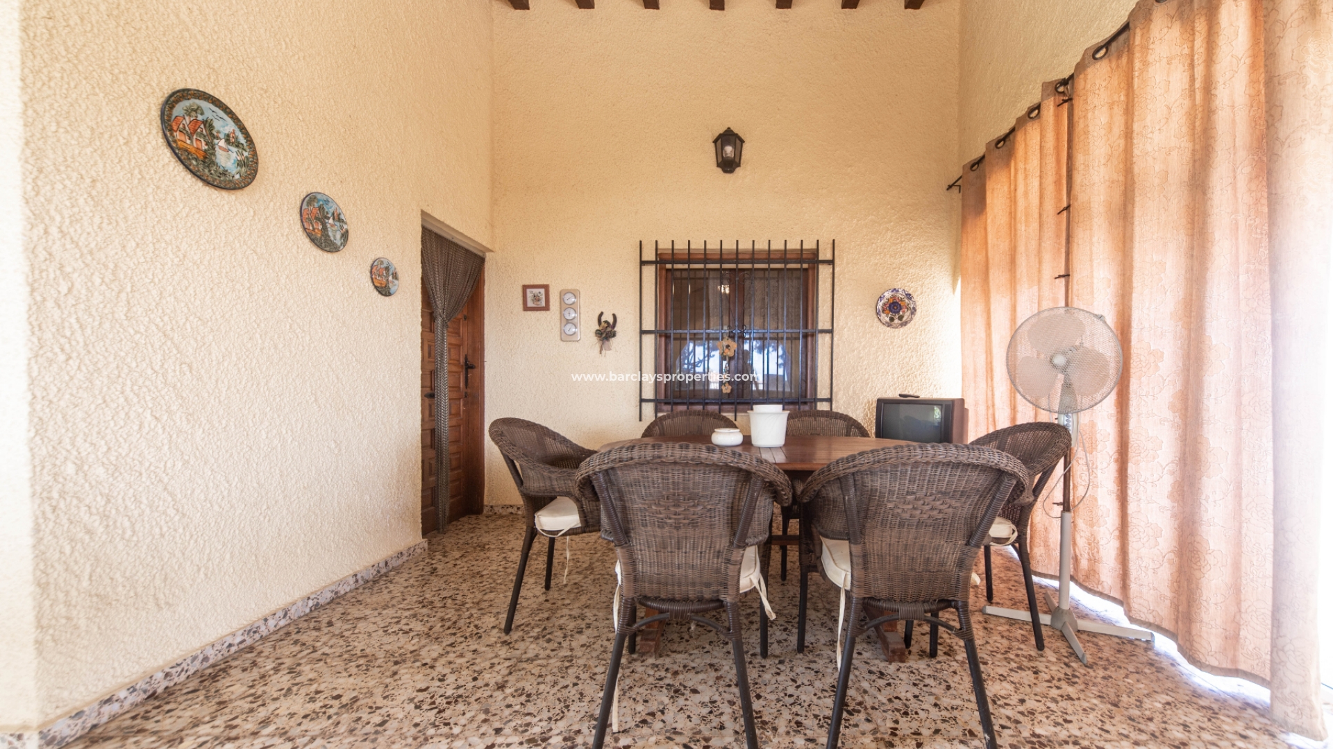 Bij het betreden van het pand wordt u verwelkomd door een ruime overdekte veranda met een kenmerkend dak van houten balken en comfortabele zitgedeeltes. Deze heerlijke ruimte is perfect om te ontspannen, gasten te ontvangen of gewoon te genieten van de aangename omgeving.