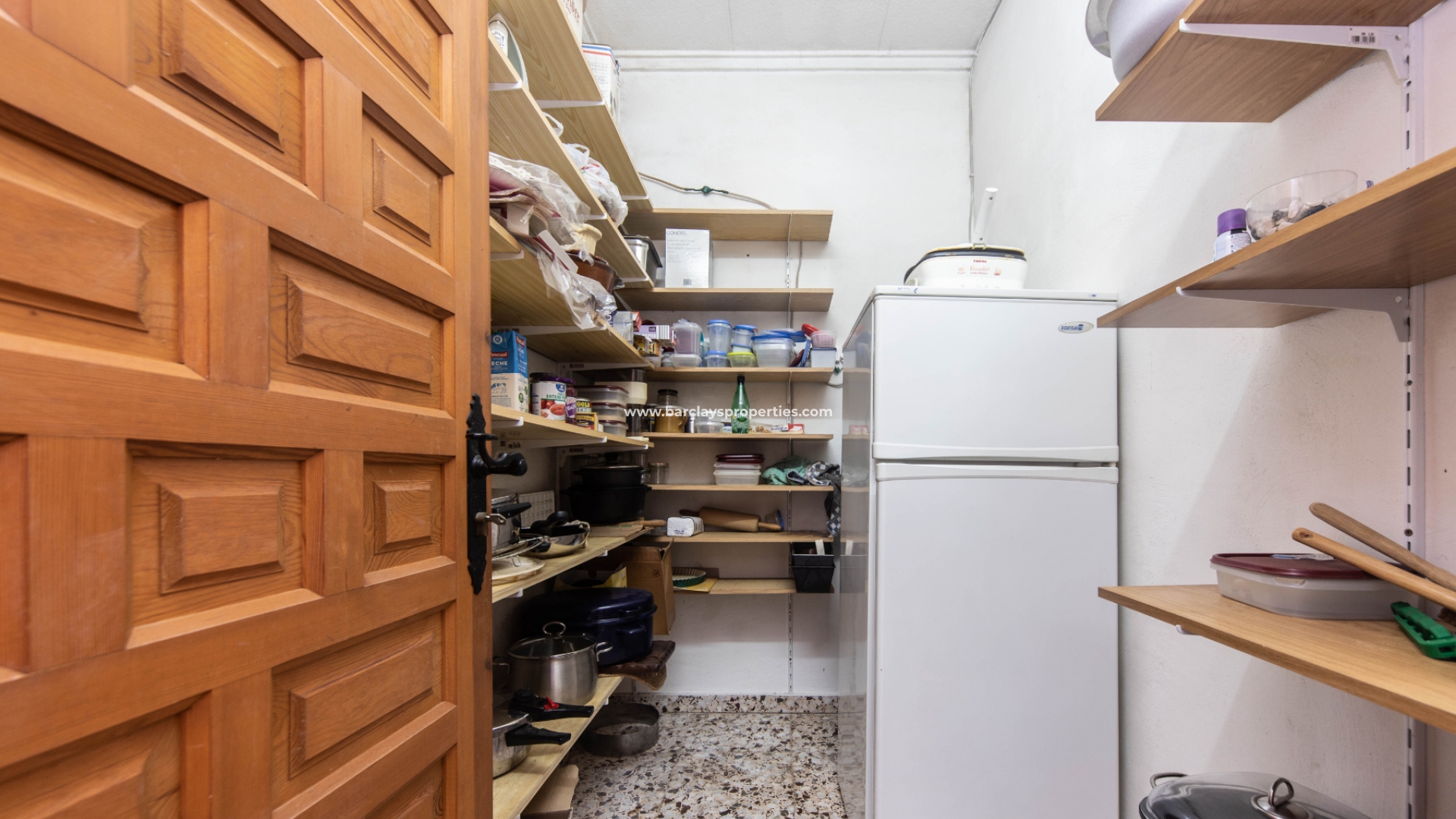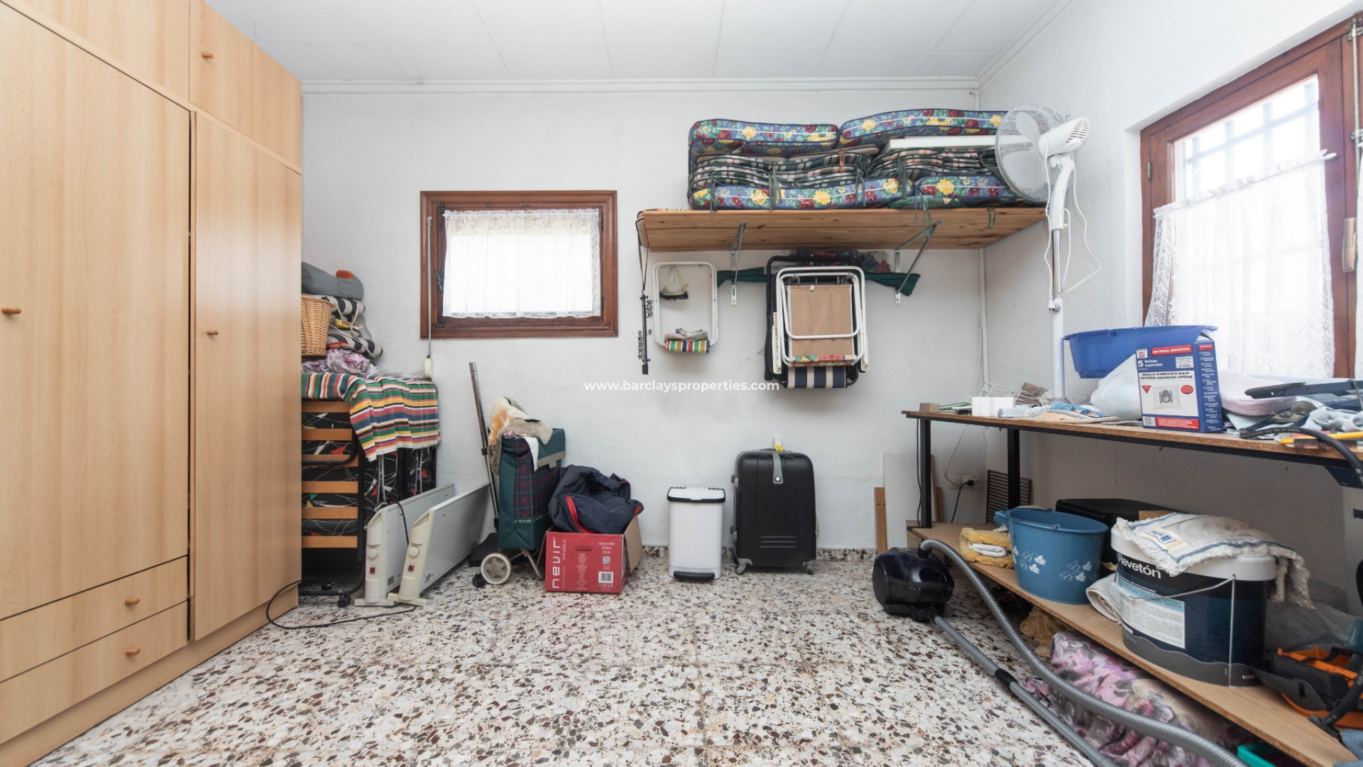 Naast de leefruimtes wordt de derde slaapkamer momenteel gebruikt als aparte eetkamer, wat een toegewijde ruimte biedt voor formele maaltijden of intieme bijeenkomsten. Een grote berging met ruime opbergkast staat tot uw beschikking en biedt flexibiliteit, zodat het kan worden gebruikt naar individuele voorkeuren en levensstijlvereisten. De berging heeft een toegangsdeur naar de tuin.