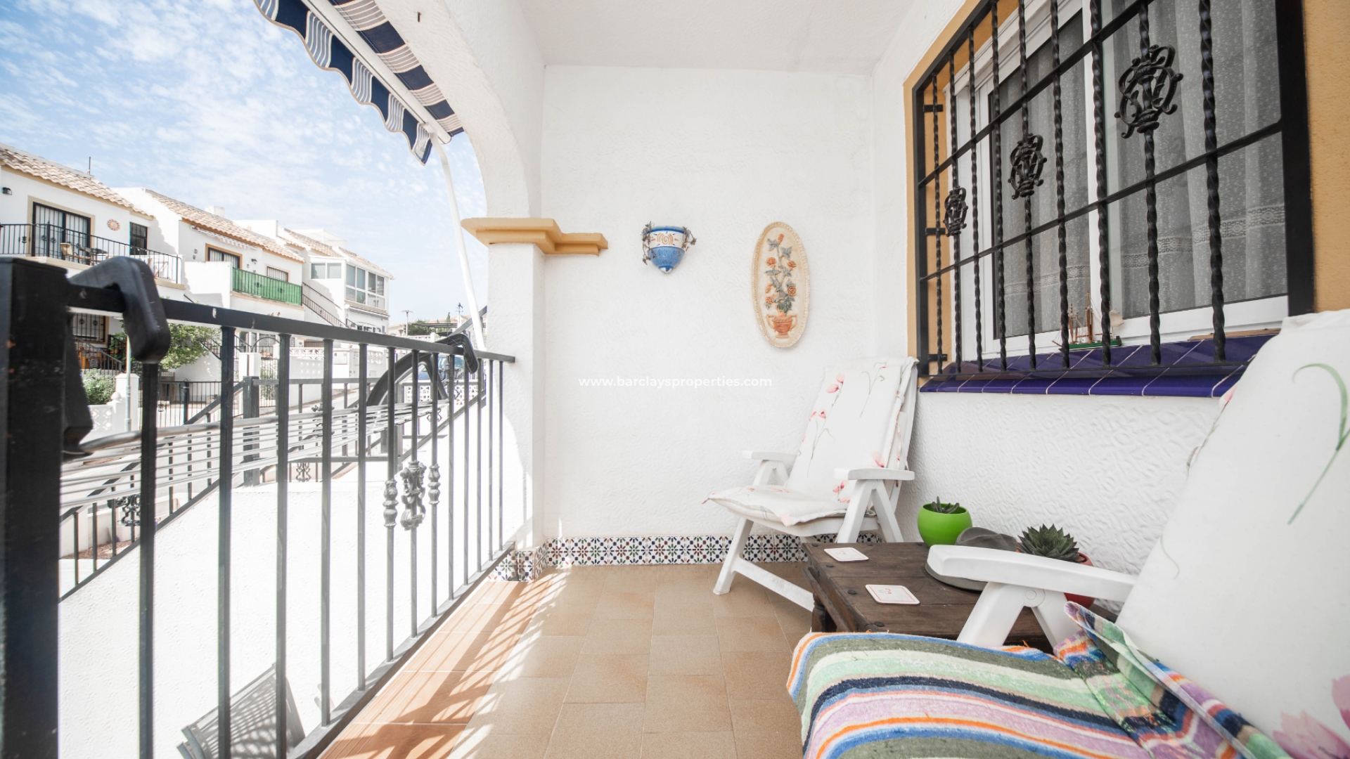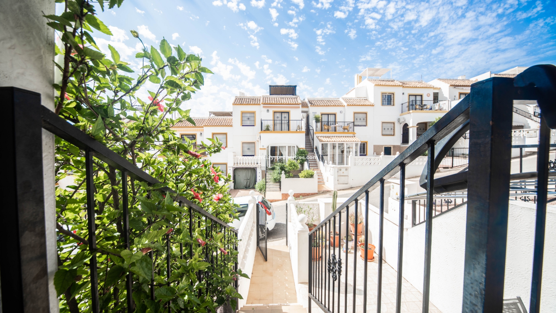 Bij het naderen van het appartement zult u merken dat de tuin volledig is bestraat en een onderhoudsarme buitenruimte biedt. De woning profiteert ook van een aparte ingang voor voertuigen, waardoor gemakkelijk off-road parkeren mogelijk is. Via de trap bereikt u een uitnodigende veranda met een zitgedeelte, ideaal om te ontspannen en van de frisse lucht te genieten.