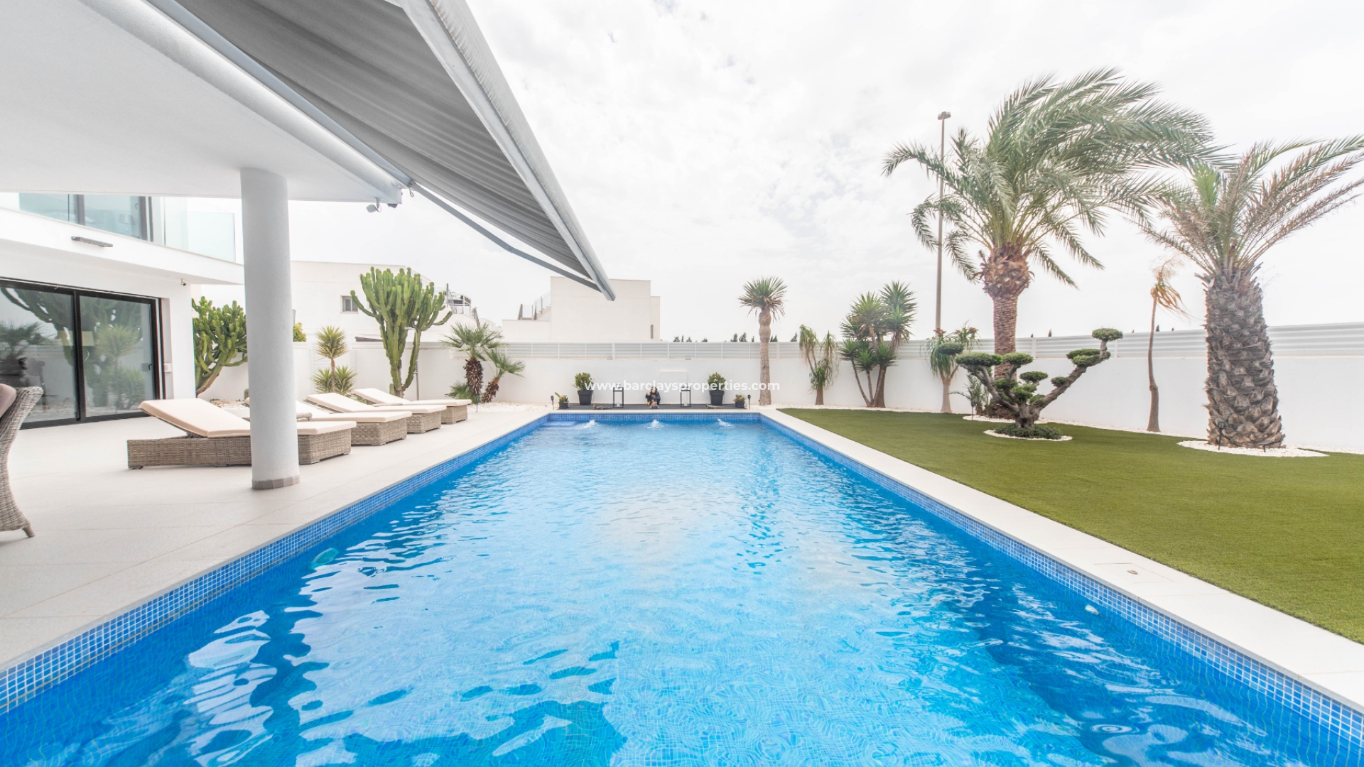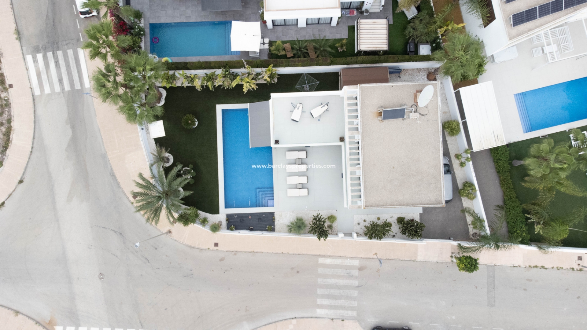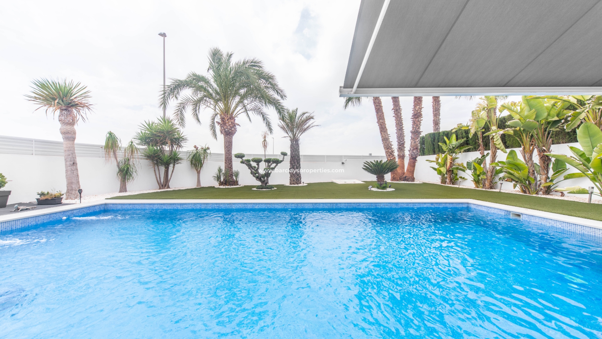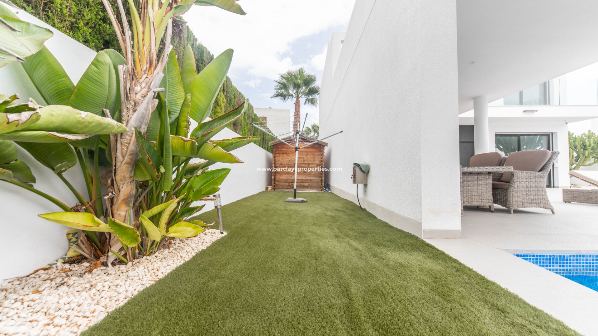 Het intercomsysteem, het voetgangershek en de brede oprit bieden toegang tot de tuin met parkeergelegenheid buiten de weg, met twee ruime parkeerplaatsen, een tuinhuisje dat ideaal is voor opslag, het ➡️ prachtige privézwembad met moderne buitendouche en een fraaie nieuwe tuinindeling met modern tegelwerk, kunstgrasgedeeltes met planten en bomen, en vele schaduwrijke en zonnige plekken om buiten te zitten, te dineren en te zonnebaden. Hier kun je heerlijk ontspannen en genieten van het buitenleven, met 325 zonnige dagen per jaar.