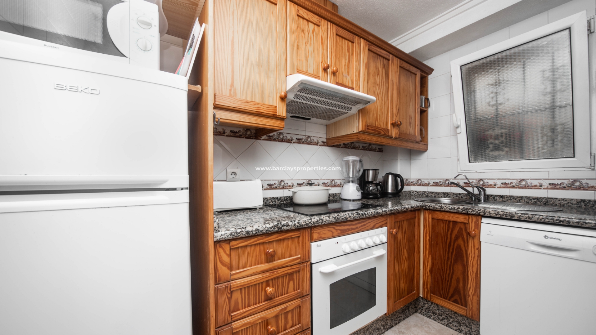 De keuken is goed uitgerust met moderne voorzieningen, waaronder een koelkast, vaatwasser, magnetron en een handige ontbijtbar, waardoor het bereiden van maaltijden een plezier is. De begane grond biedt een ruime slaapkamer met zowel airconditioning als een plafondventilator, voor comfort in elk seizoen. De badkamer op dit niveau is voorzien van een douche, toilet en wastafel, ontworpen met praktisch gebruik en stijl in gedachten.