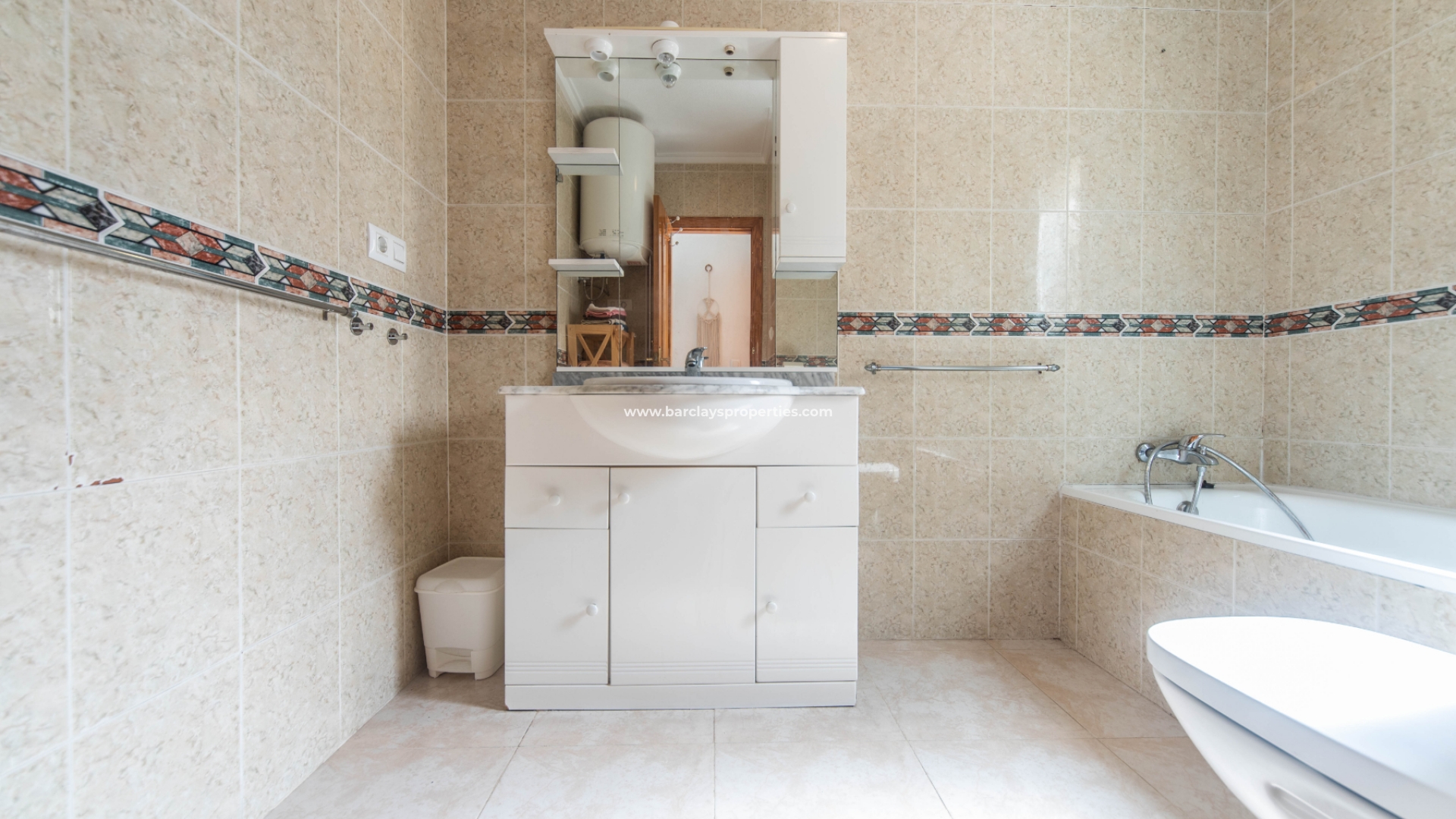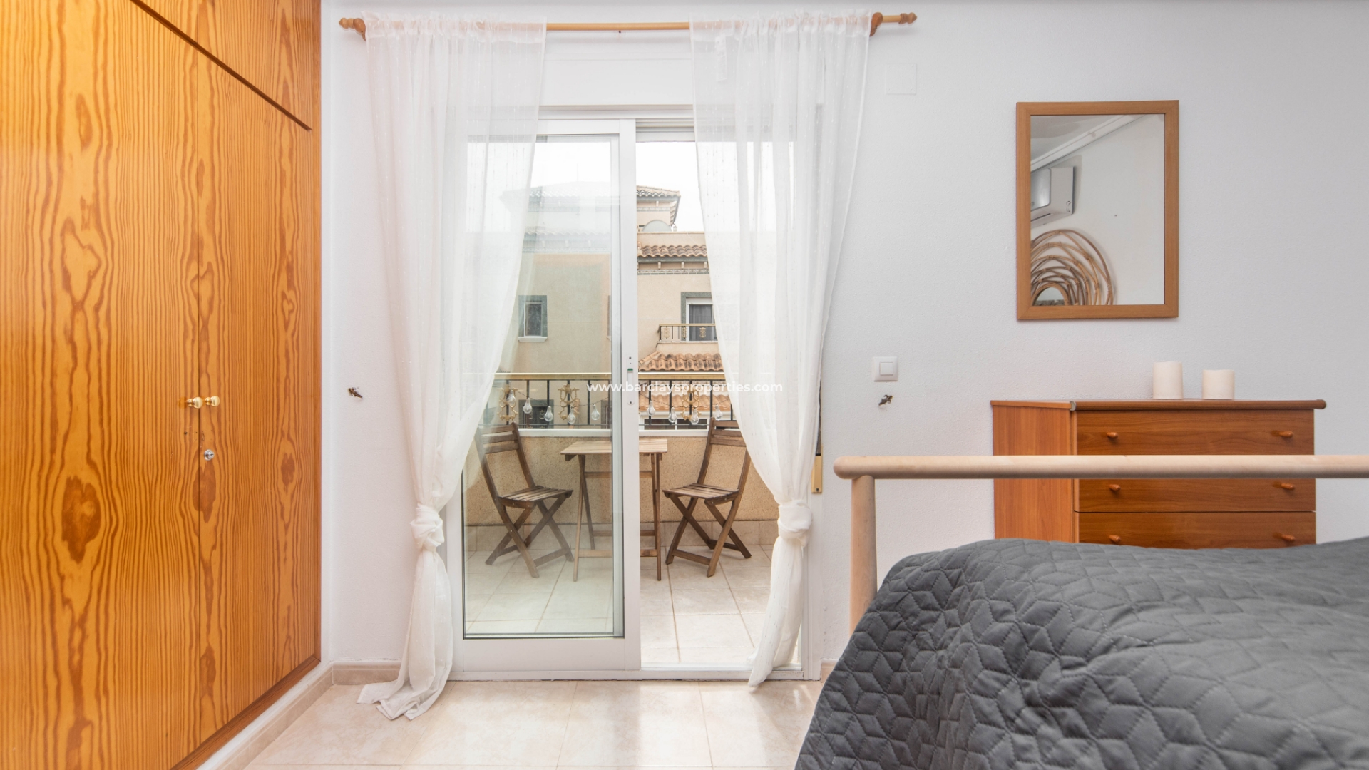 Als we naar de eerste verdieping gaan, vind je twee slaapkamers, versierd met inbouwkasten en uitgerust met airconditioning om je koel te houden tijdens warme dagen. De grotere tweepersoonskamer biedt betoverend uitzicht op het zuiden van het zwembadgebied, wat een extra vleugje rust aan je leefruimte toevoegt. De tweede badkamer op deze verdieping is voorzien van een groot bad, wastafel en toilet, die aan al je behoeften voldoet.
