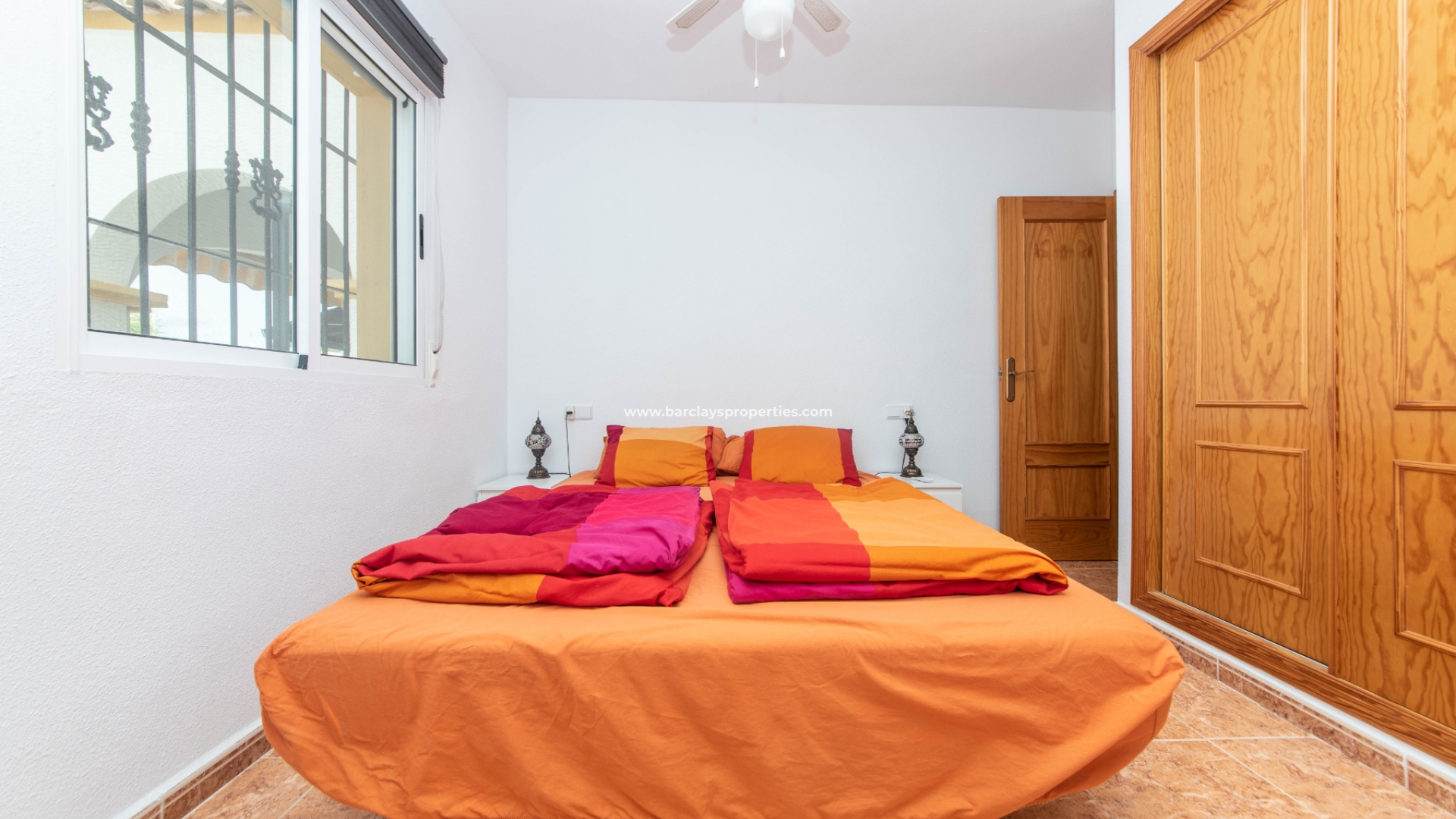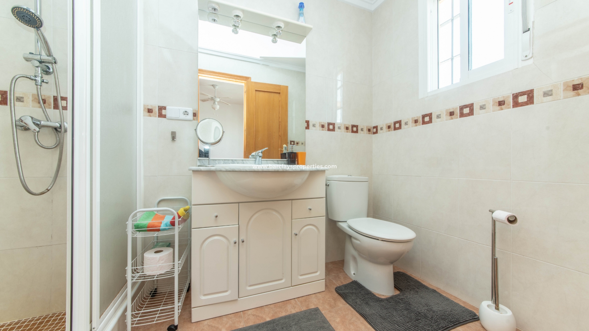 De hoofdslaapkamer is uitgerust met inbouwkasten, een plafondventilator en airconditioning. Een eigen badkamer biedt een inloopdouche, toilet en wastafelmeubel, voor zowel gemak als luxe.