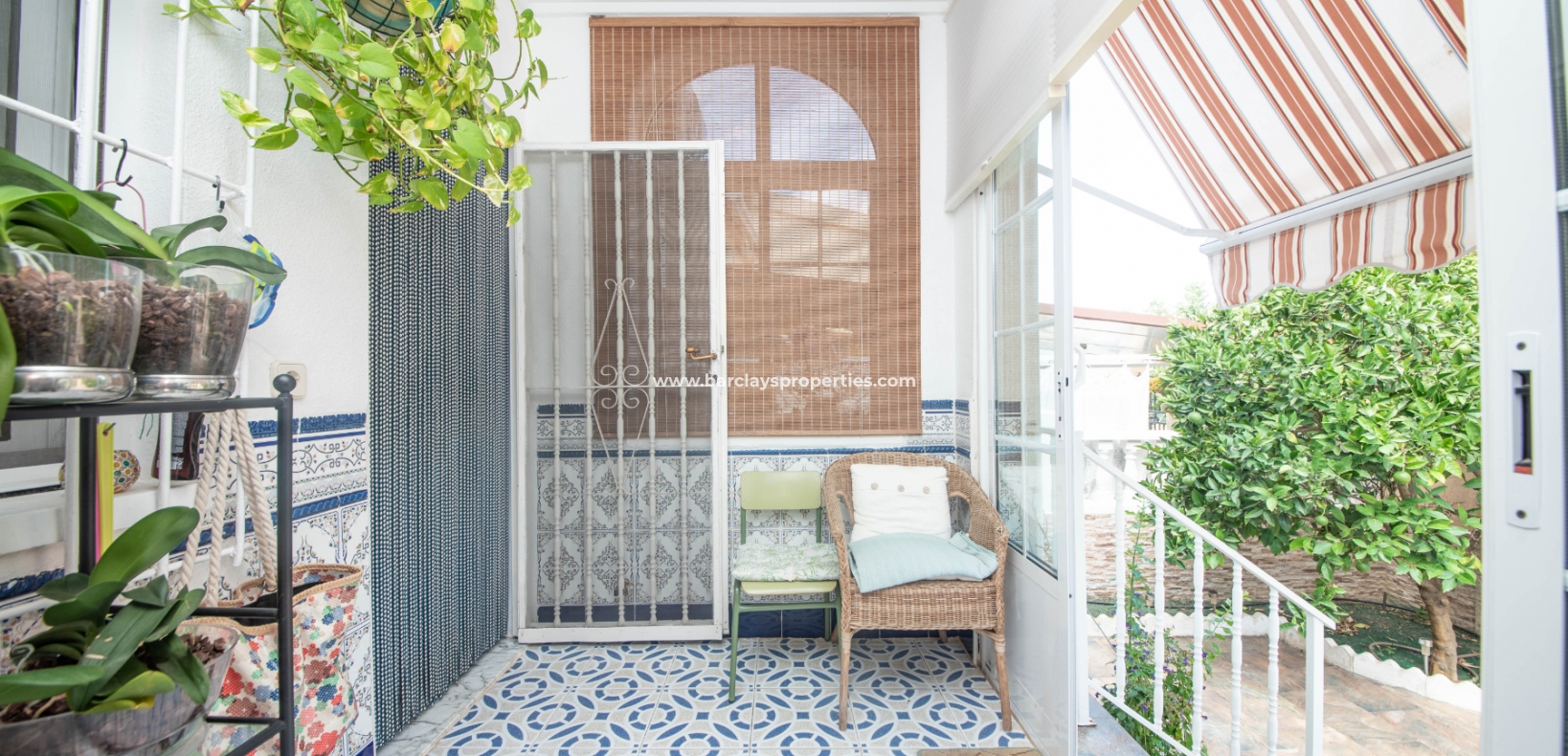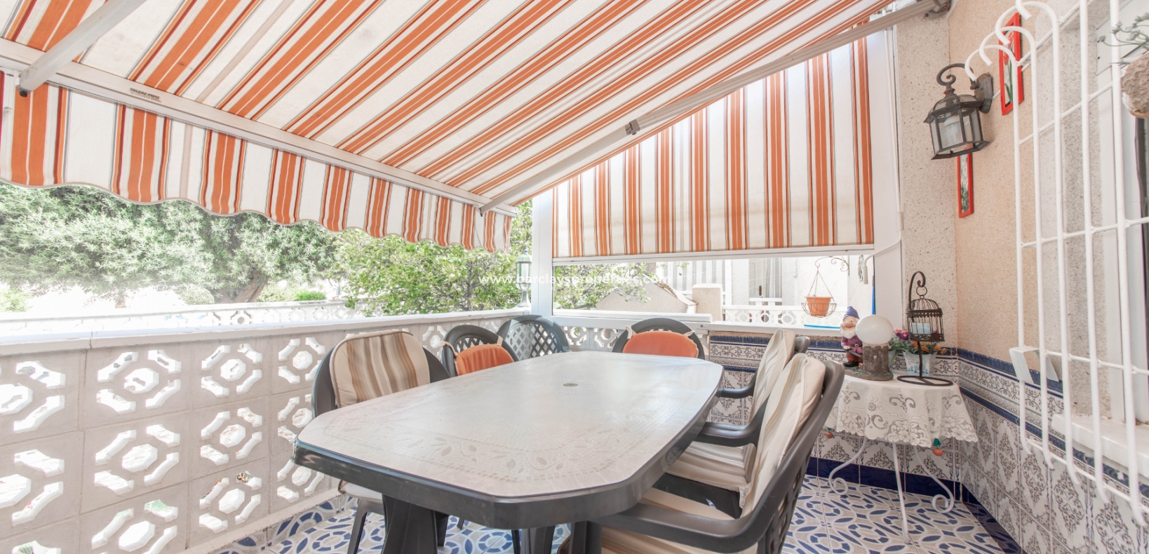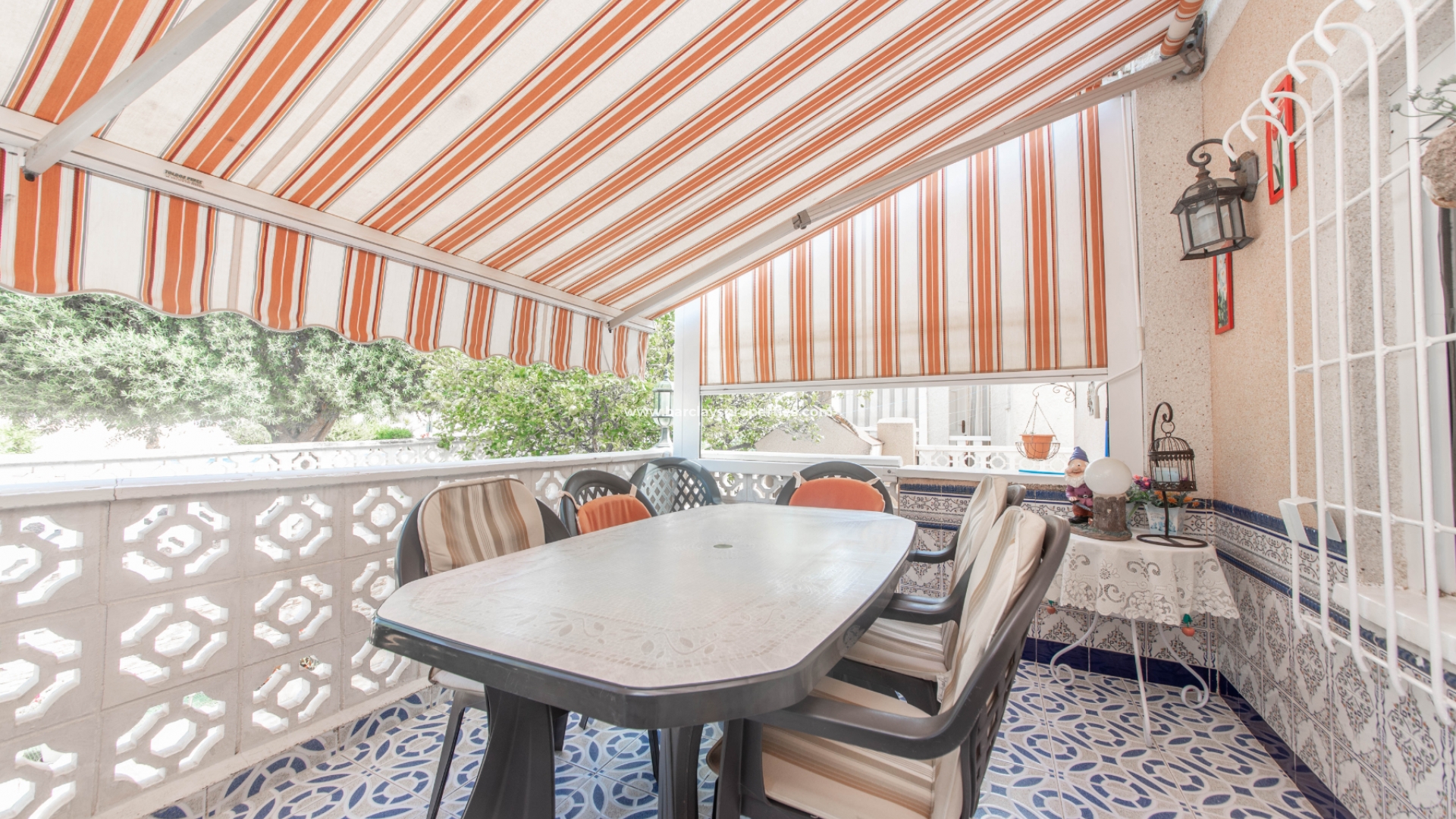 ➡️Het huis zelf is ontworpen voor comfortabel wonen en genieten van buiten. Het heeft een uitnodigende veranda en terras met elektrisch zonnescherm voor schaduw en verschillende zitgedeeltes buiten. Binnen in het pand zijn de woon- en eetruimtes royaal bemeten en bieden ze een prettige ruimte om te ontspannen, voorzien van airconditioning voor een comfortabel binnenklimaat. De keuken heeft voldoende opbergruimte, aangevuld met een granieten werkblad en een gasfornuis. Een ruim glazen terras en zonneterras met zonneschermen zijn bereikbaar vanuit de woonkamer, met trappen die leiden naar het toegangshek naar de fraai onderhouden gemeenschappelijke tuin en het zwembad.