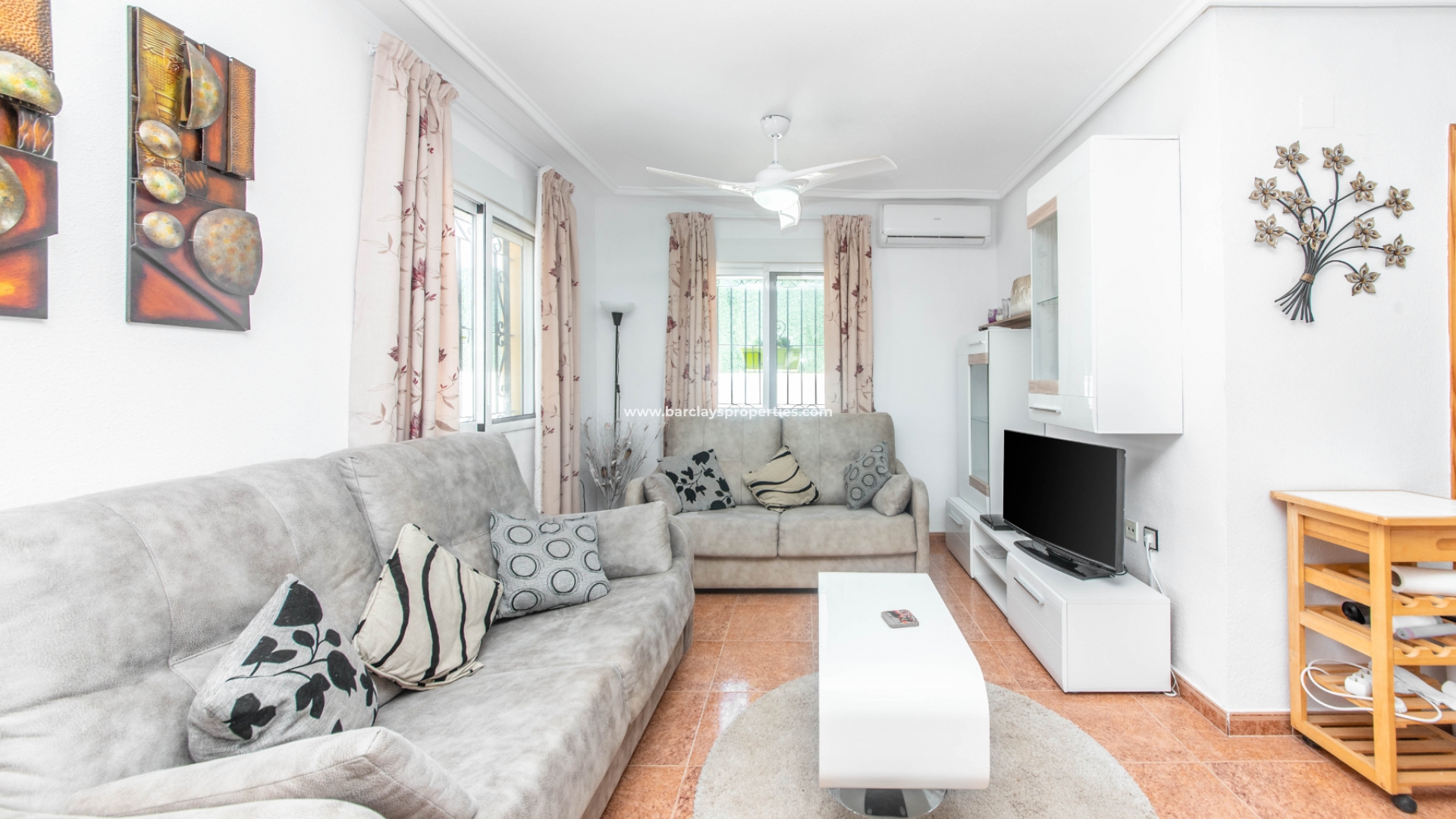 De overdekte veranda en het zonneterras bieden toegang tot het interieur van dit pand, waar we de ruime woonkamer vinden die een comfortabele ruimte biedt om te ontspannen en te vermaken. Met het extra comfort van airconditioning en een plafondventilator zorgt dit gebied het hele jaar door voor een aangename sfeer.