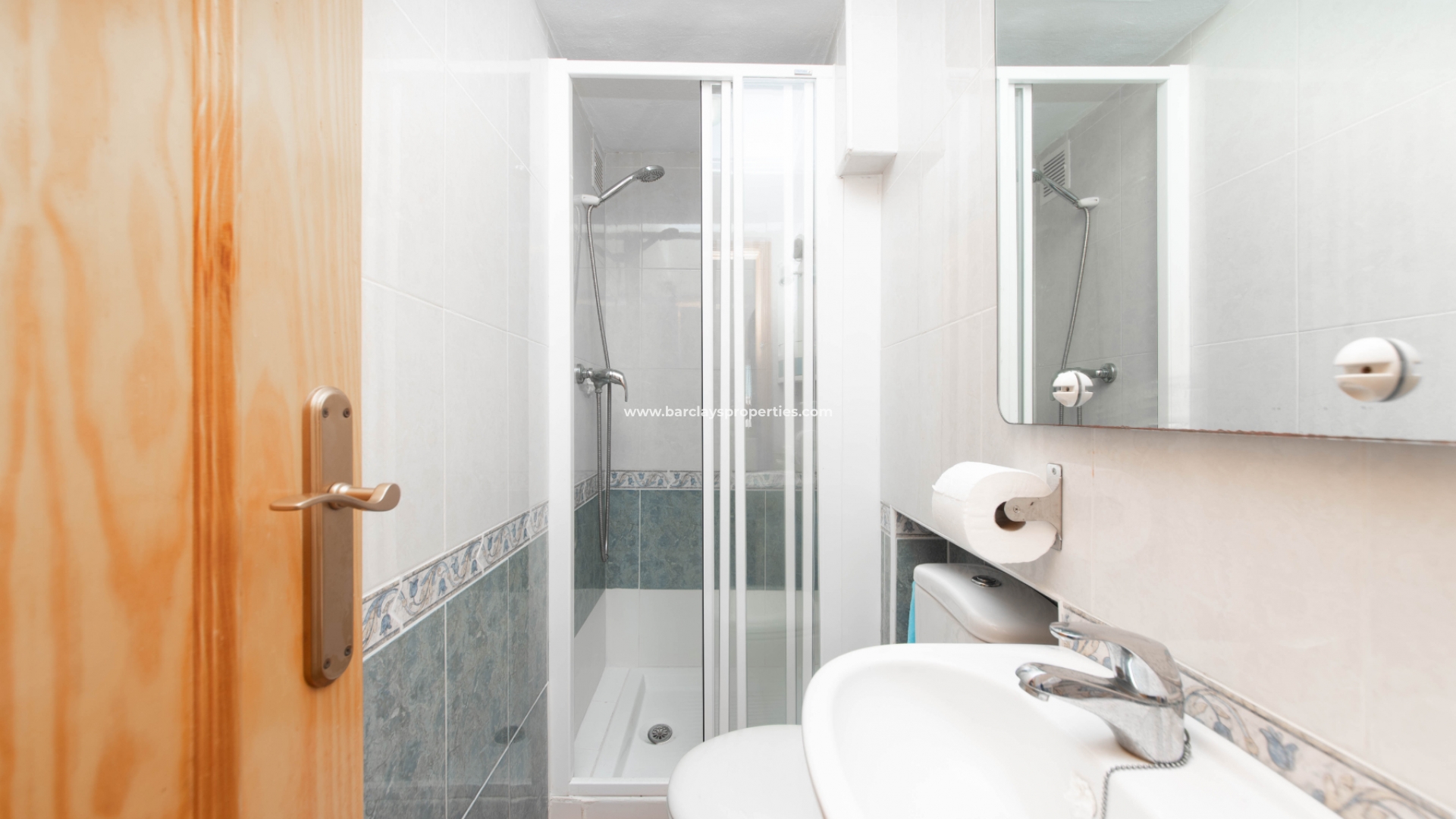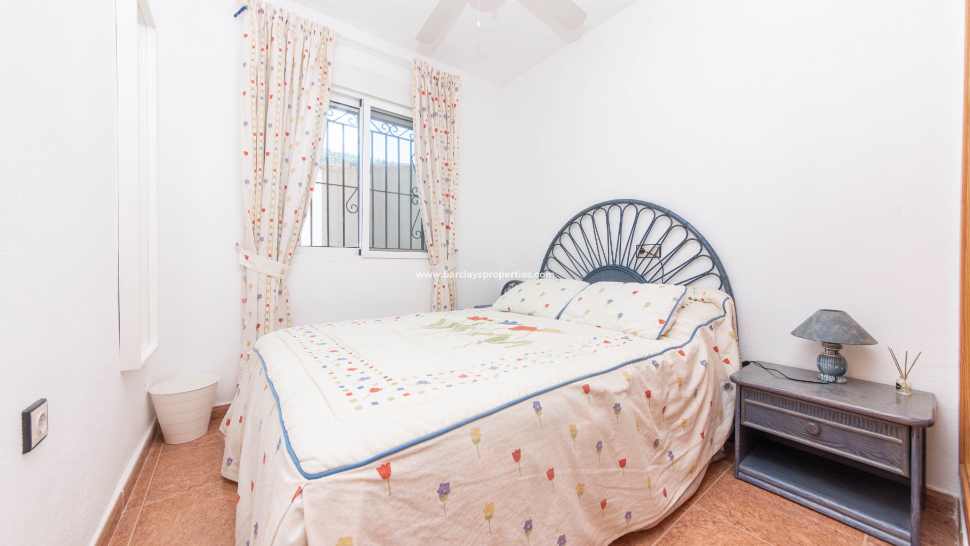 De eerste slaapkamer op de begane grond heeft een tweepersoonsbed, vergezeld van een plafondventilator en een ingebouwde kledingkast, waarbij functionaliteit en comfort worden gecombineerd. Aangrenzend bevindt zich een goed ontworpen badkamer met douche en scherm, wastafel en toilet.