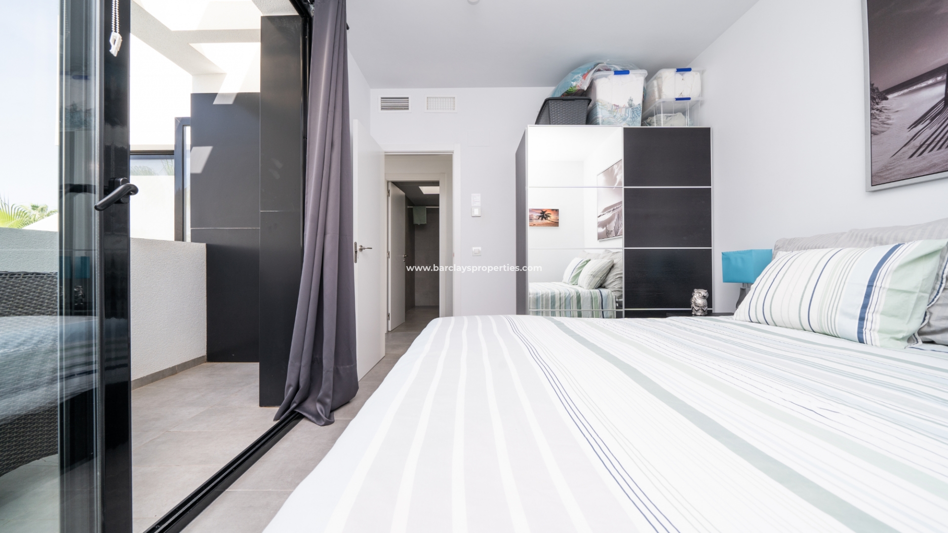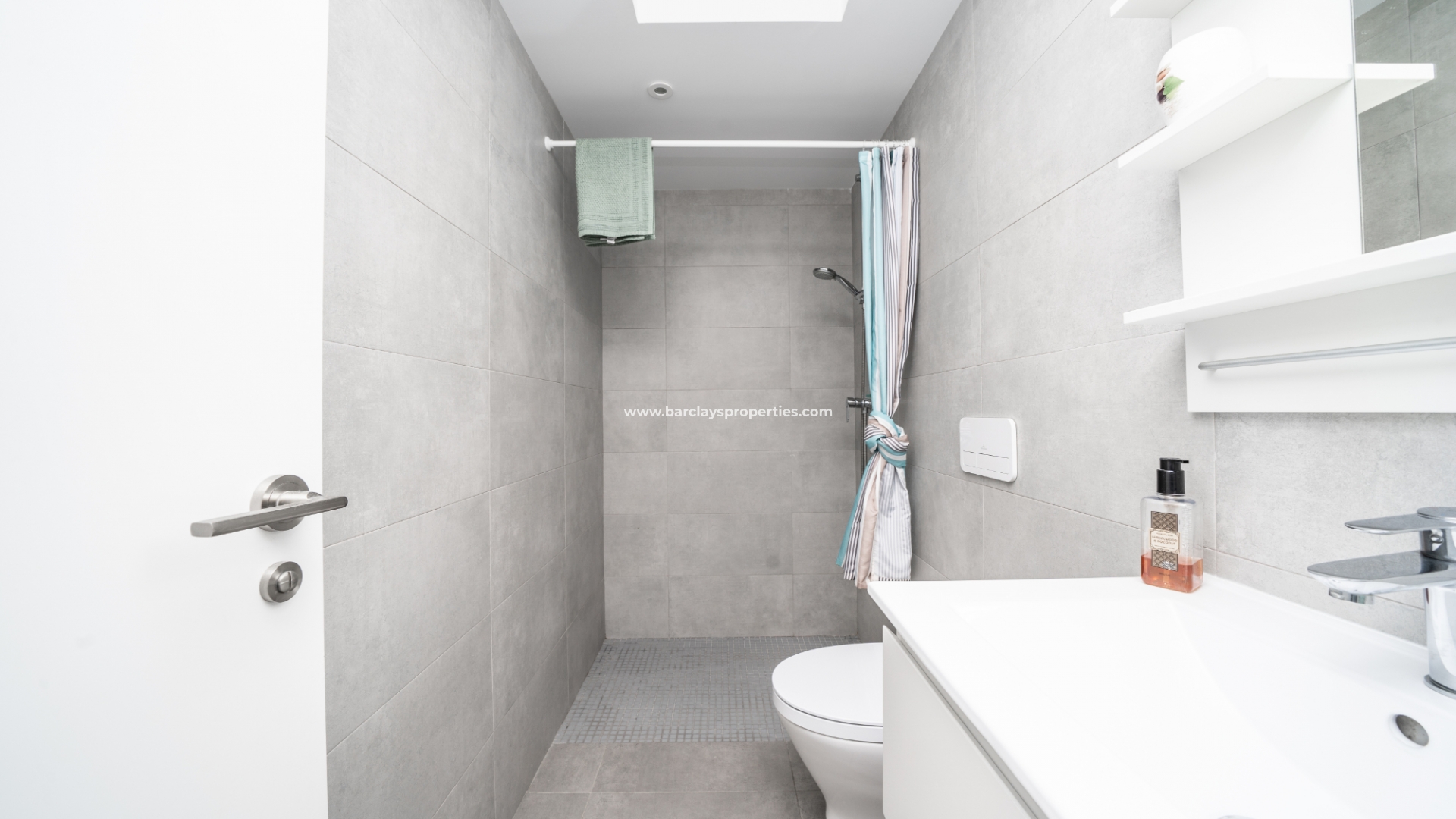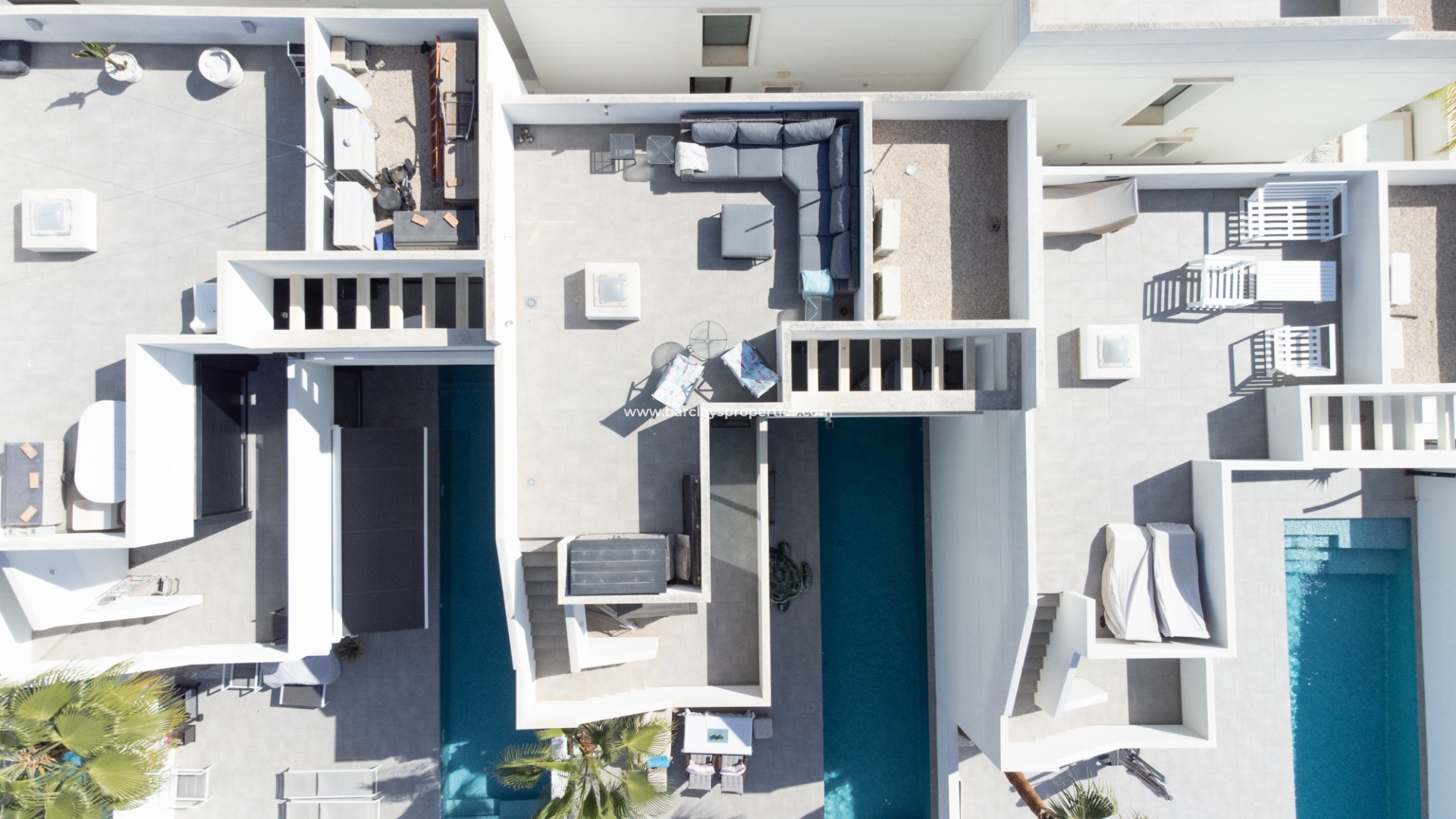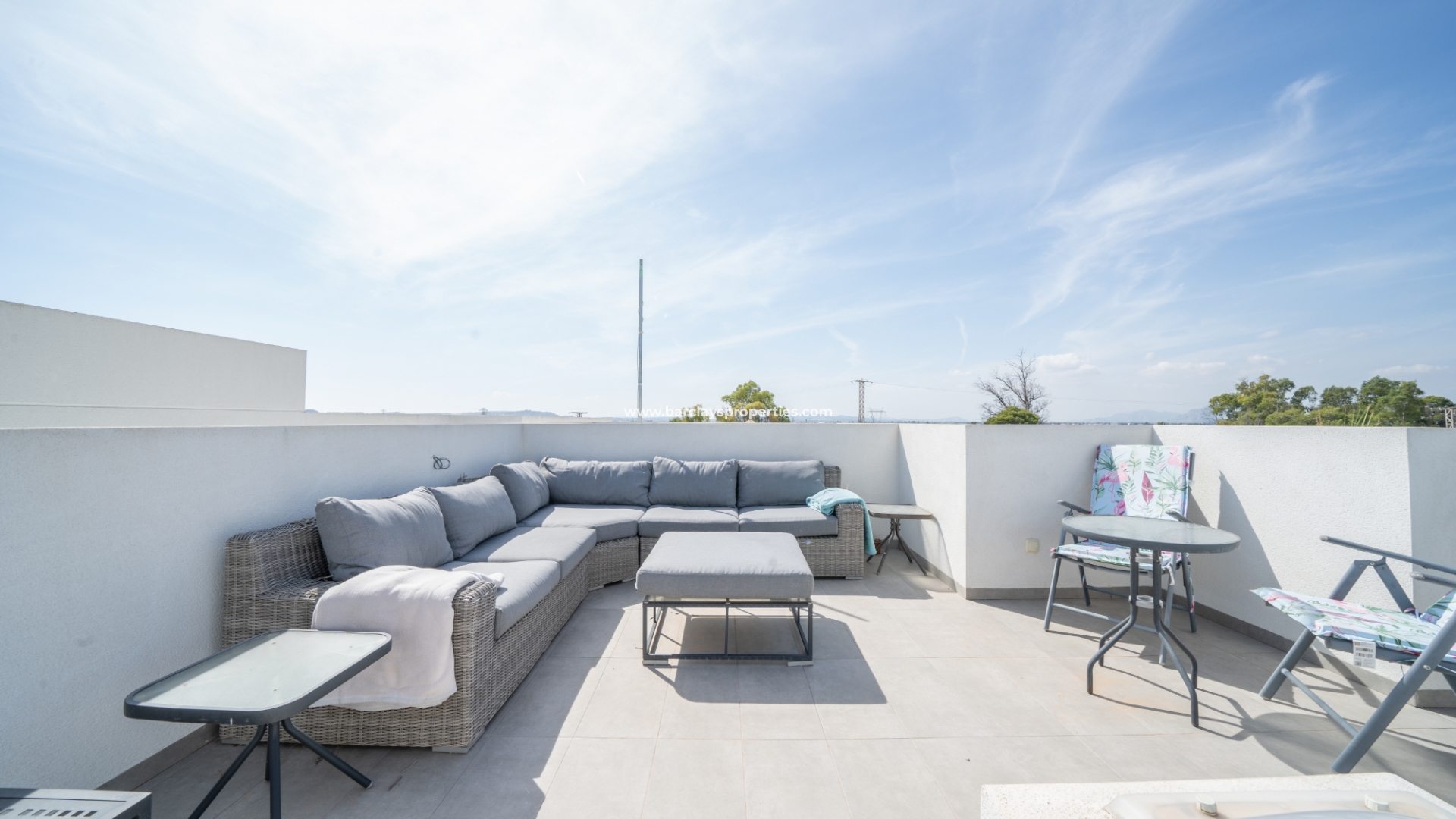 Nu, als we naar boven gaan, vinden we een tweepersoons slaapkamer met een eigen privézonneterras, bereikbaar via schuifdeuren, een badkamer met een douche van muur tot muur, een hangend toilet en wastafel / wastafelmeubel en een ruime derde slaapkamer. Vanaf de overloop is het zonneterras bereikbaar en er zijn trappen die leiden naar het solarium met verschillende zitgedeeltes en adembenemend uitzicht op het omringende landschap en de bergen.