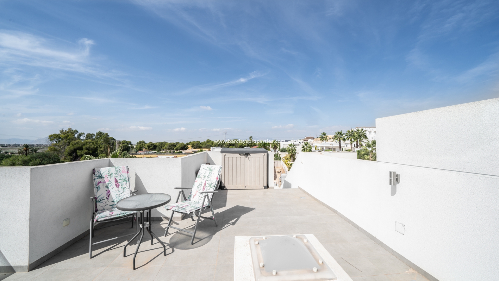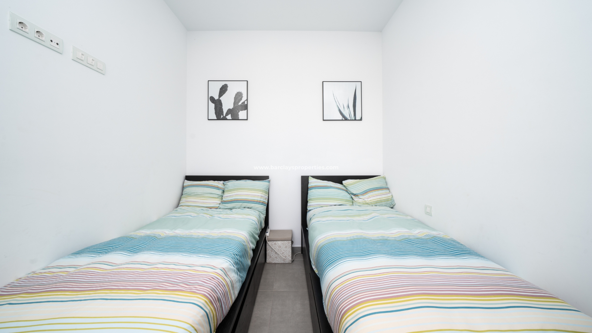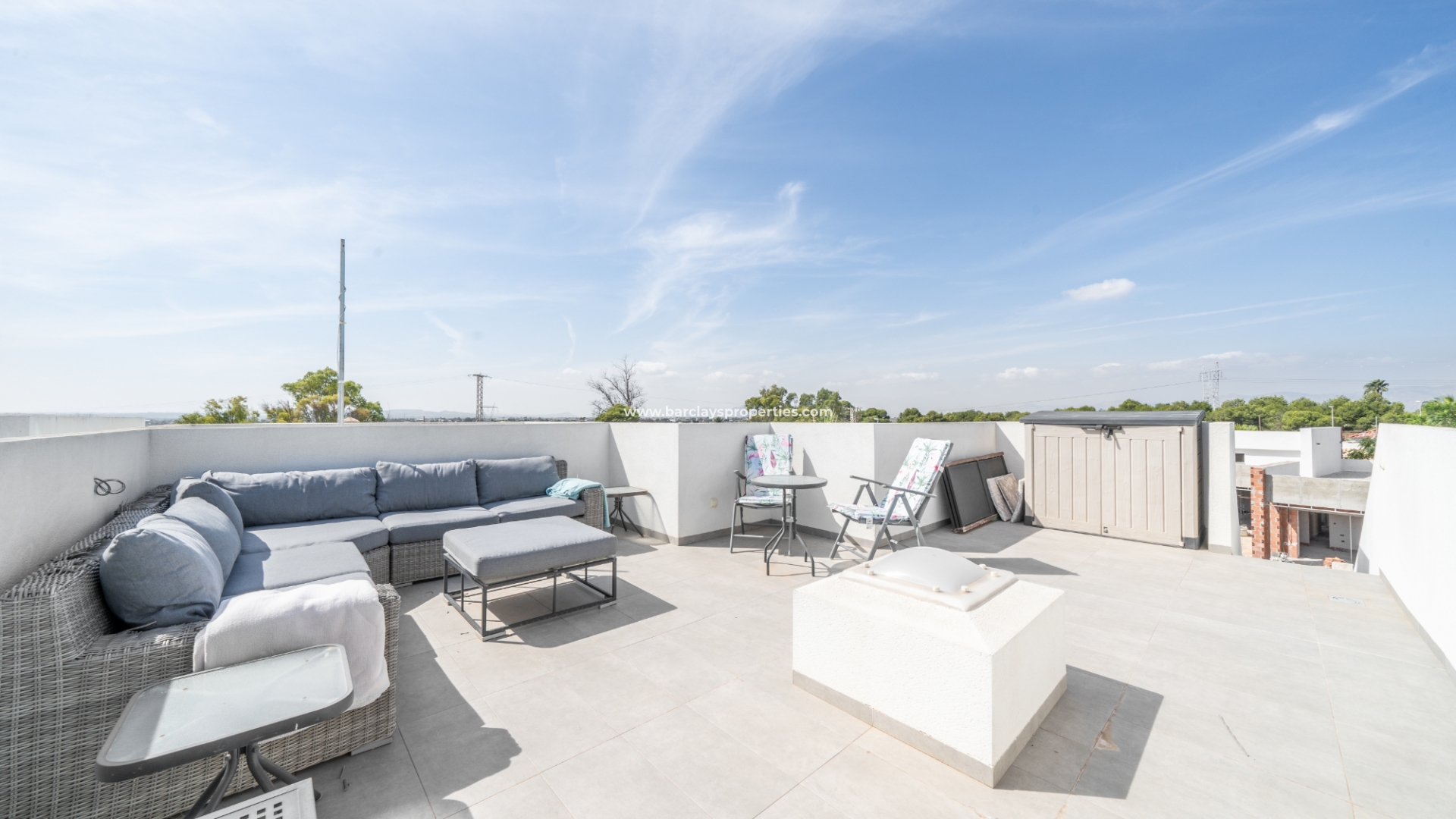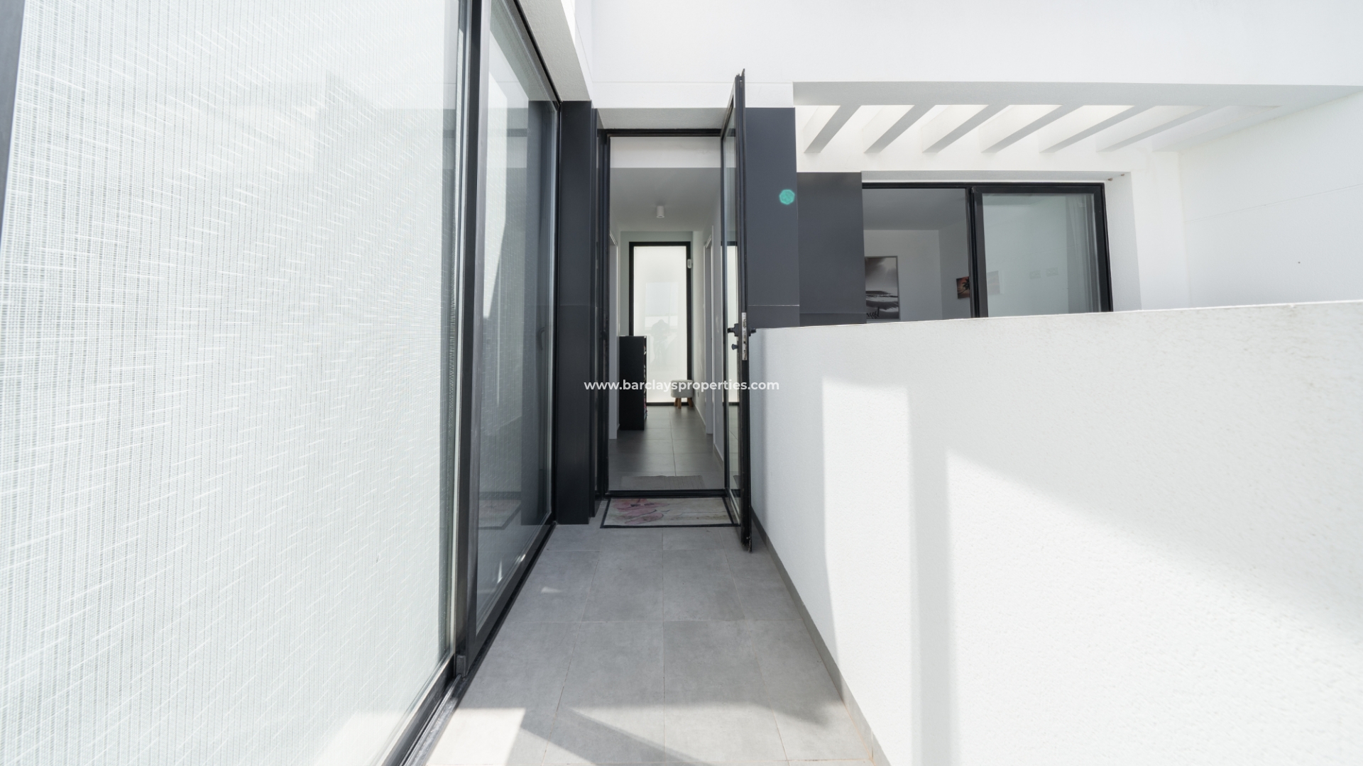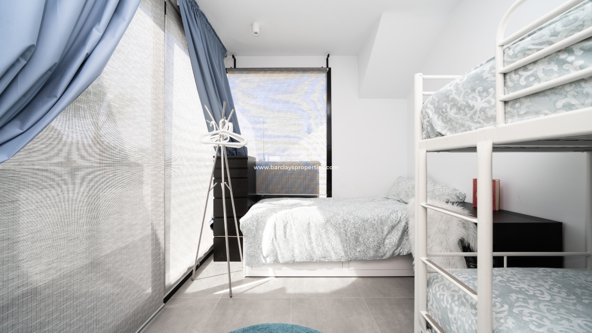 Nu, als we naar boven gaan, vinden we een tweepersoons slaapkamer met een eigen privézonneterras, bereikbaar via schuifdeuren, een badkamer met een douche van muur tot muur, een hangend toilet en wastafel / wastafelmeubel en een ruime derde slaapkamer. Vanaf de overloop is het zonneterras bereikbaar en er zijn trappen die leiden naar het solarium met verschillende zitgedeeltes en adembenemend uitzicht op het omringende landschap en de bergen.