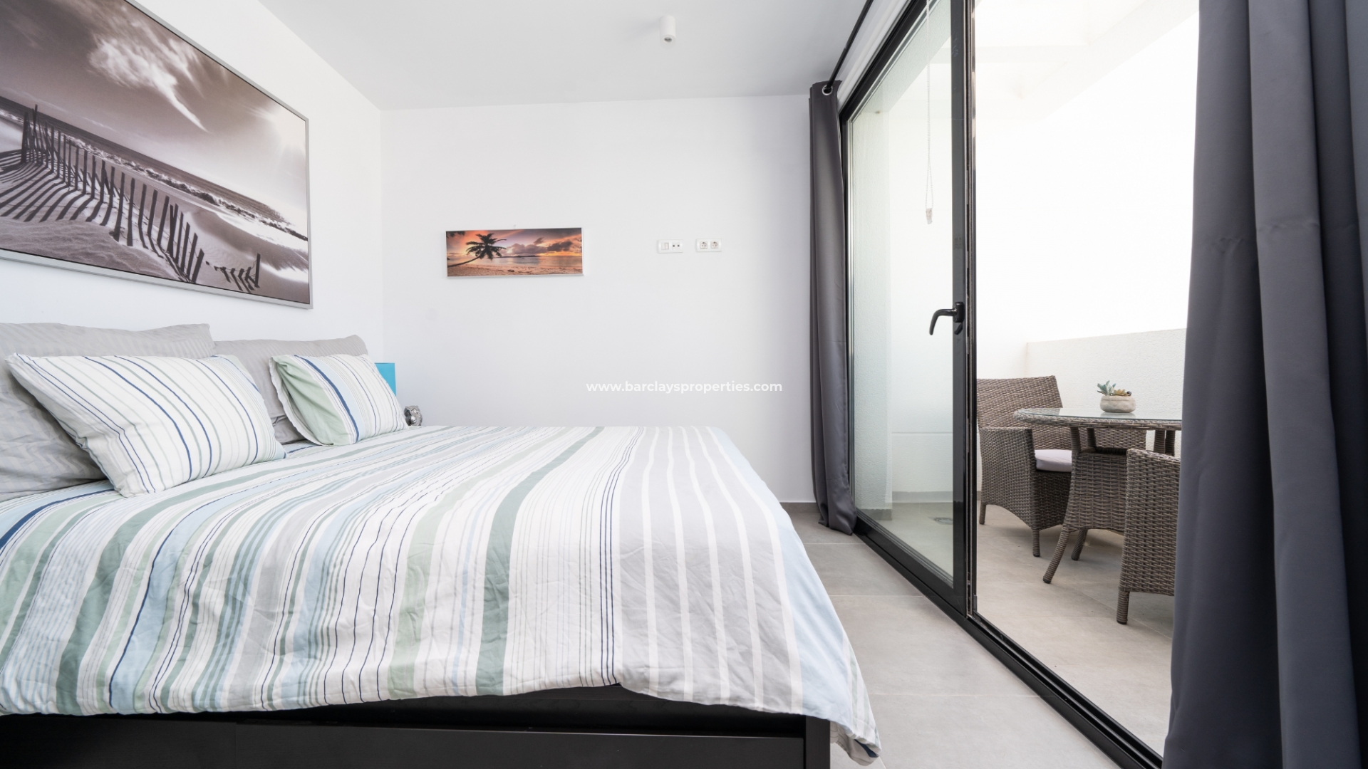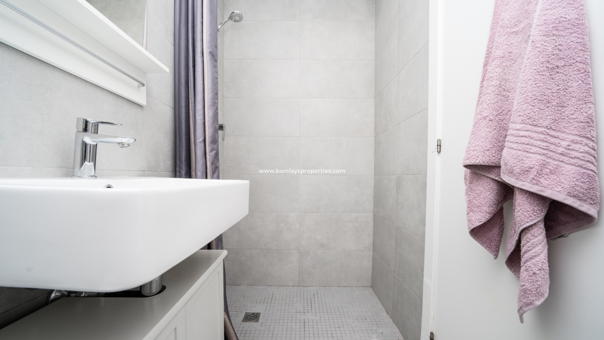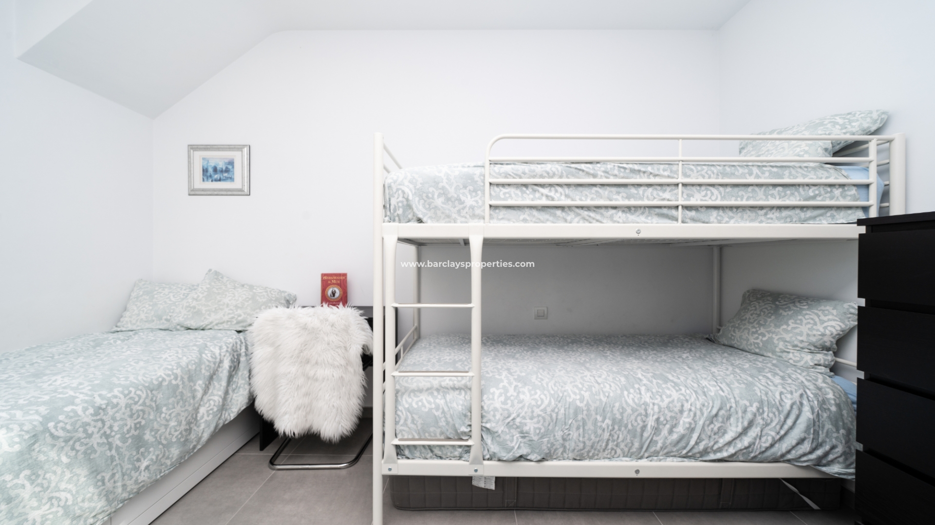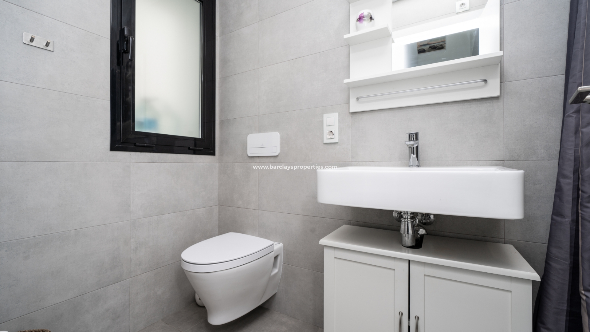 Nu, als we naar boven gaan, vinden we een tweepersoons slaapkamer met een eigen privézonneterras, bereikbaar via schuifdeuren, een badkamer met een douche van muur tot muur, een hangend toilet en wastafel / wastafelmeubel en een ruime derde slaapkamer. Vanaf de overloop is het zonneterras bereikbaar en er zijn trappen die leiden naar het solarium met verschillende zitgedeeltes en adembenemend uitzicht op het omringende landschap en de bergen.