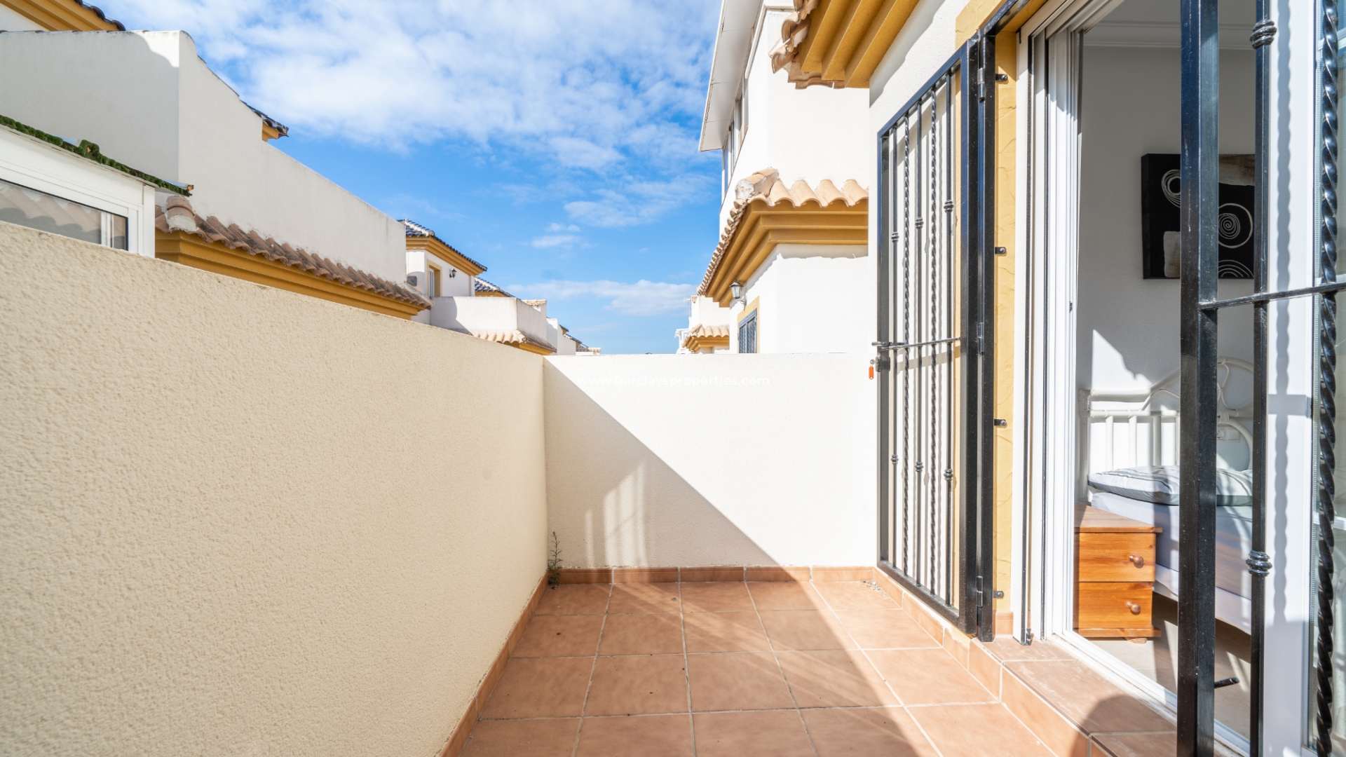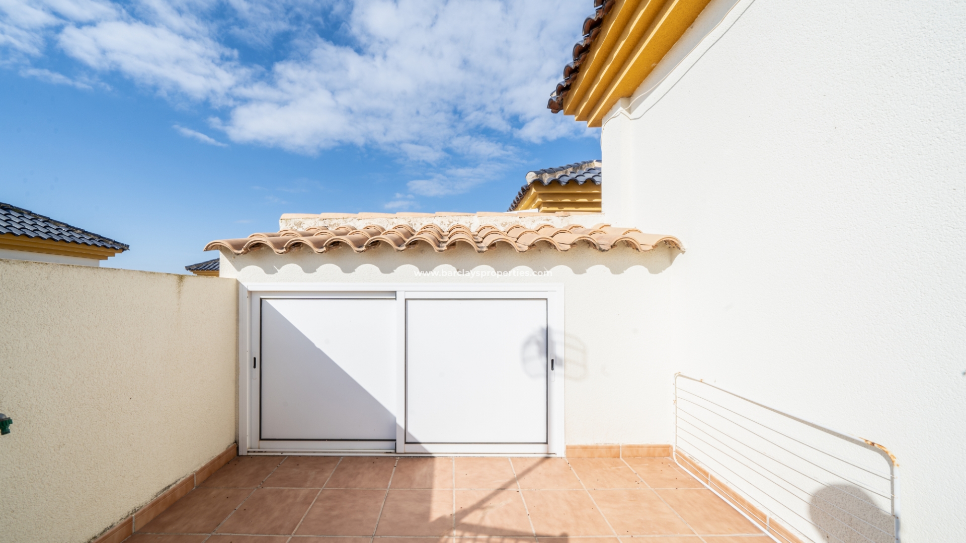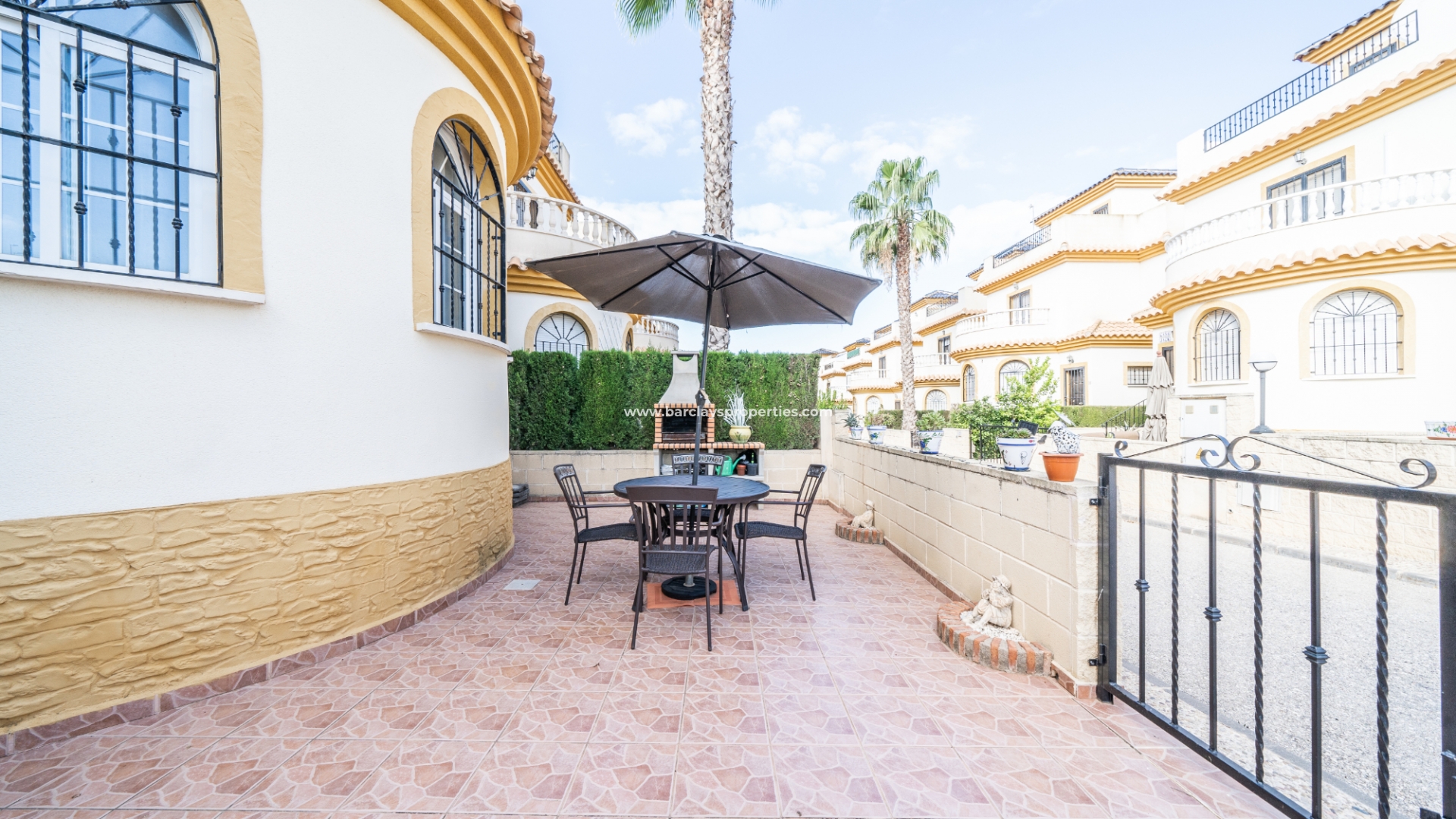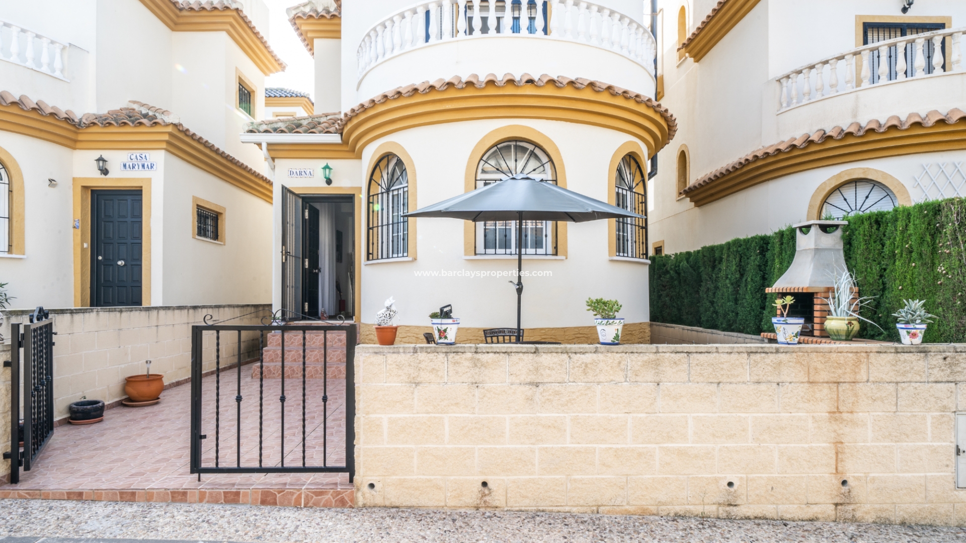 We betreden de volledig betegelde tuin om off-road parkeren, een buitenzitgedeelte en voor liefhebbers van buitenactiviteiten is er een ingebouwde BBQ-ruimte die ideaal is voor entertainment en om van het Spaanse klimaat te genieten. Een opslagschuur aan de achterkant van het huis biedt praktische ruimte voor gereedschap en apparatuur.