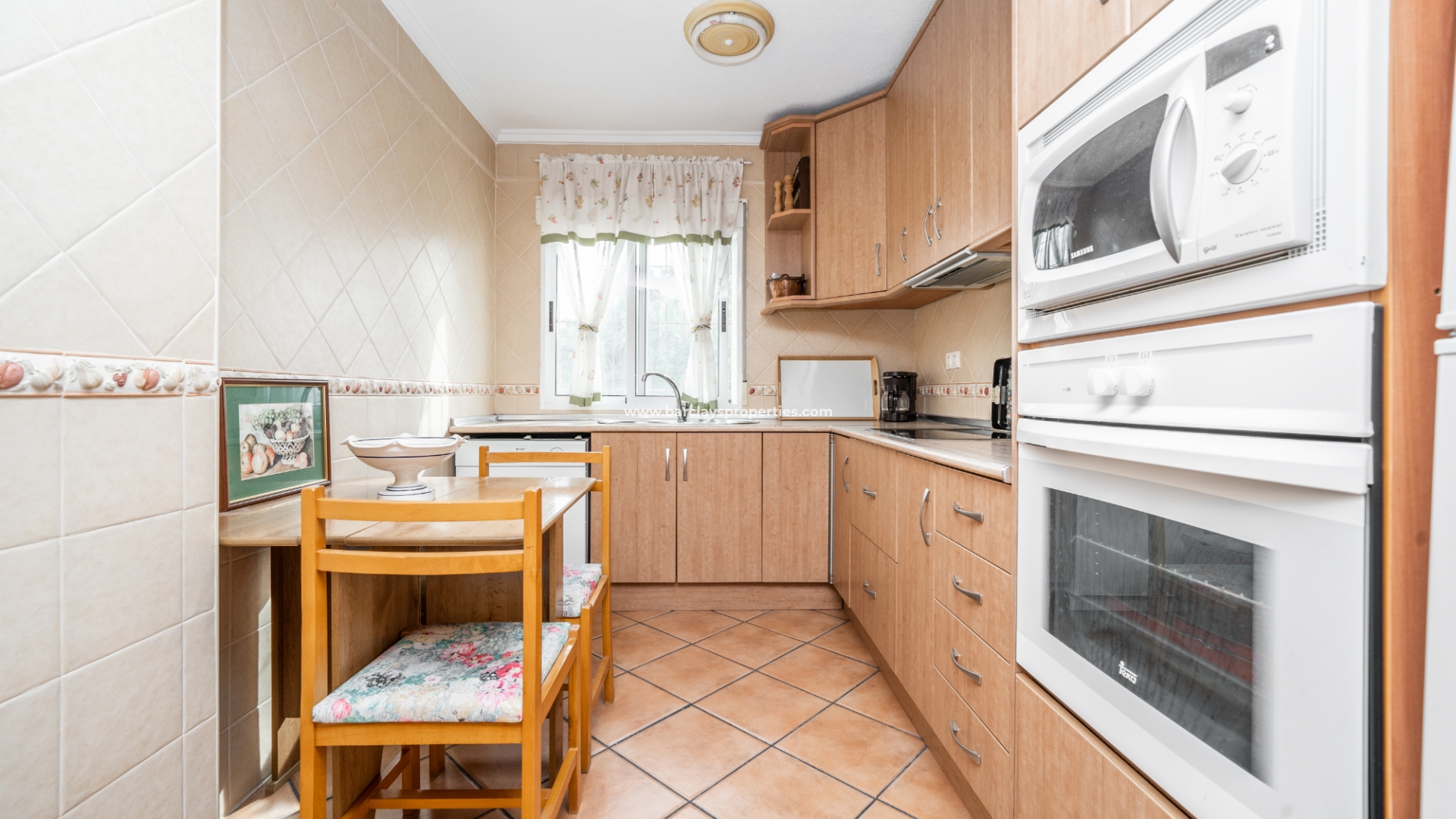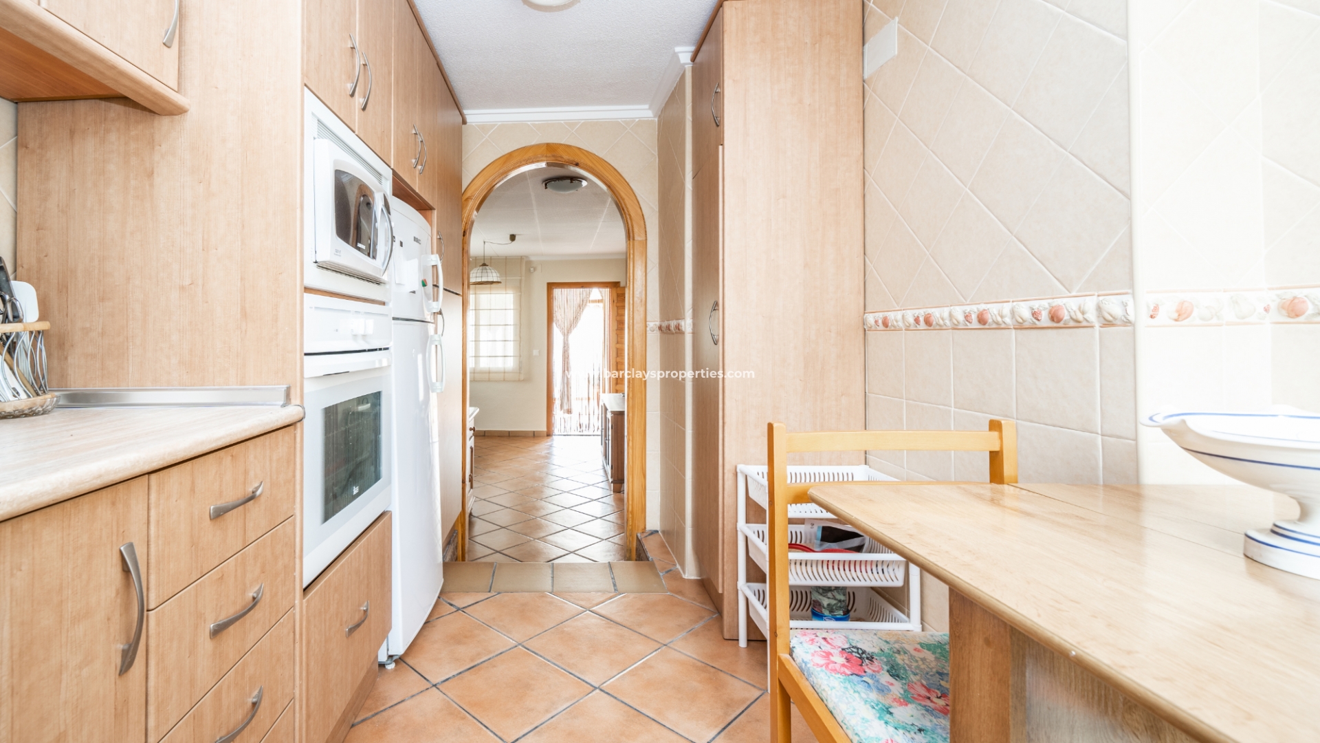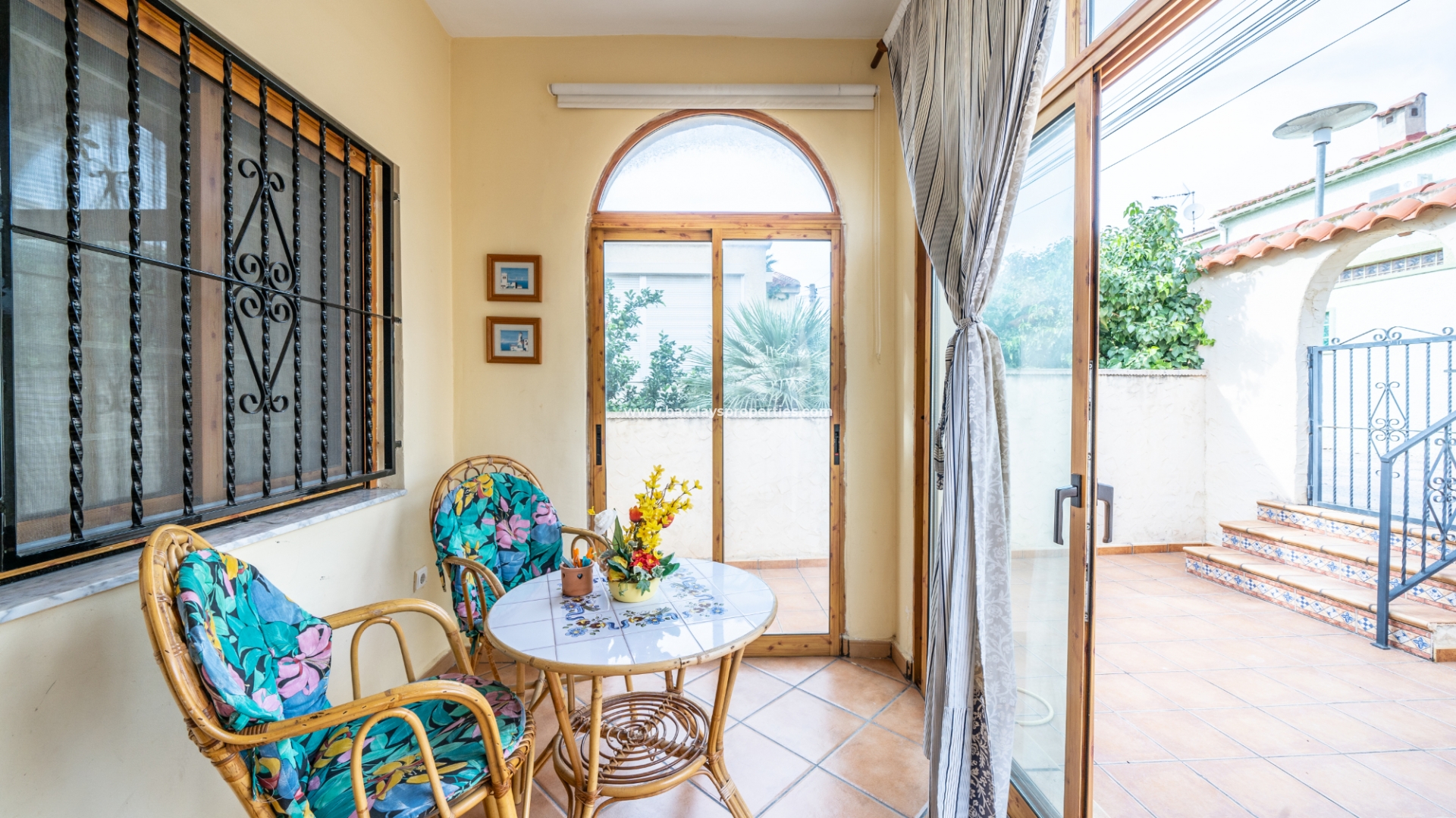 De inrichting van de villa is ontworpen met comfort en praktisch in gedachten. Een glazen veranda met zithoek leidt naar de woonkamer, die is voorzien van airconditioning voor een aangename sfeer, terwijl de eetkamer een plafondventilator heeft voor extra comfort tijdens de maaltijden. De keuken is uitgerust met nieuwe eenheden en werkbladen en is volledig elektrisch, waardoor het een moderne en functionele ruimte is. Er is ook een kleine tafel voor informeel dineren, en een 80-liter boiler zorgt voor een constante toevoer van warm water.