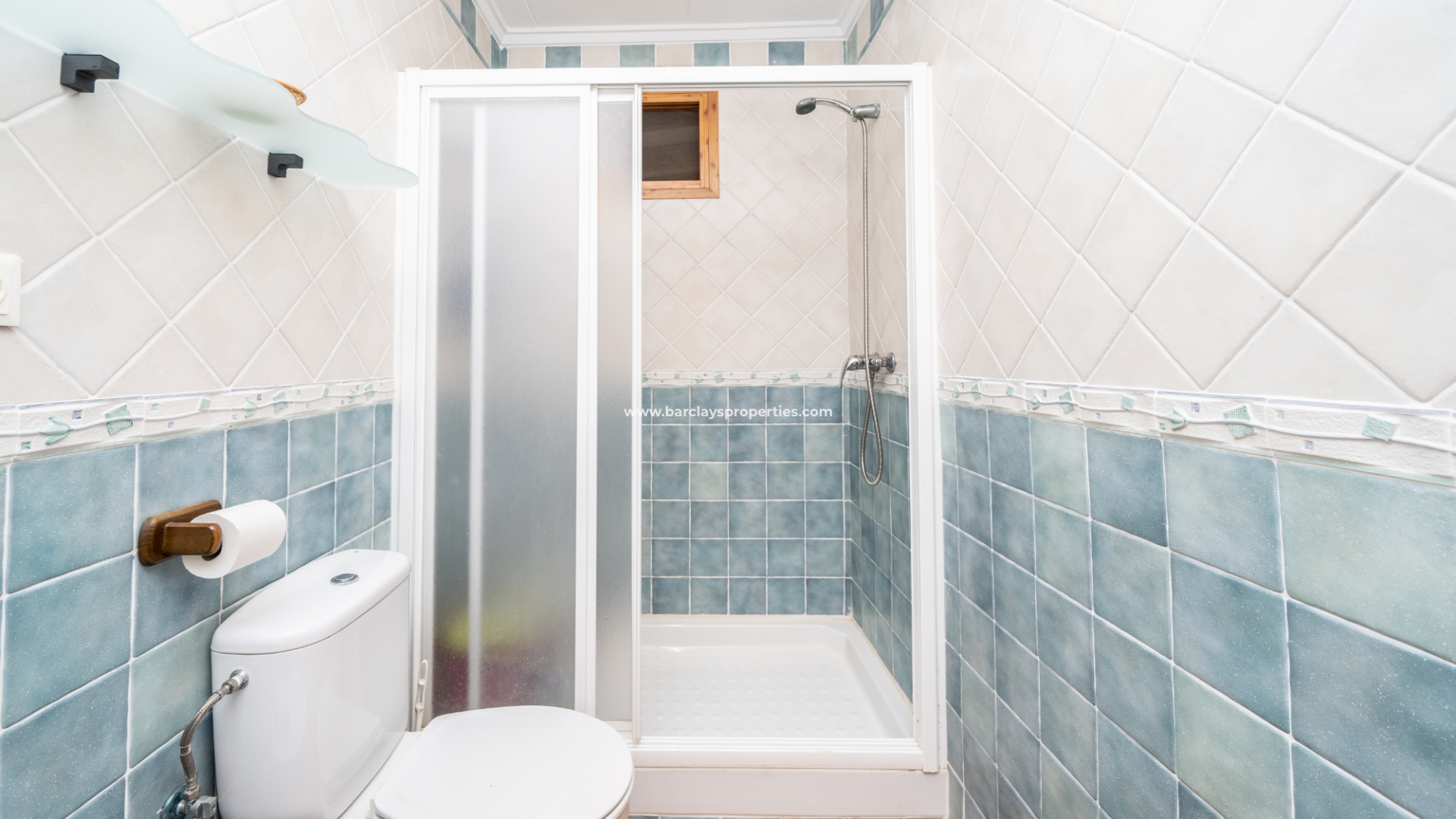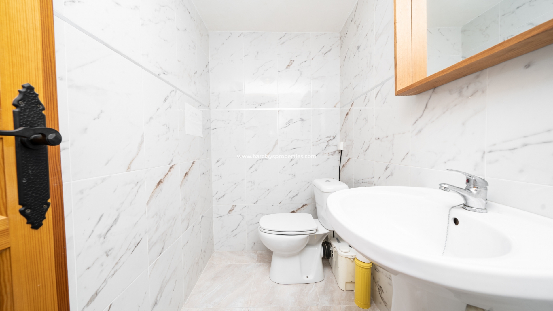 De eerste badkamer in de villa biedt een grote inloopdouche met een scherm, een toilet, bidet en wastafels, voor zowel stijl als gemak. De eerste slaapkamer kan worden gebruikt als een eenpersoonskamer of een kleine tweepersoonskamer, waardoor het veelzijdig is voor verschillende behoeften en is voorzien van een plafondventilator. De grote slaapkamer is een hoogtepunt, compleet met ingebouwde kasten, airconditioning en openslaande deuren naar een charmant "Juliaans" balkon, ideaal om van de mediterrane bries te genieten.