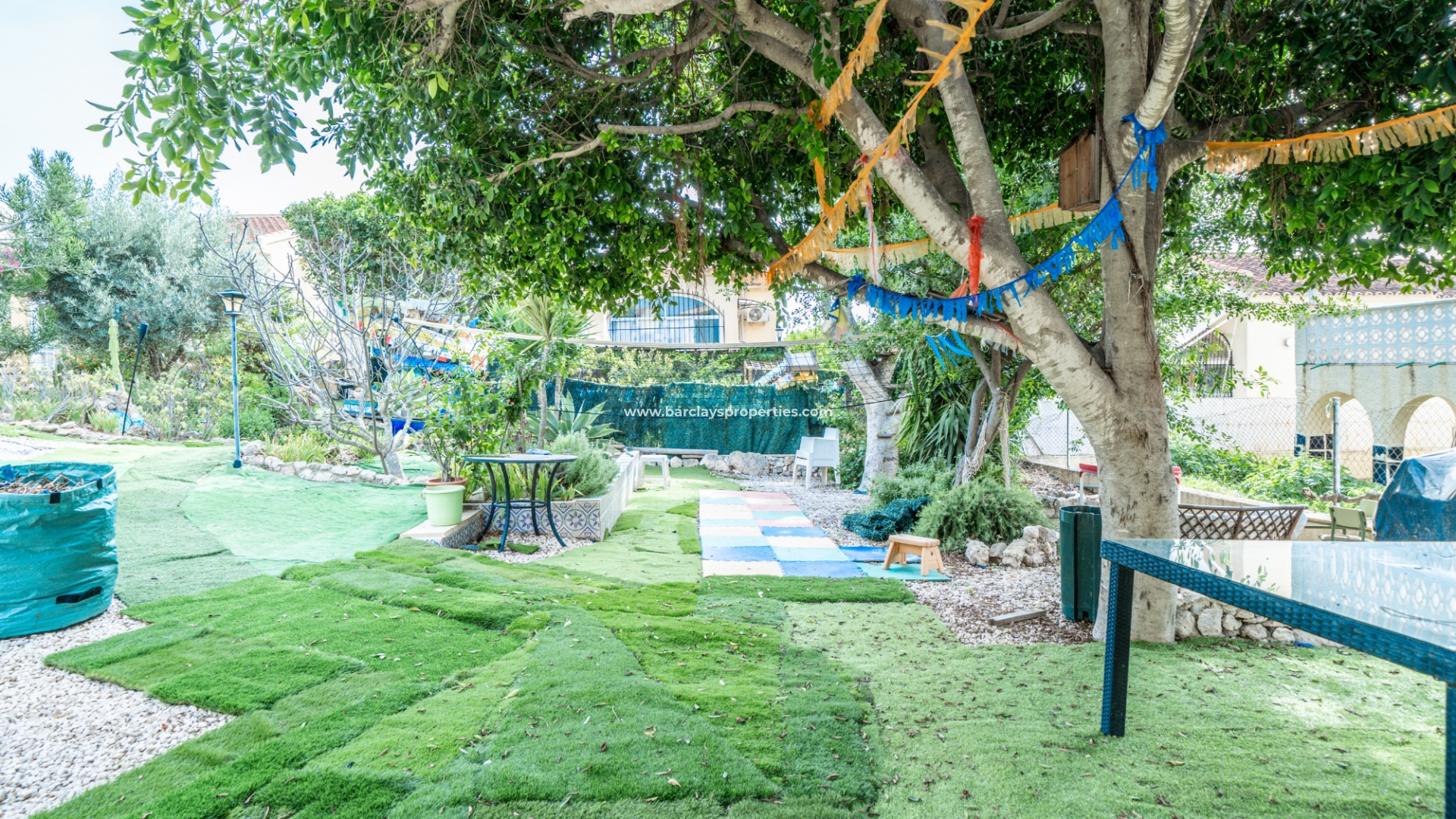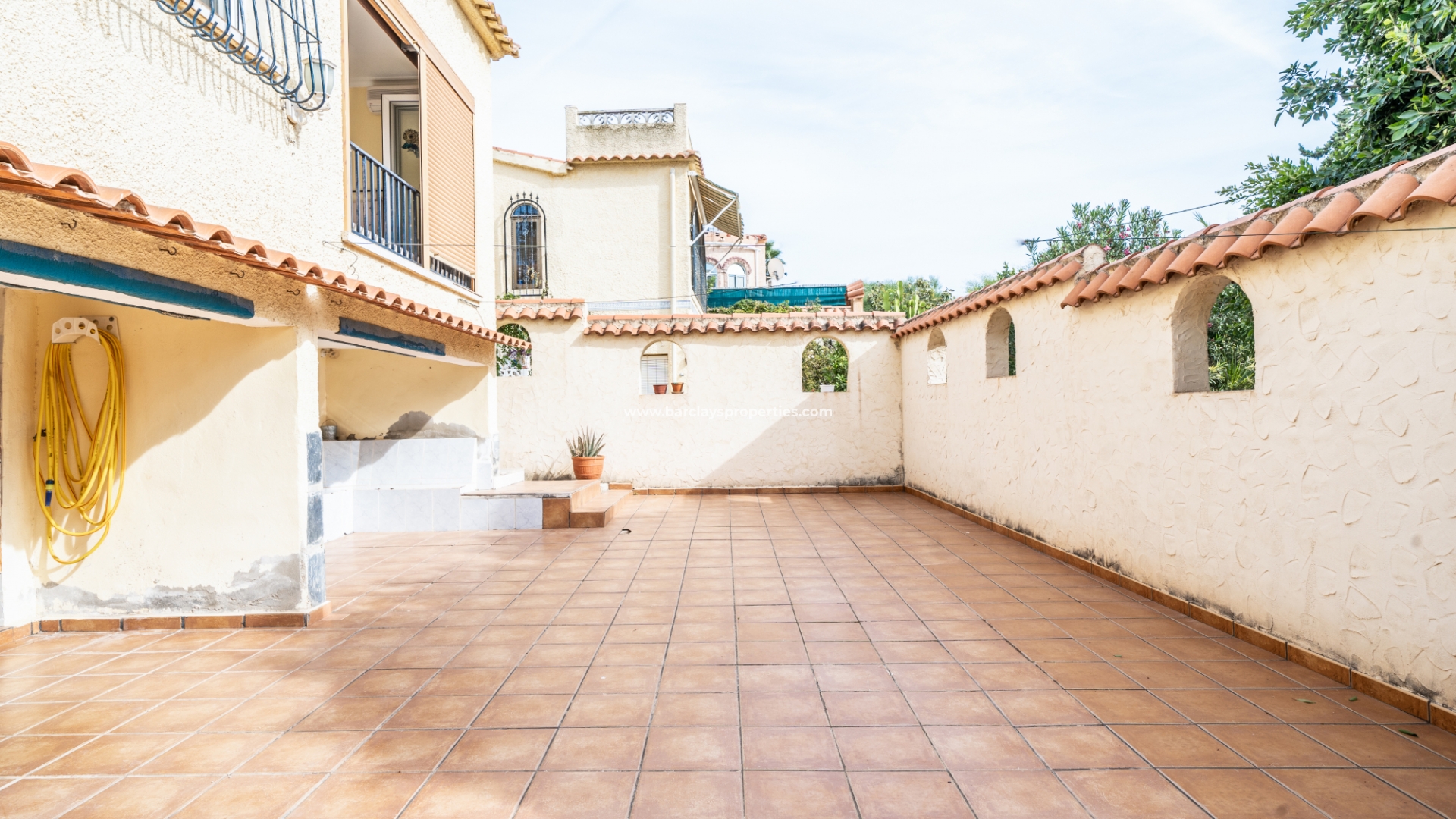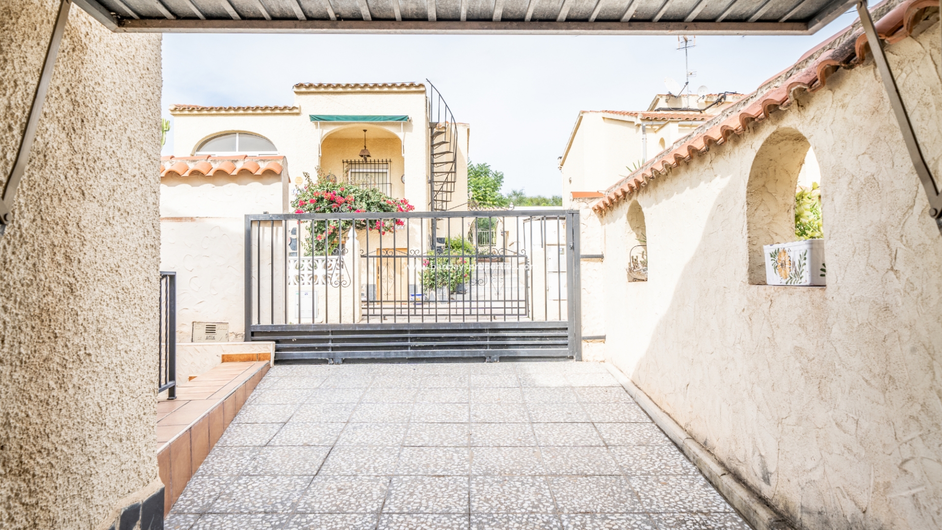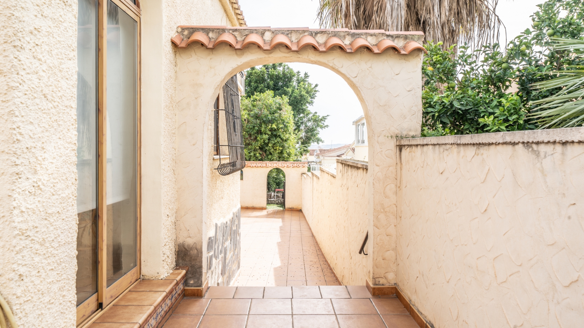 De tuin is volledig betegeld met hoge muren voor privacy, een schuifpoort, een ➡️ privégarage en aan de achterkant van het pand is ruimte om uw eigen privézwembad te bouwen.