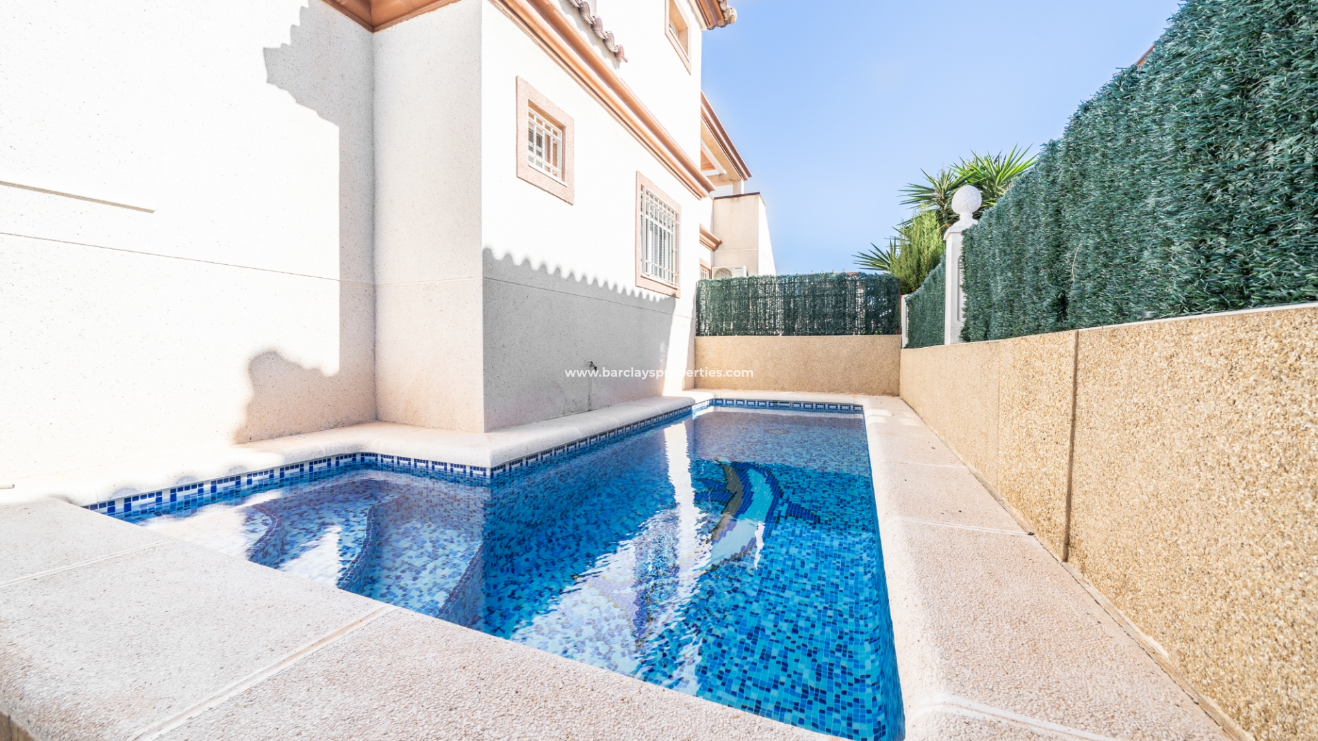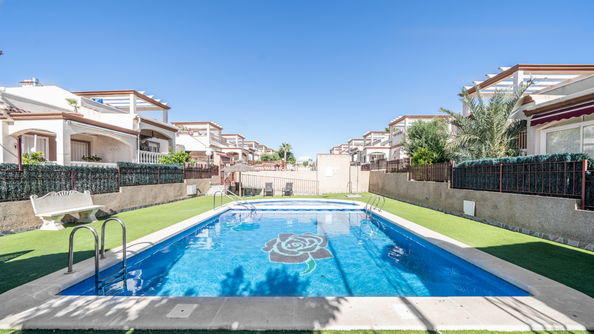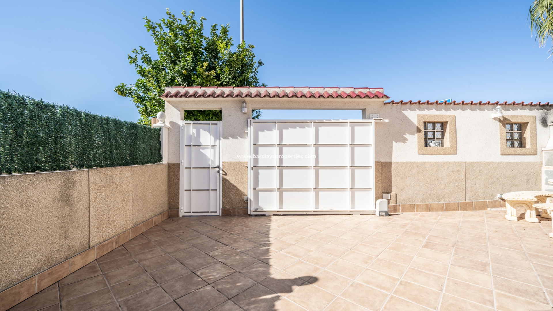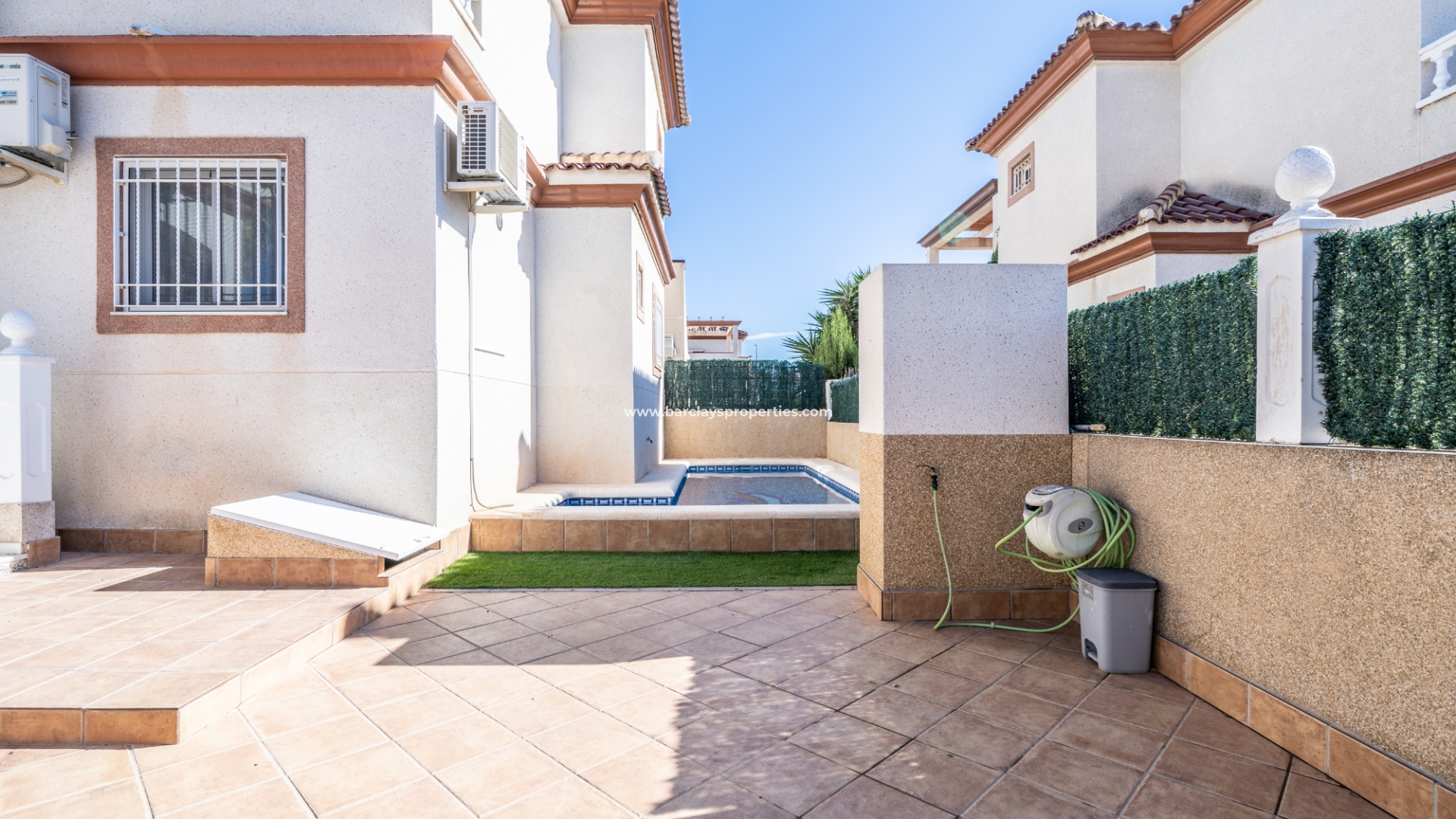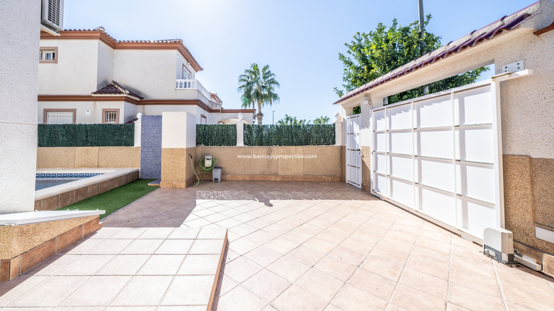 De tuin is volledig bestraat, wat betekent dat deze weinig onderhoud vergt. Ondanks het gemeenschappelijke zwembad heeft de woning het extra voordeel van een eigen privézwembad ☀ in de tuin met een kunstgrasgebied, ideaal om te zonnebaden, en een buitendouche om af te spoelen. Er is een parkeerplaats buiten de weg met elektrische poorten en een mooie barbecueplaats met een tafel en stoelen van natuursteen om in de buitenlucht te dineren.