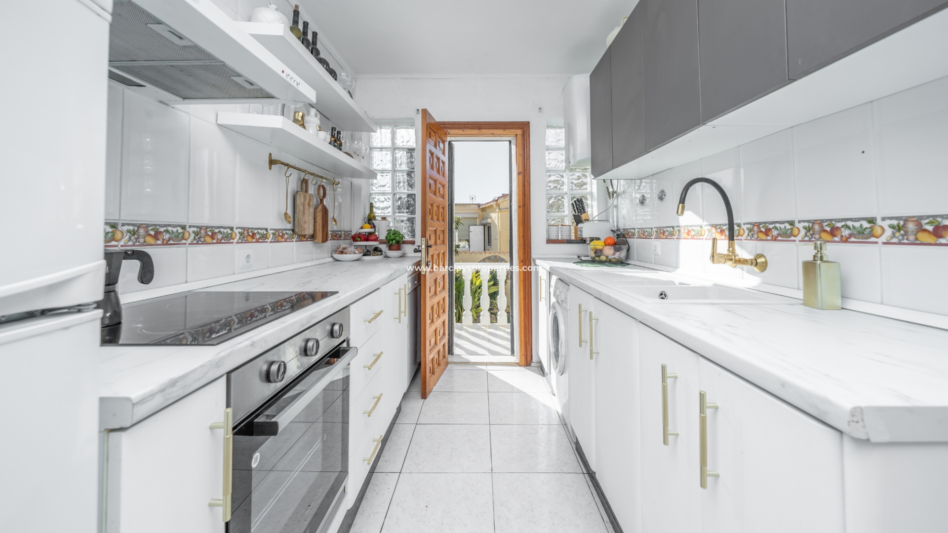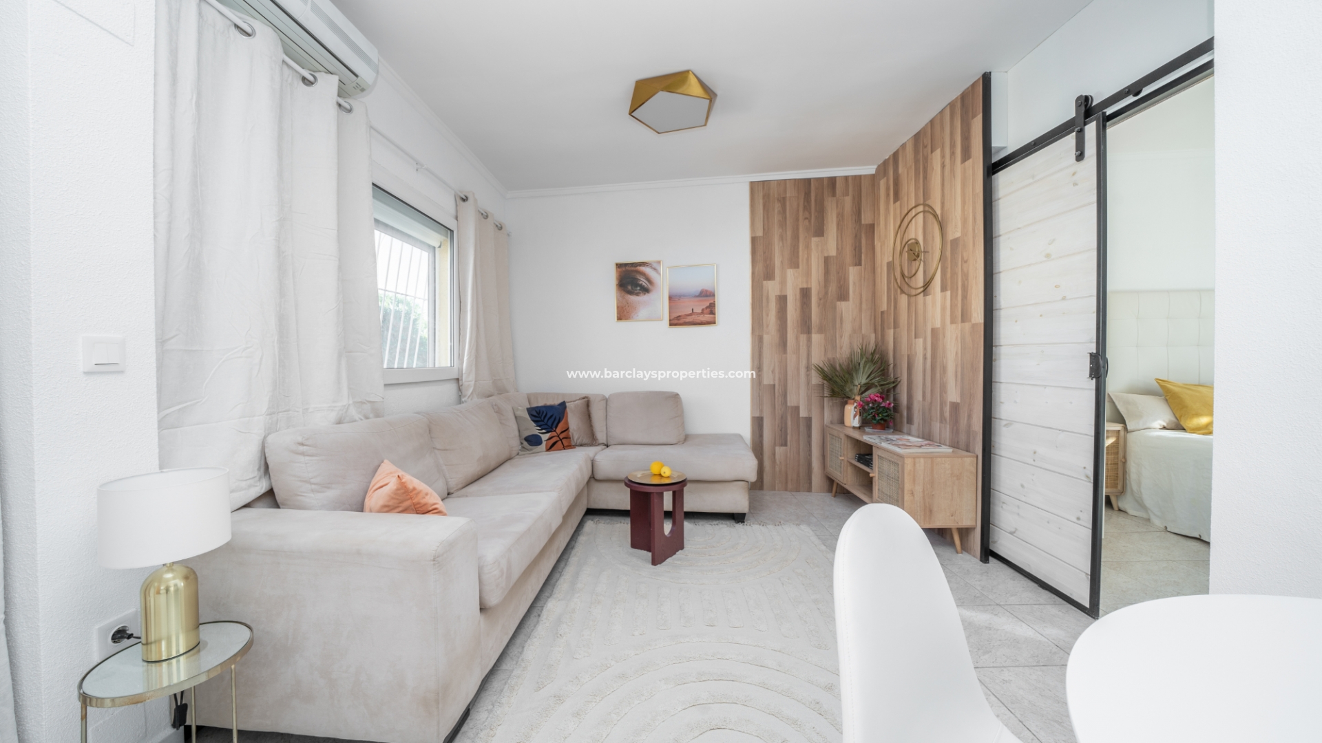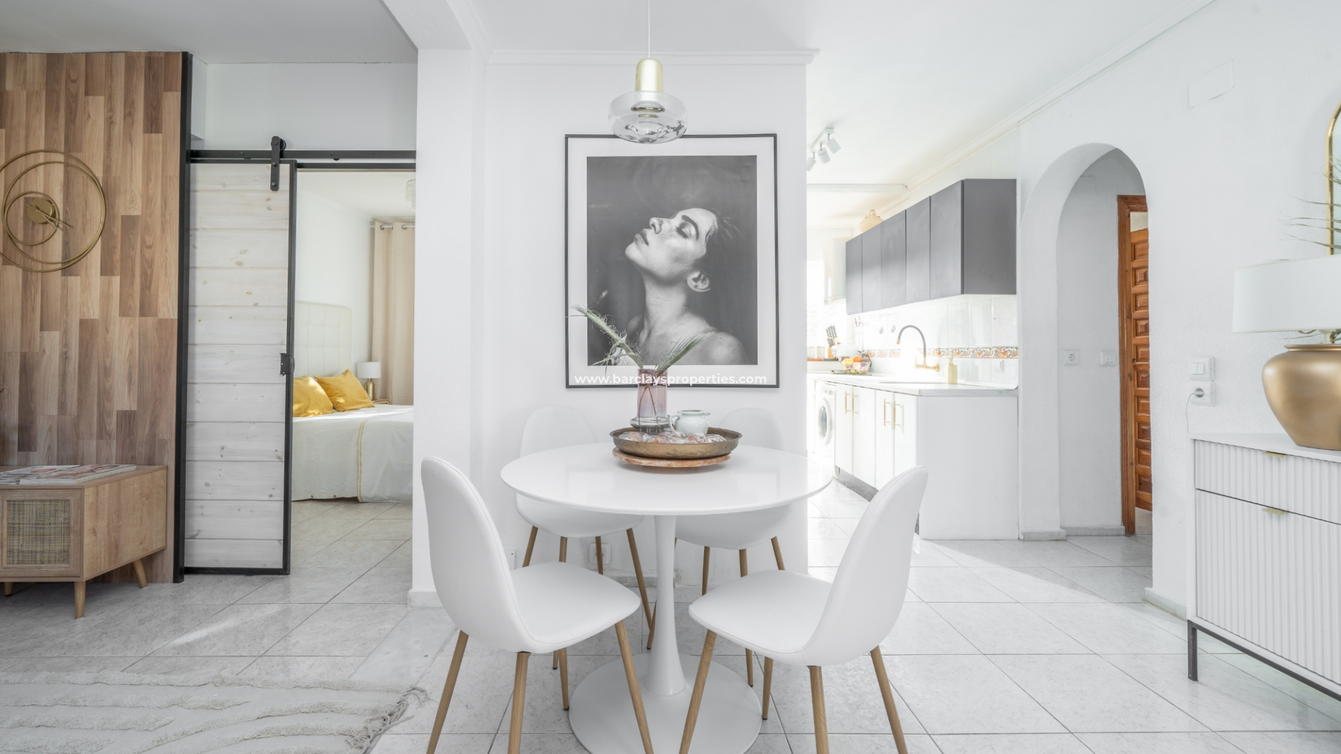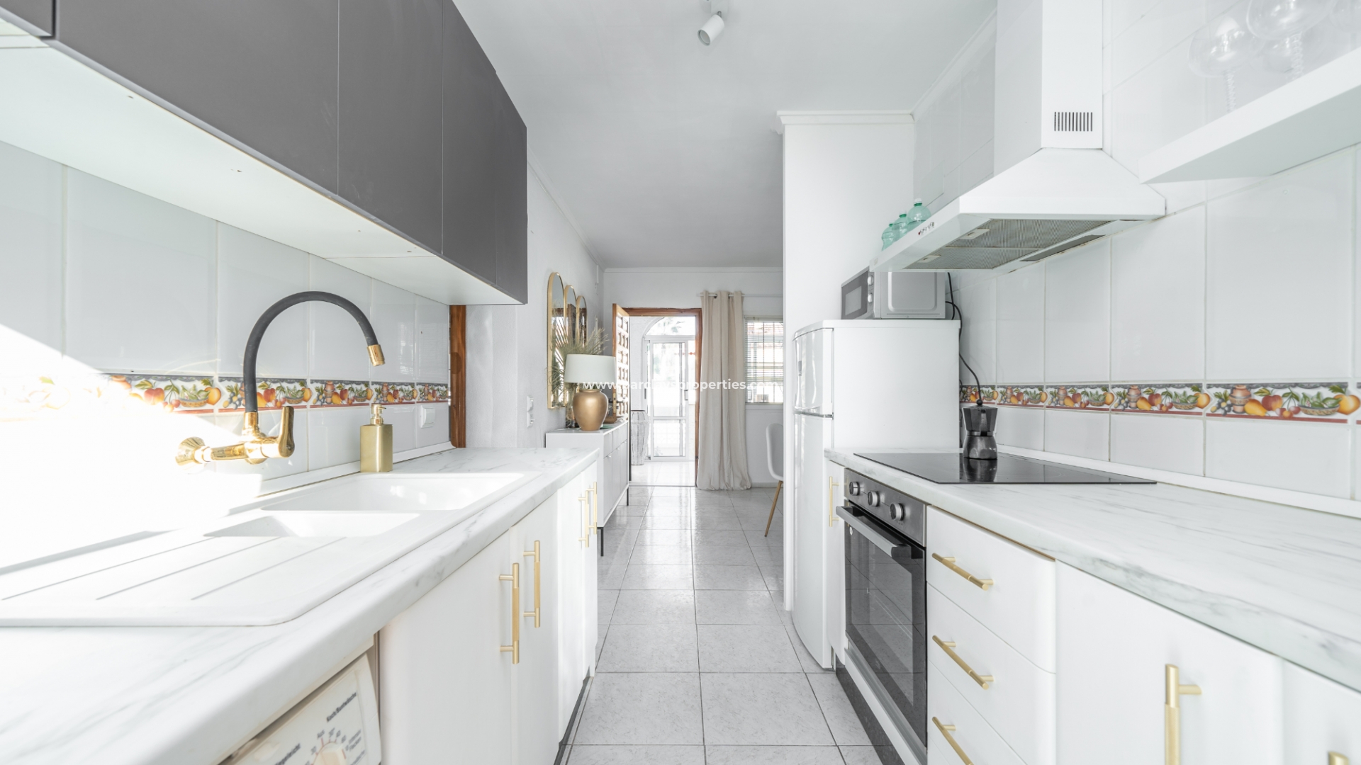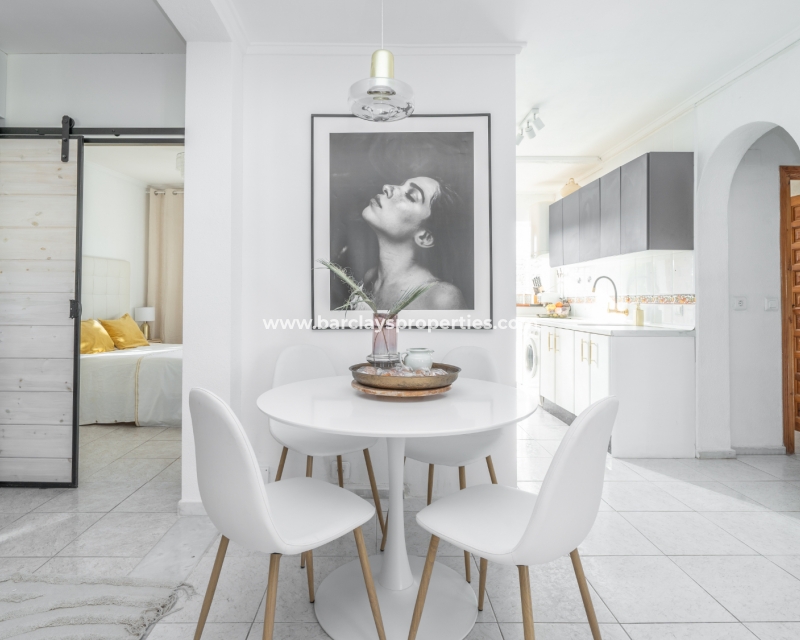 Binnen geeft een uitnodigende glazen veranda toegang tot de gerenoveerde, moderne, lichte woonkamer met eethoek, die u verwelkomt met een ruimtelijk gevoel, doordacht uitgebreid om een royale ruimte te creëren voor zowel ontspanning als entertainment, met het extra voordeel van airconditioning voor uw comfort. De volledig uitgeruste gerenoveerde keuken is een modern culinair toevluchtsoord, uitgerust met eigentijdse apparatuur en overvloedige opbergruimte.