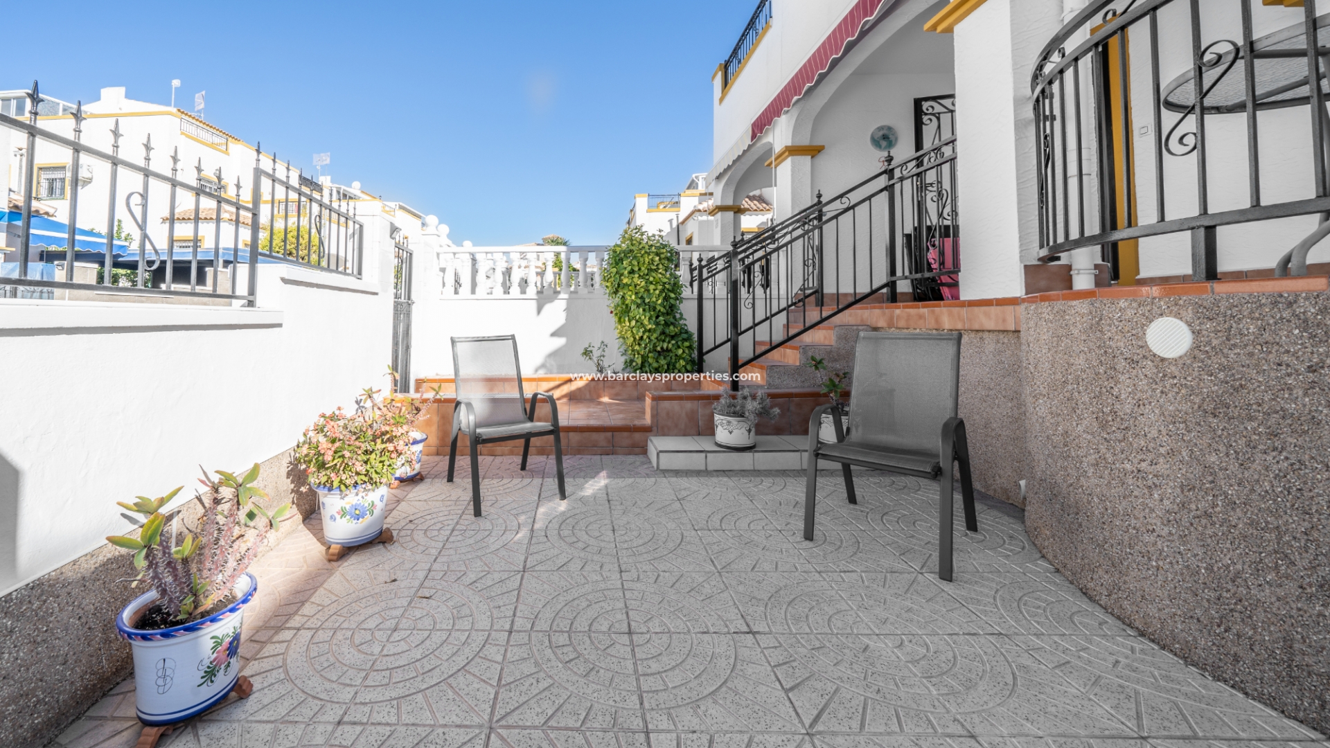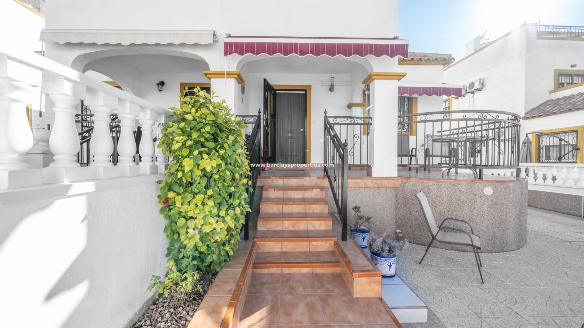 Bij het naderen vind je de overdekte voortuin en het zonneterras met zitgedeeltes die zijn uitgerust met aparte zonneschermen voor de vele zonnige dagen die we hier aan de Costa Blanca hebben, waardoor buiten leven het hele jaar door comfortabel is.
