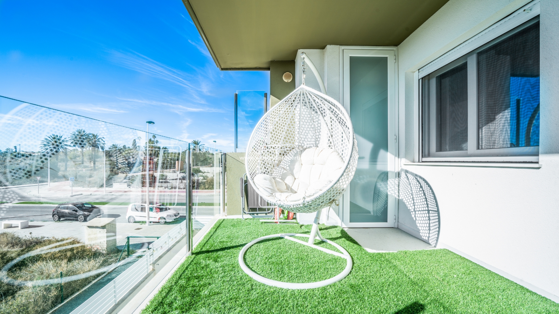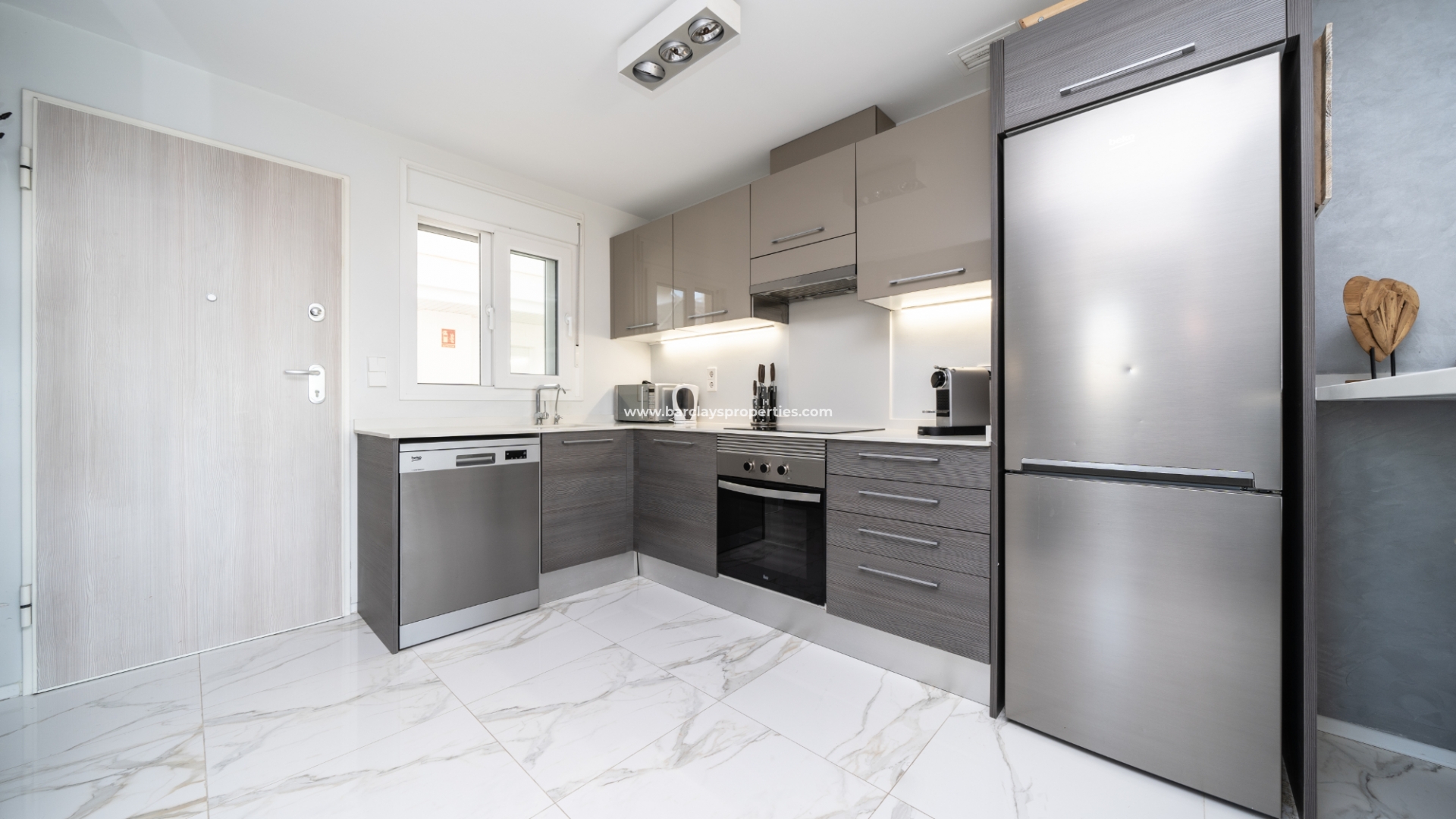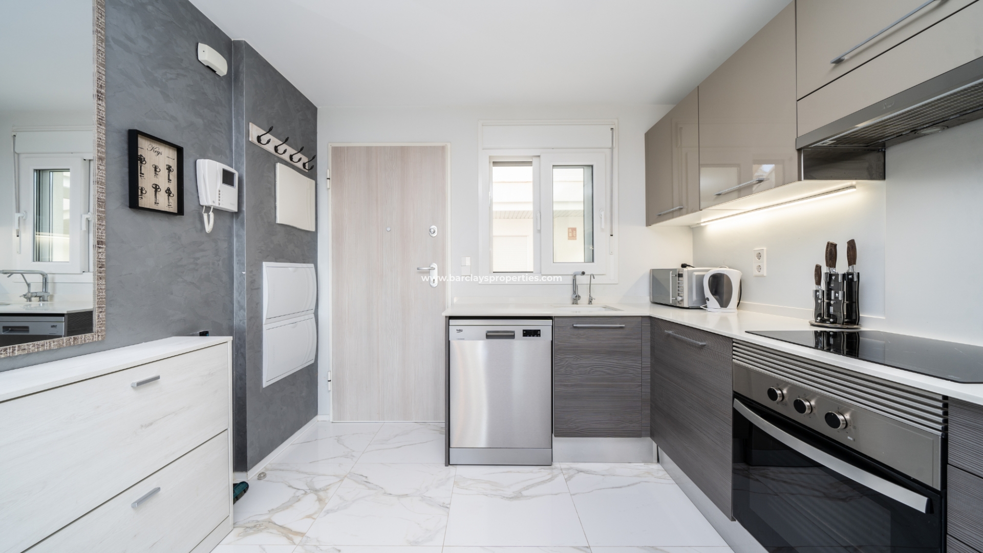 De toegang via de voordeur met beveiliging biedt toegang tot deze prachtige woning, waar we worden verwelkomd door de lichte en luchtige, volledig geïntegreerde moderne keuken met ontbijtbar, die naadloos overgaat in de eet-/woonkamer met toegang tot het op het zuiden gelegen zonneterras met kunstgras en een ontspannen loungegedeelte. Twee tweepersoonsslaapkamers en een familiebadkamer met inloopdouche staan tot je beschikking, en de hoofdslaapkamer heeft een mooie en-suite voor extra comfort.
