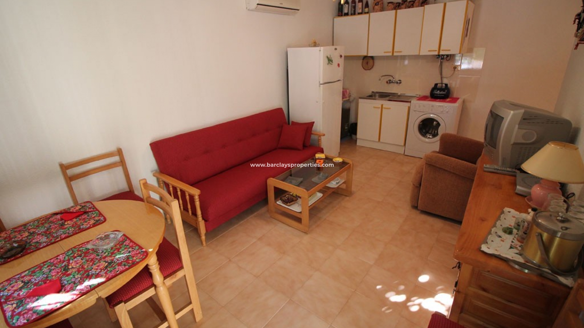 De accommodatie heeft een zonneterras aan de voorzijde met zitplaatsen buiten waar u het hele jaar door van het Spaanse weer kunt genieten. U heeft toegang tot de accommodatie vanaf het terras, waar u de woonkamer met airconditioning en plafondventilatoren vindt. De woonkamer biedt een eetkamer gebied en een open keuken, twee slaapkamers en een badkamer.