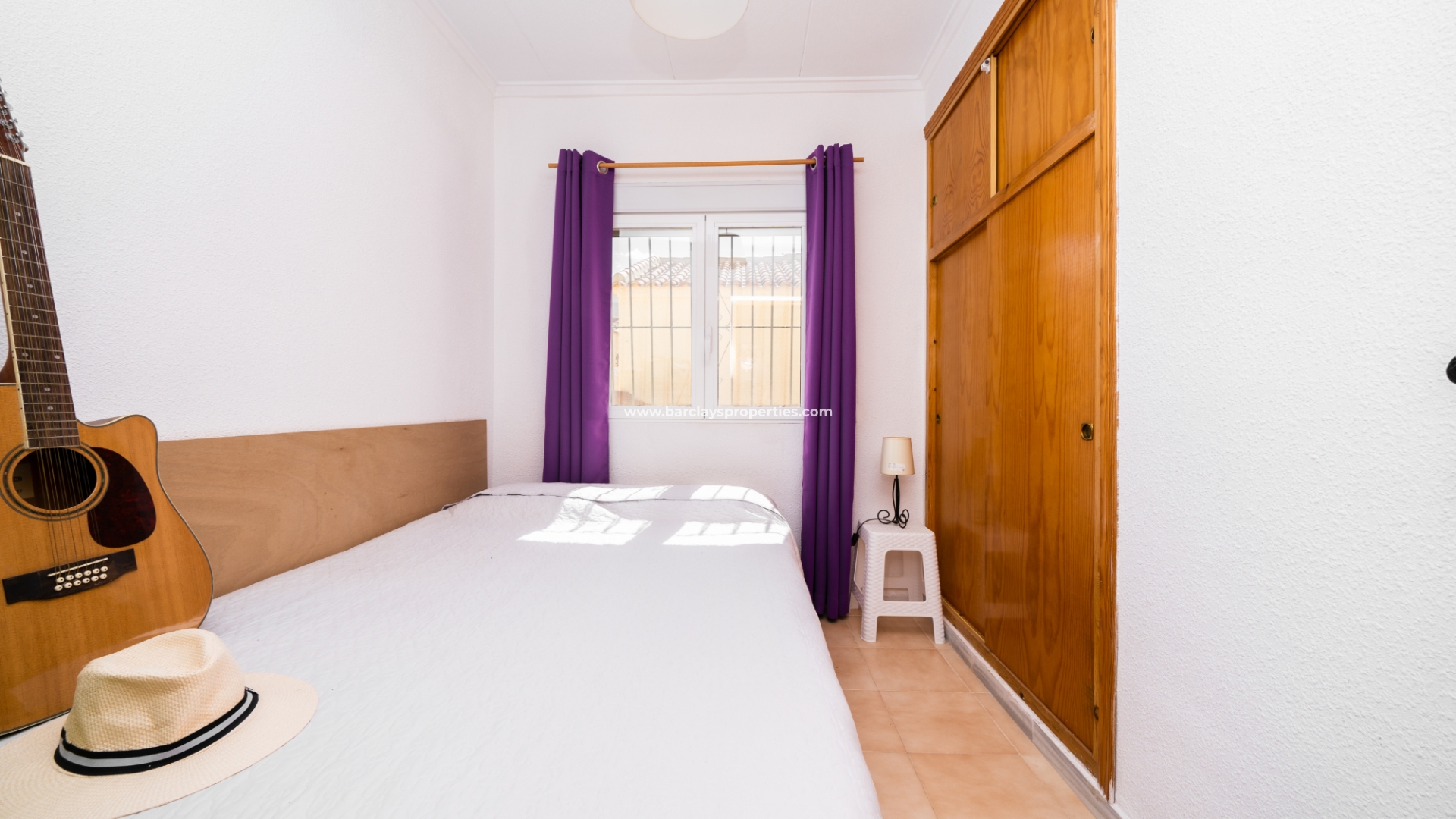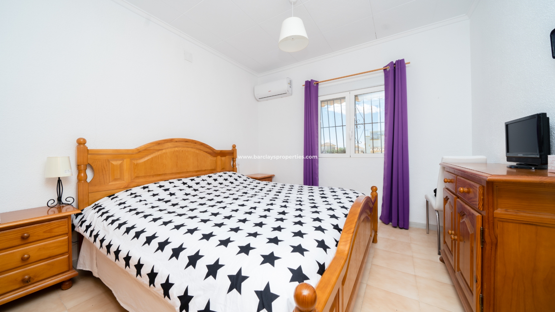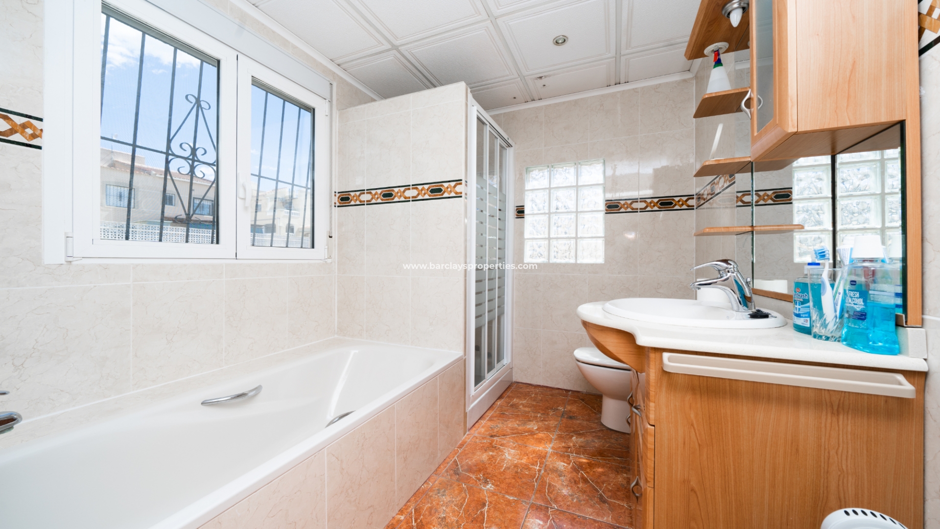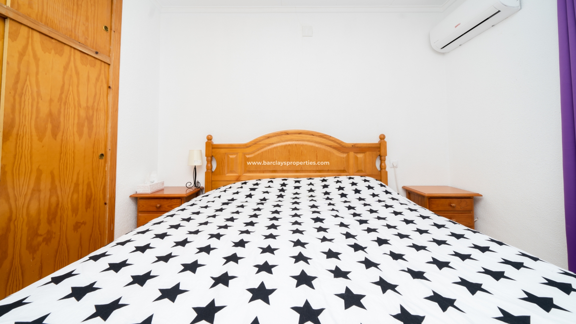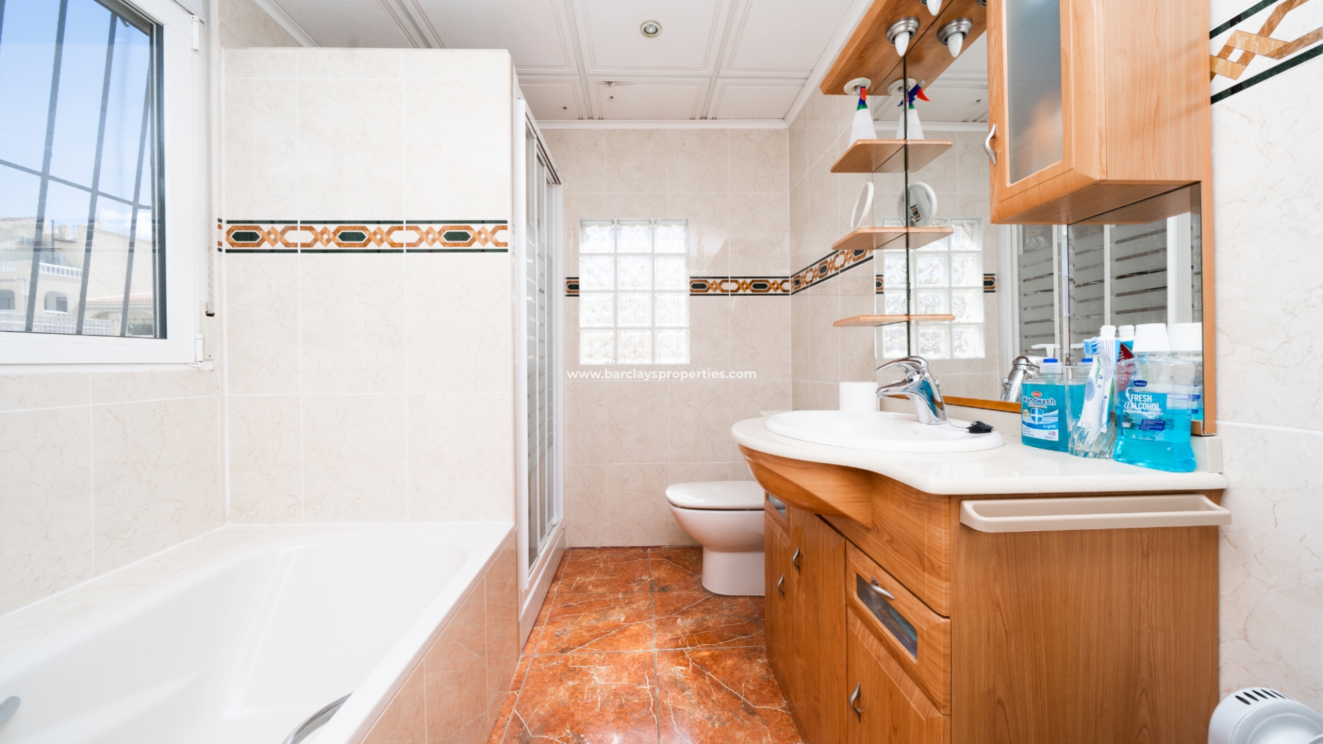 De slaapkamers zijn doordacht ontworpen met inbouwkasten, waarbij opslagruimte wordt gemaximaliseerd zonder ruimte op te offeren. Een van de slaapkamers is voorzien van airconditioning voor extra comfort. De uitgebreide badkamer is een toevluchtsoord van luxe, compleet met een ligbad van normaal formaat, een hoekdouche, wastafel en toilet, allemaal elegant betegeld voor een verfijnde afwerking.