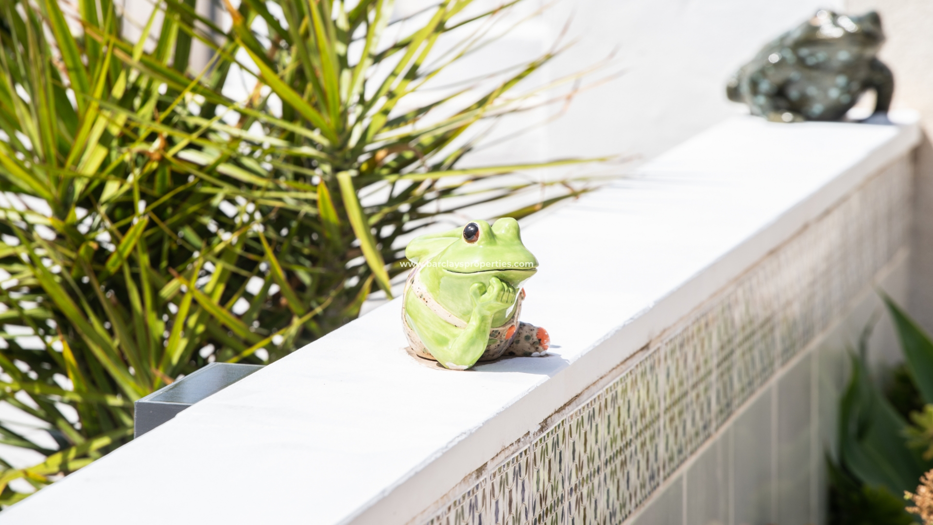 Bij aankomst word je begroet door een voorterras, strategisch gelegen op het zuidwesten om de warmte van de zon op te vangen. In de buurt biedt een gemeenschappelijk zwembad een verfrissende oase, terwijl een handige carport zorgt voor gemakkelijk parkeren.