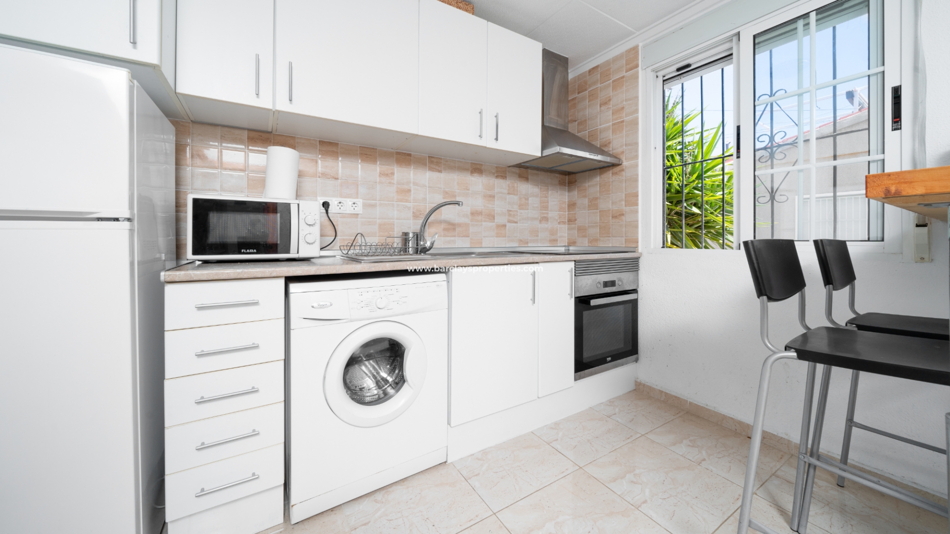 Dit juweeltje van een woning heeft een totale bebouwde oppervlakte van 28 m², alles op één niveau, met 1 slaapkamer en 1 badkamer. De open moderne keuken omvat stijlvolle witte units, een handige ontbijtbar en een volledig elektrische opstelling, waardoor er een functionele ruimte is voor koken en dineren. De uitnodigende woonkamer is voorzien van een slaapbank, plafondventilator en openslaande deuren naar het op het zuiden gelegen balkon, dat een heerlijke plek biedt om te ontspannen. De tweepersoons slaapkamer beschikt over een en-suite badkamer die volledig betegeld is en voorzien van een douche met scherm, toilet en een wastafel.