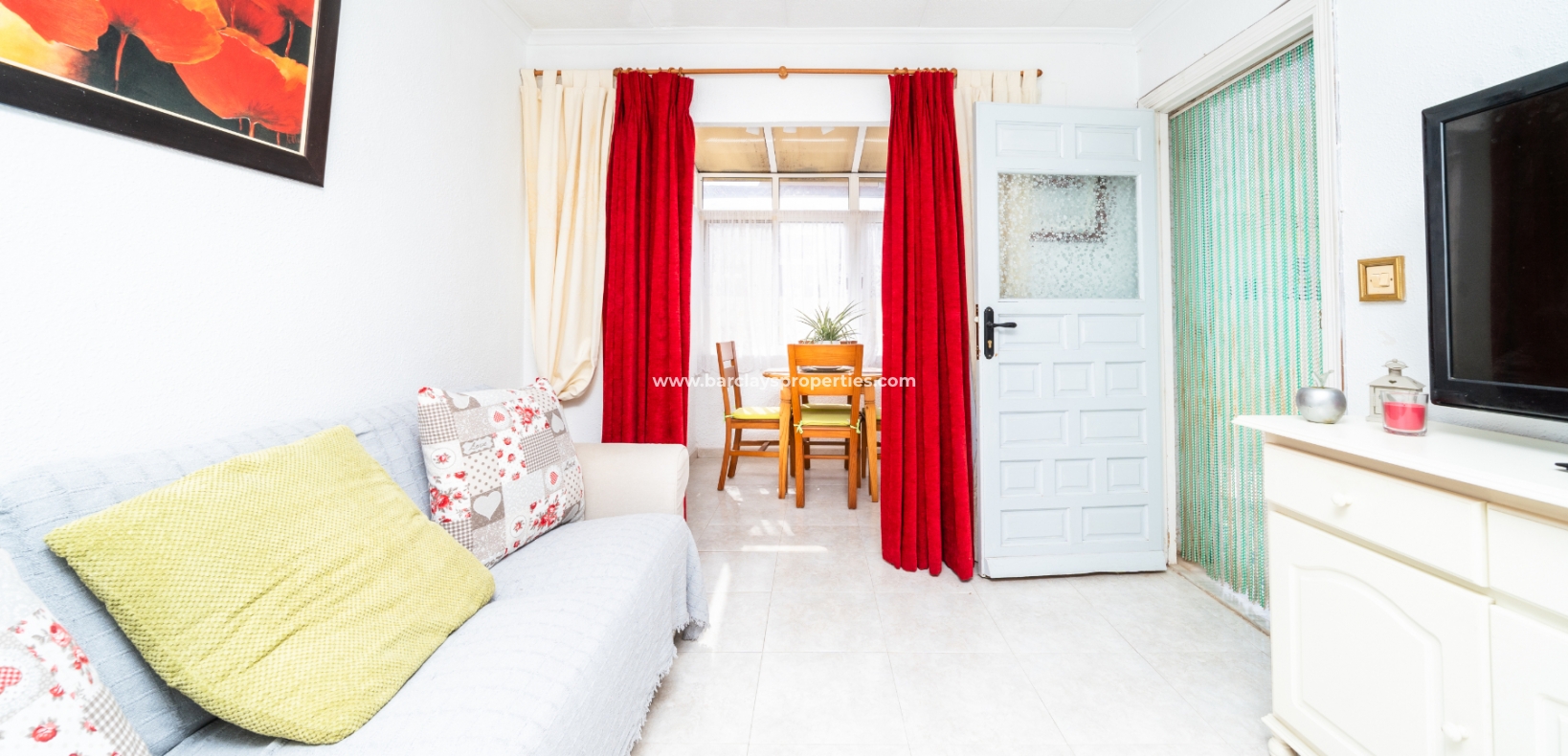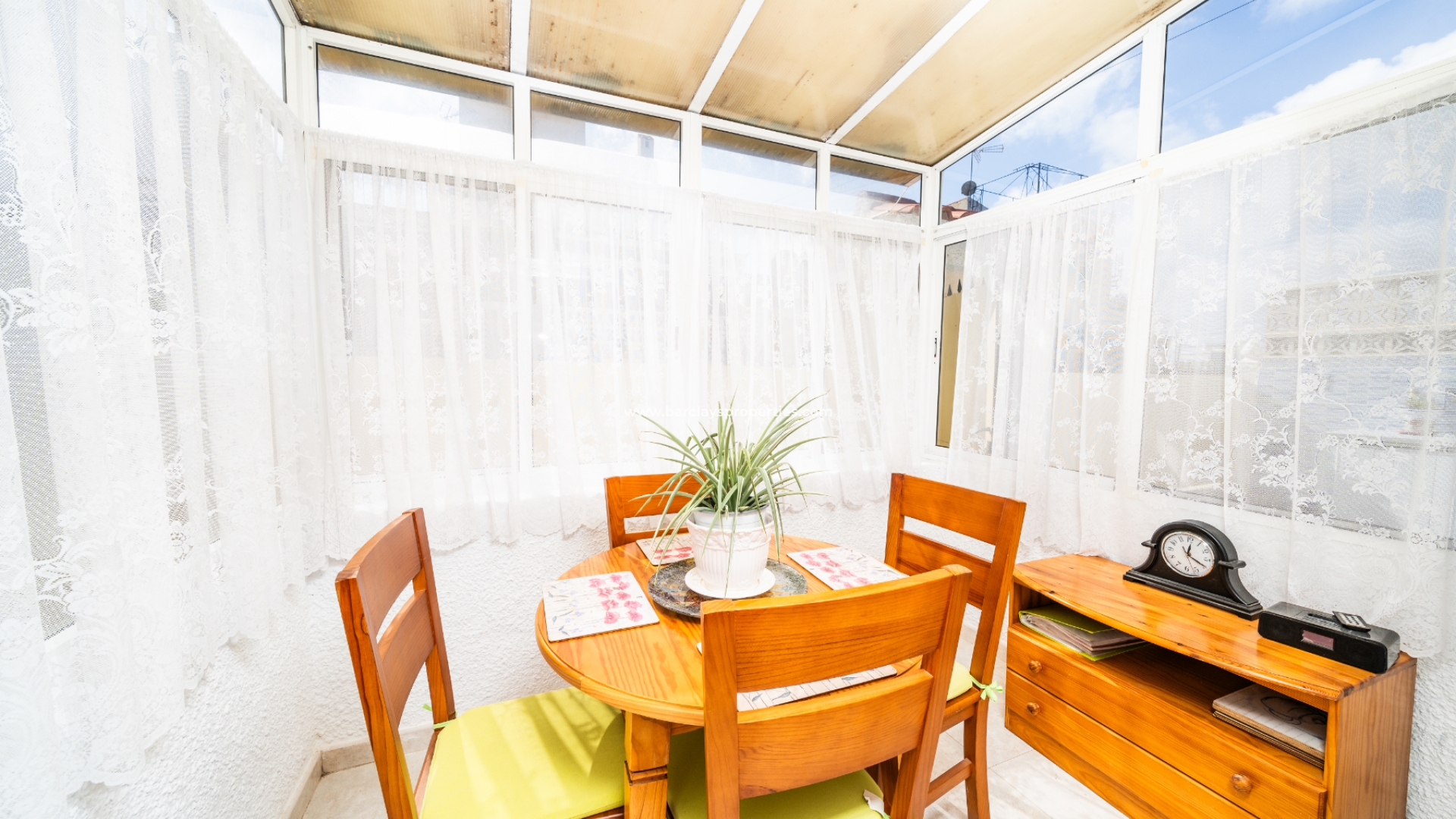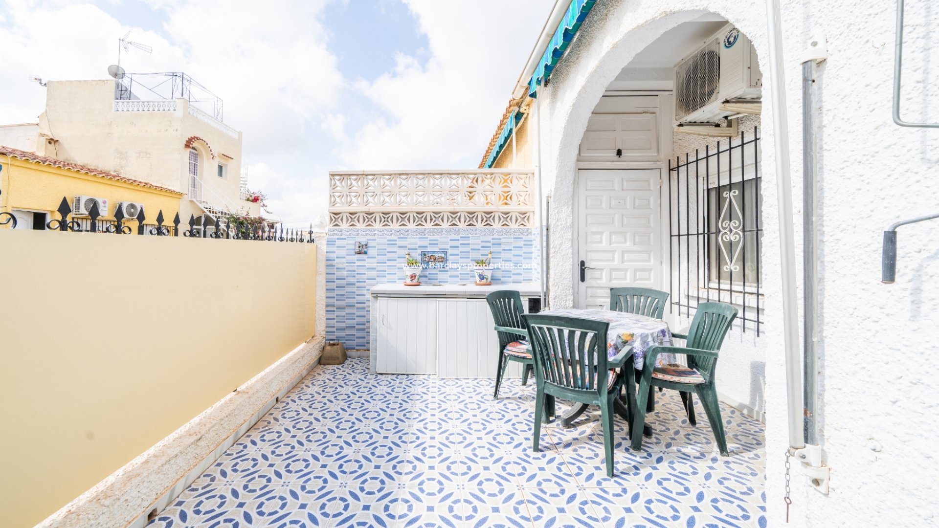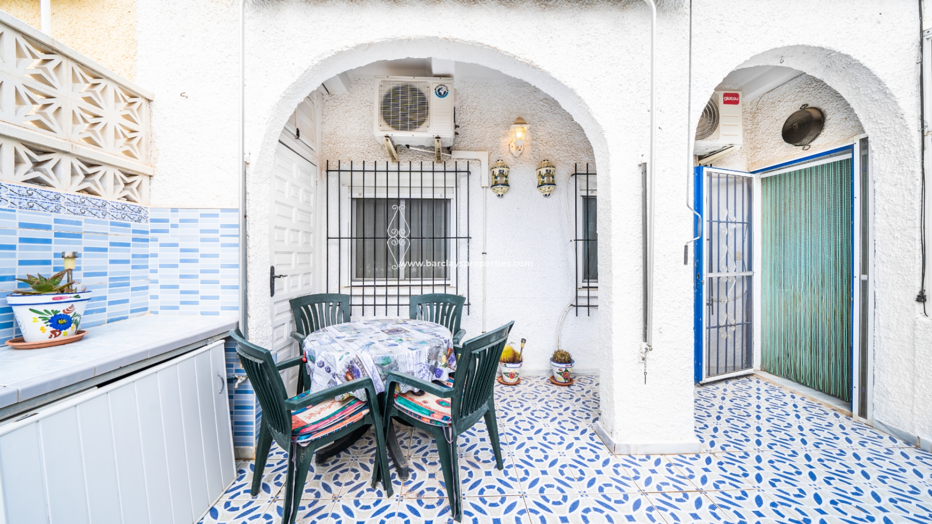 Deze geschakelde woning, een model "Fina", staat te koop in Urb. La Marina en ligt in een rustige omgeving, op slechts een paar minuten rijden van twee levendige winkelgebieden die een brede selectie aan bars en restaurants bieden. Het oostwaarts gelegen huis beschikt over een kleine uitbreiding aan de voorkant.