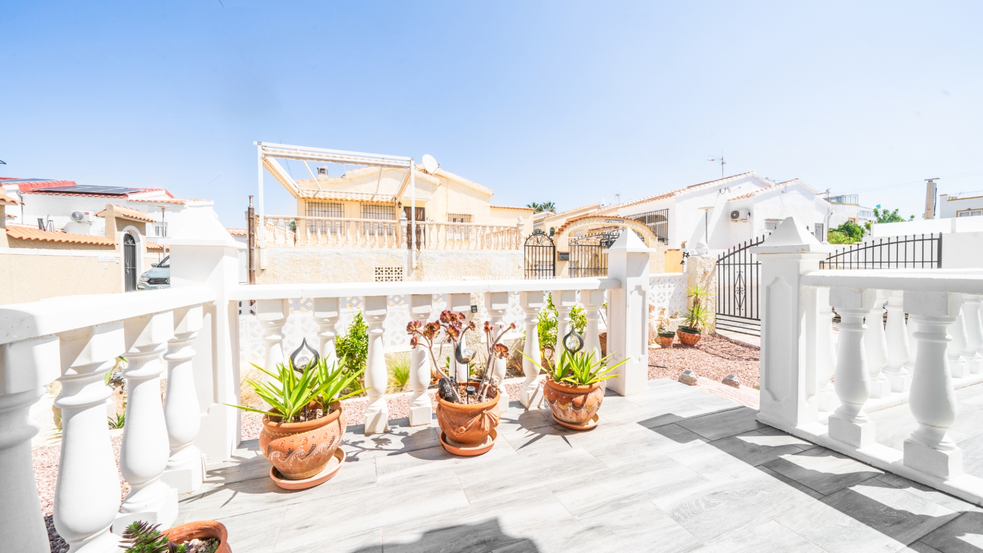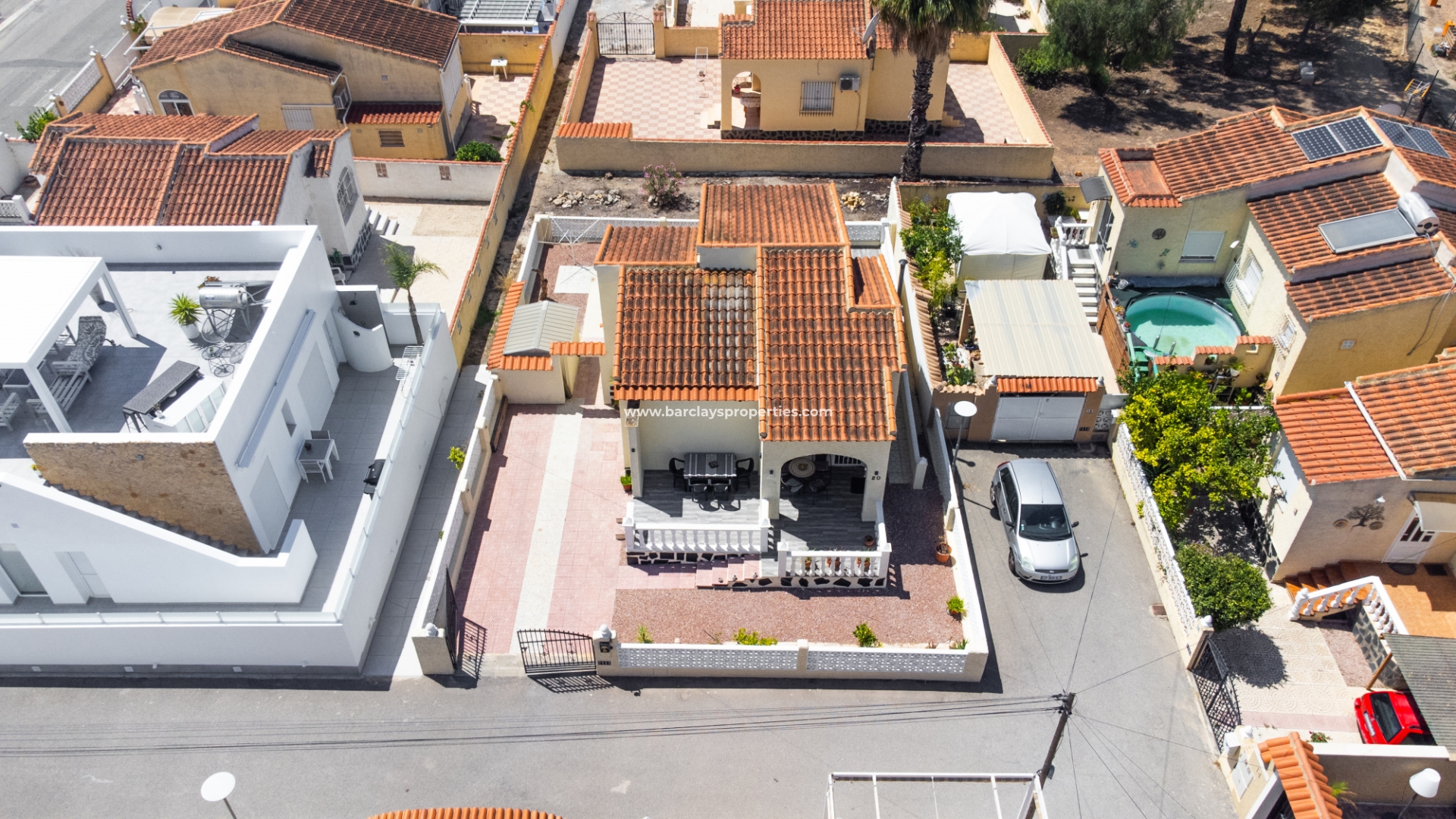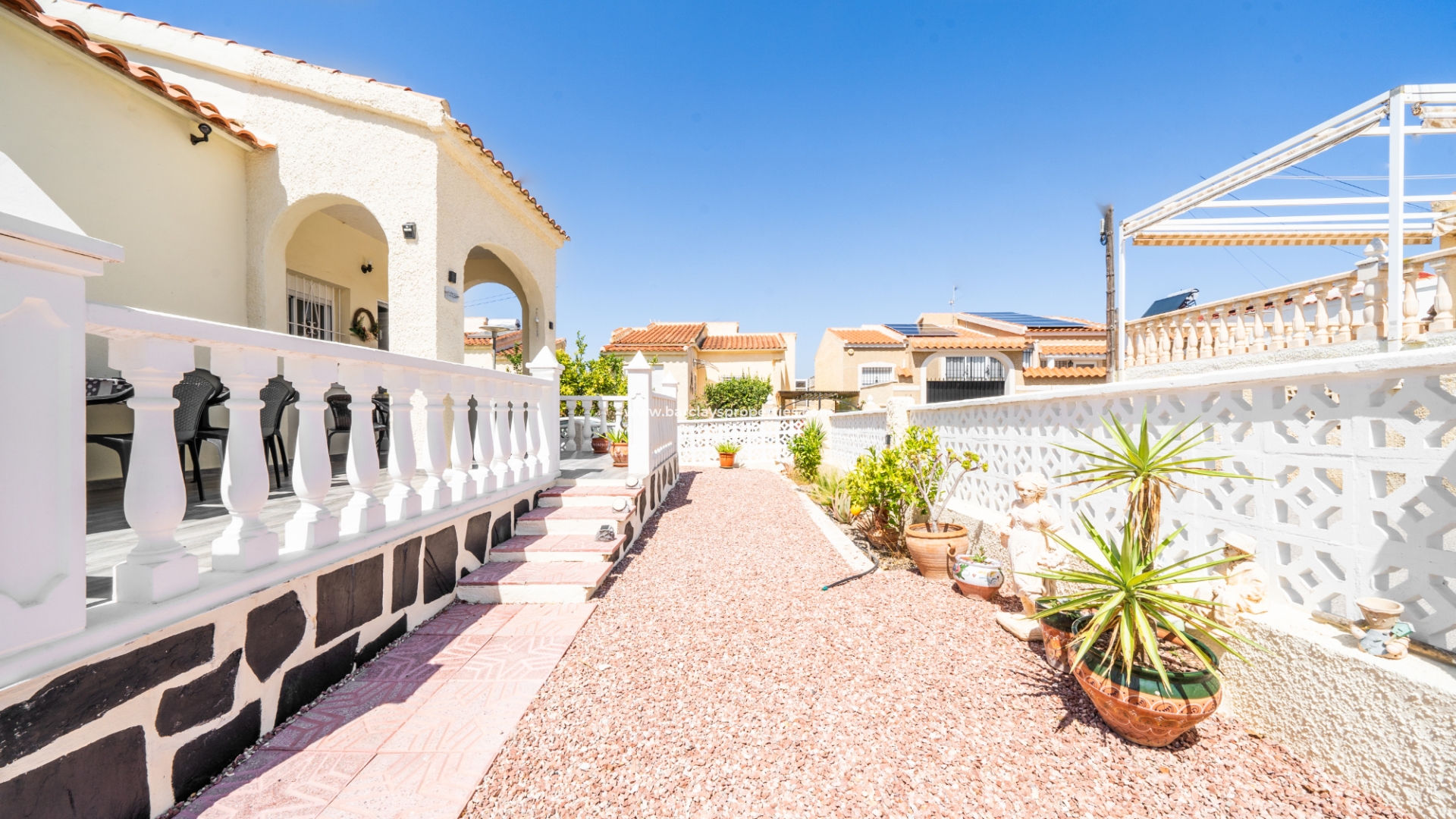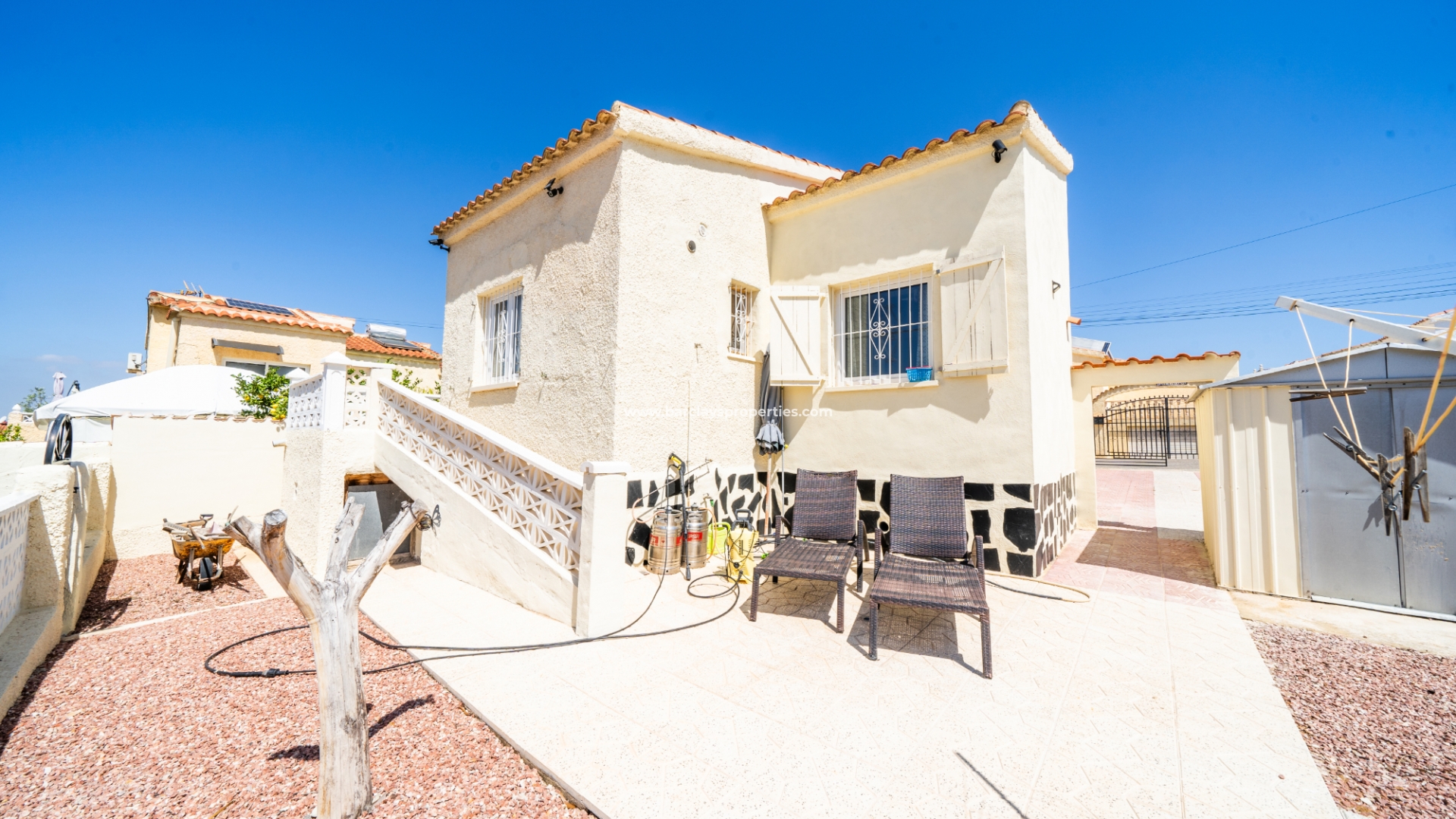 Ontdek deze aantrekkelijke vrijstaande villa, model "Lola", gelegen in een rustige doodlopende straat in het serene Urb. La Marina aan de Costa Blanca. De ingang is via de dubbele opritpoorten die leiden naar de off-road parkeerplaats die is geplaveid. De rest van de voortuin heeft een mix van bestrating en grindgebieden voor minimaal onderhoud. De achtertuin biedt voldoende ruimte voor een klein zwembad✅ en omvat een metalen schuur voor extra opslag. De woning kijkt uit op een groen gebied en volkstuintjes, wat zorgt voor een rustige achtergrond.