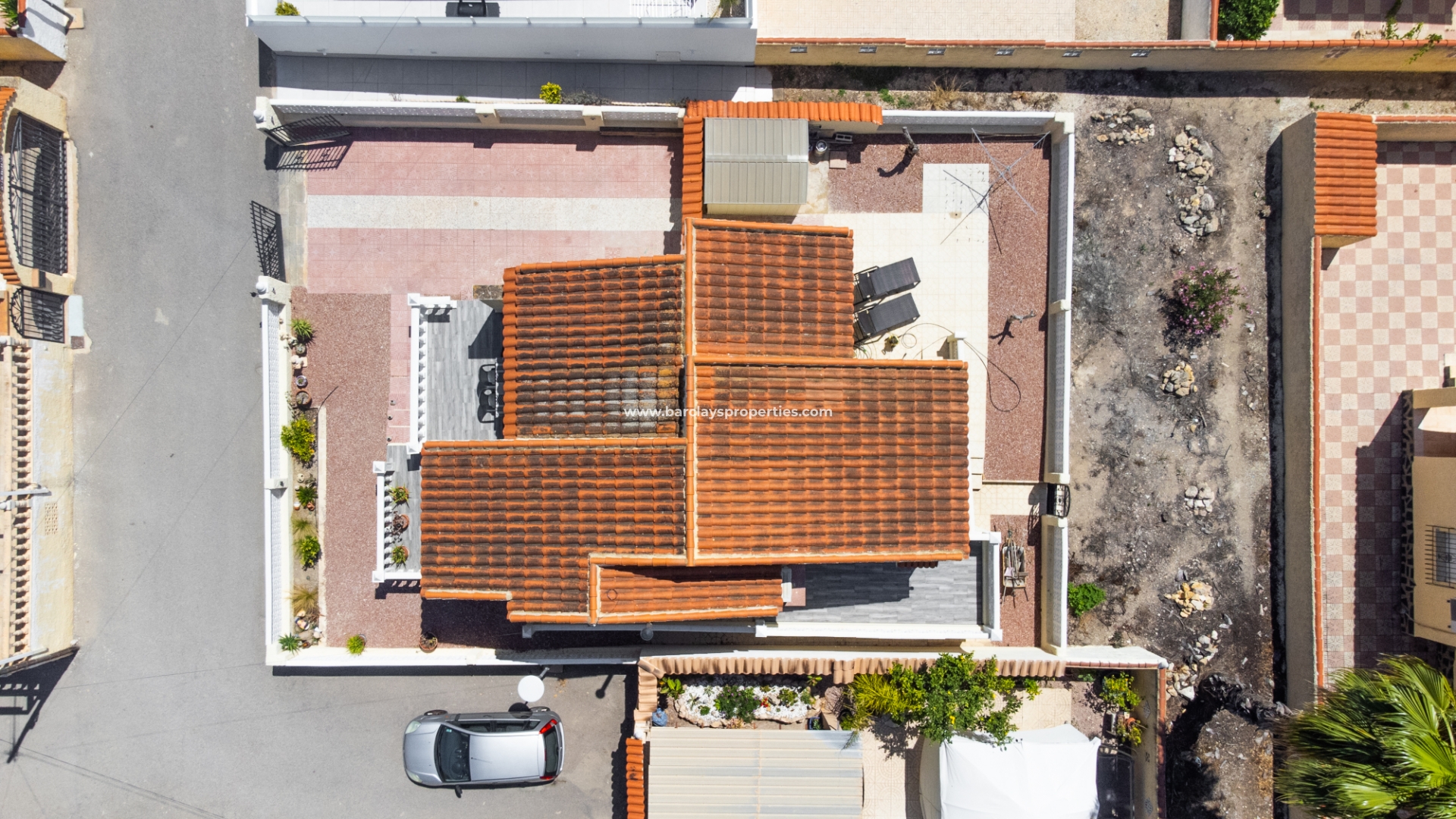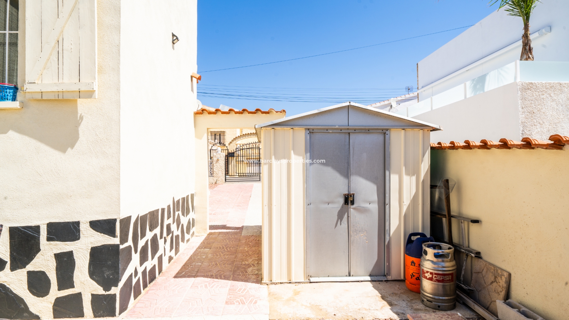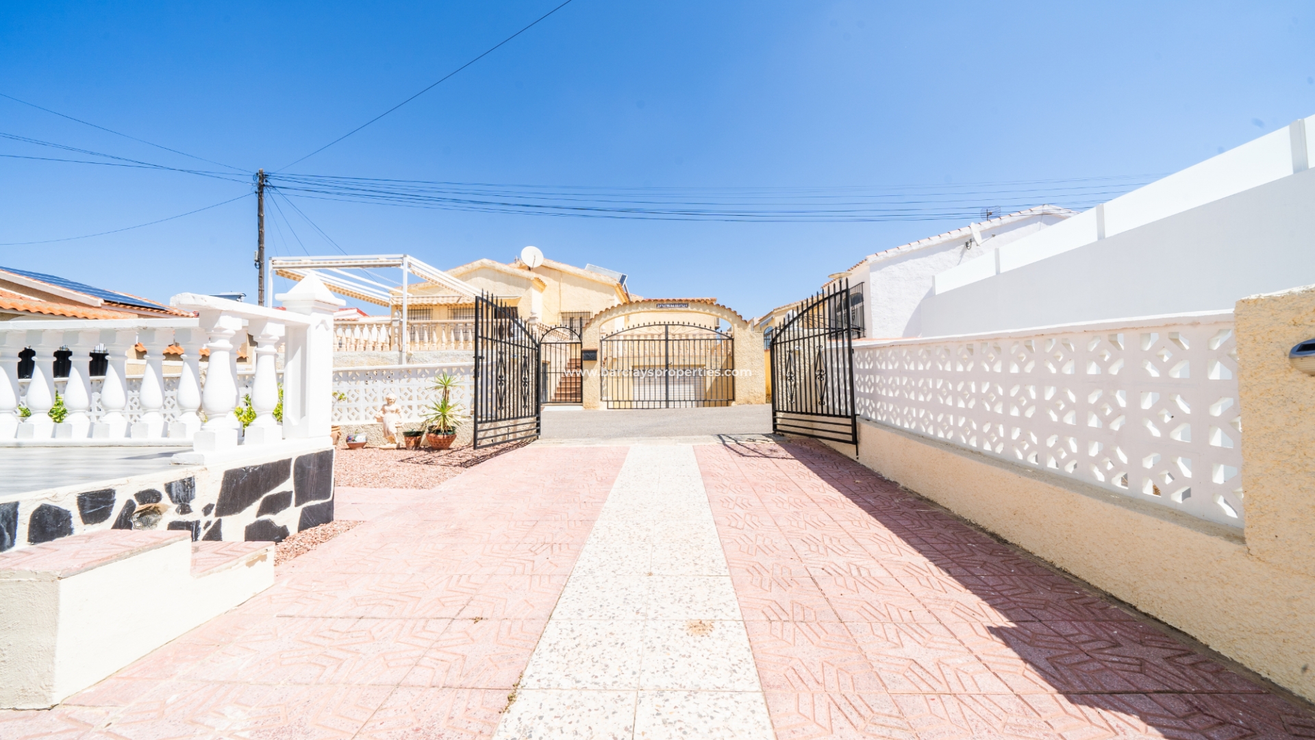 Ontdek deze aantrekkelijke vrijstaande villa, model "Lola", gelegen in een rustige doodlopende straat in het serene Urb. La Marina aan de Costa Blanca. De ingang is via de dubbele opritpoorten die leiden naar de off-road parkeerplaats die is geplaveid. De rest van de voortuin heeft een mix van bestrating en grindgebieden voor minimaal onderhoud. De achtertuin biedt voldoende ruimte voor een klein zwembad✅ en omvat een metalen schuur voor extra opslag. De woning kijkt uit op een groen gebied en volkstuintjes, wat zorgt voor een rustige achtergrond.
