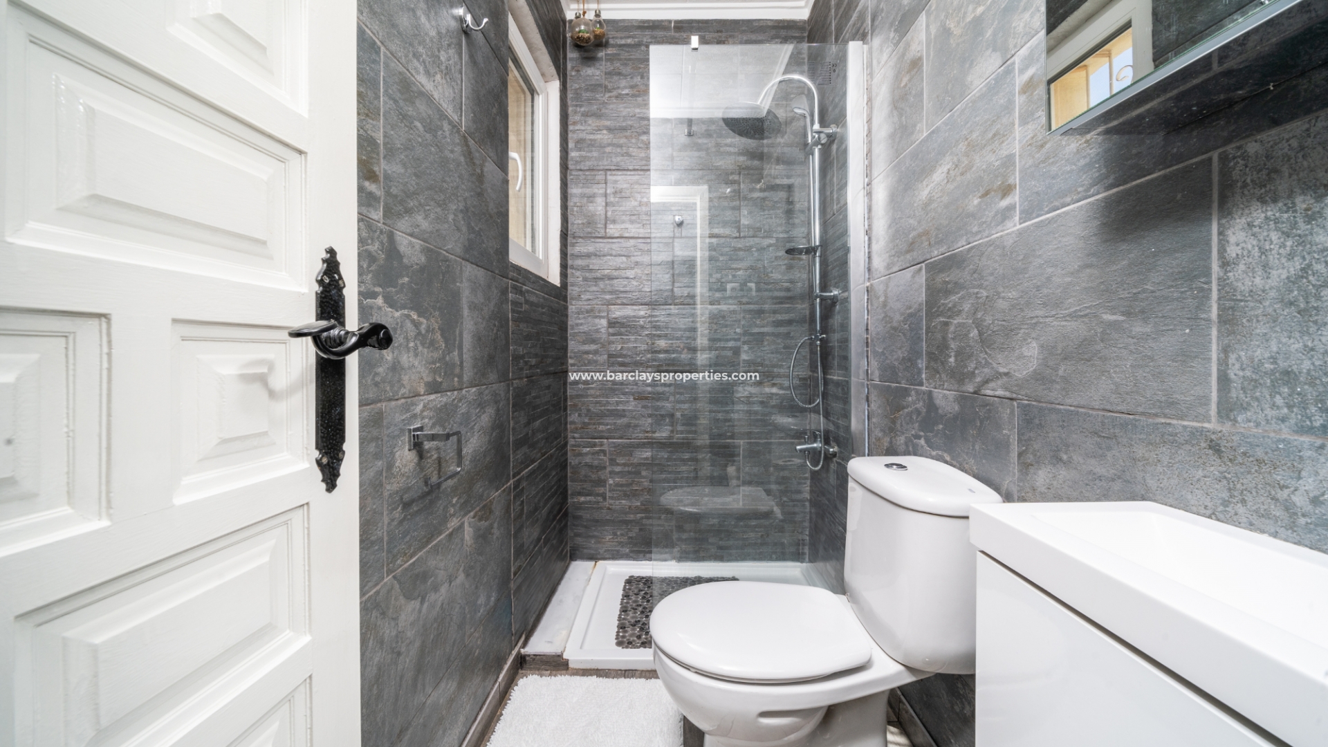 De villa omvat twee slaapkamers: een tweepersoonskamer met een grote kast voor voldoende opbergruimte, en nog een tweepersoonskamer, perfect voor gasten of als thuiskantoor. De modern gerenoveerde badkamer beschikt over een inloopdouche met scherm, toilet en wastafel.