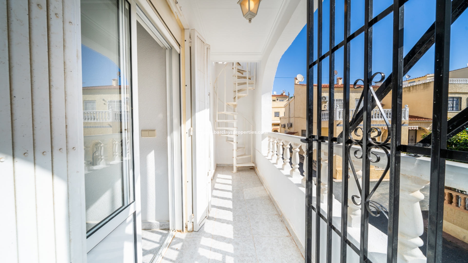 Terug op het balkon vinden we een wenteltrap die ons naar het ruime privé zonneterras van deze woning brengt, dat ook een grote berging heeft.