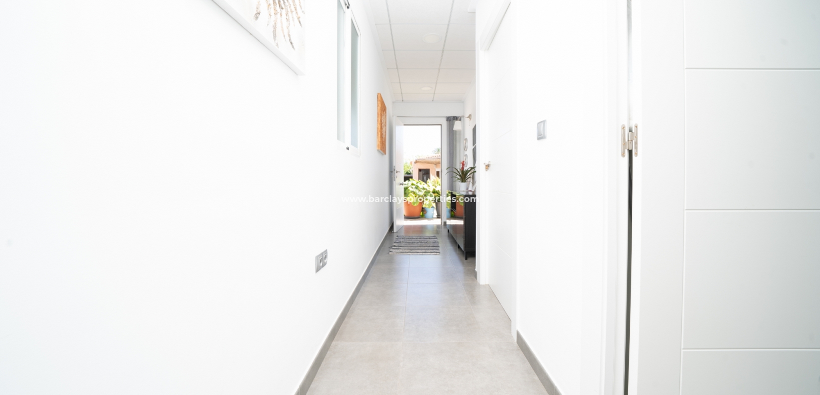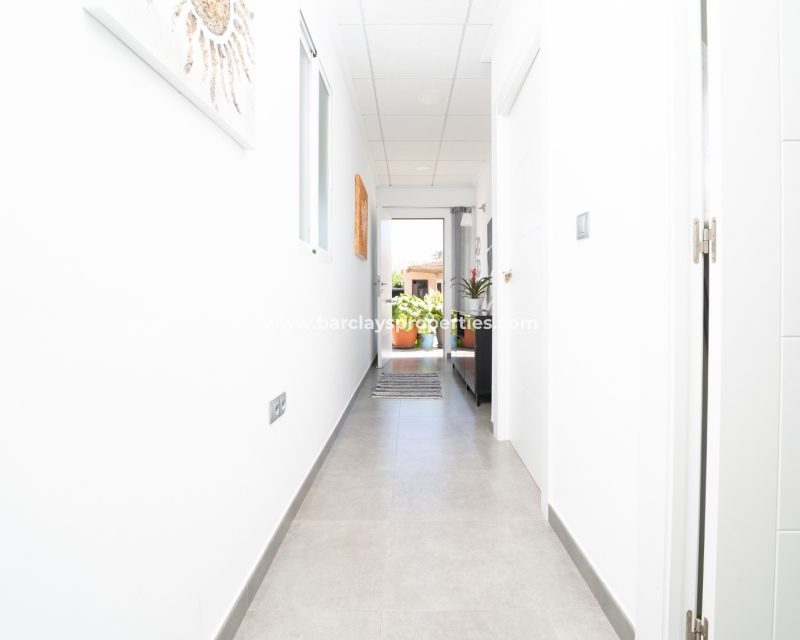 Het interieur is afgewerkt met gladde muren, wat een moderne uitstraling geeft. We worden verwelkomd door een hal die leidt naar een zitkamer en een grote bijkeuken die een 9-deurs opbergkast, wasmachine en droger biedt.