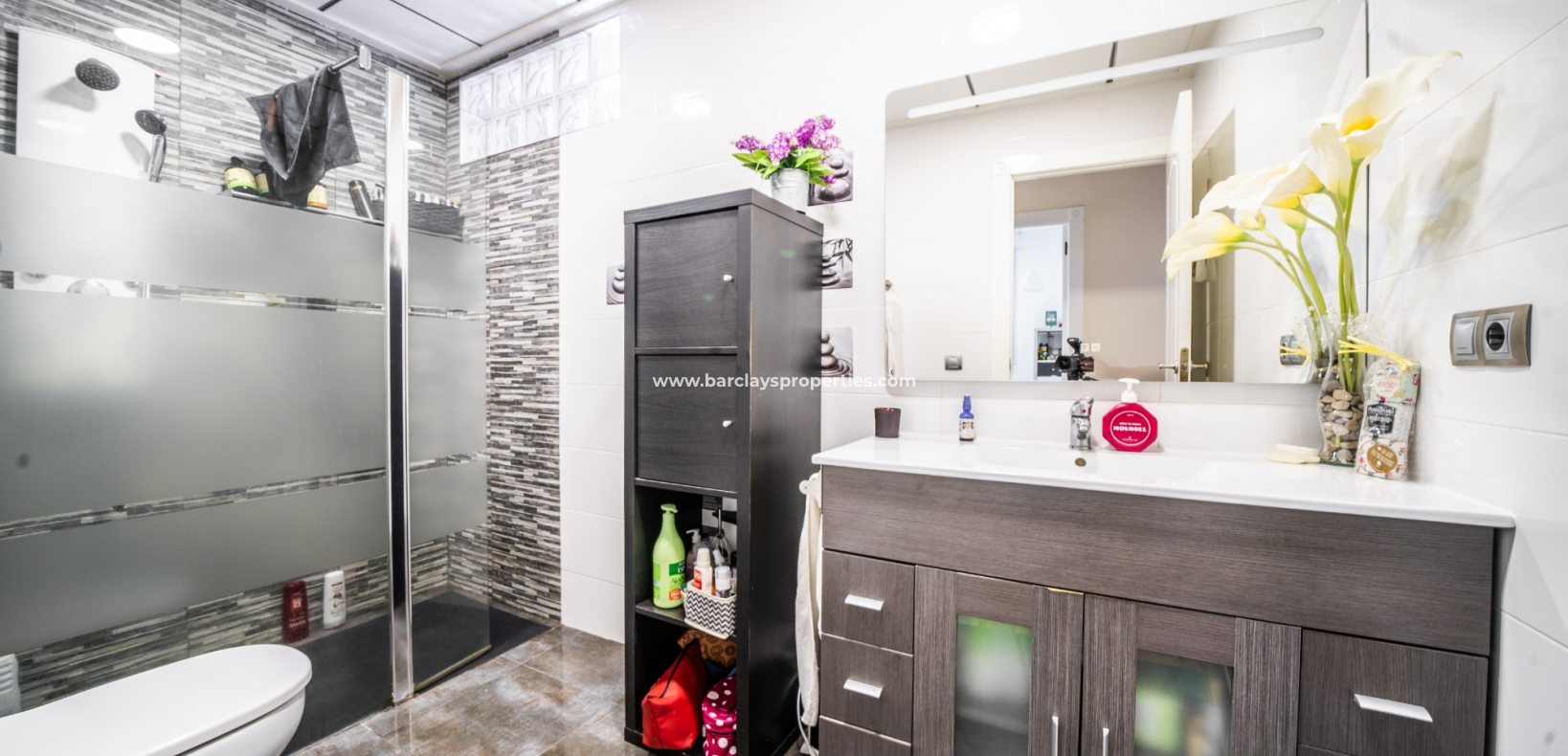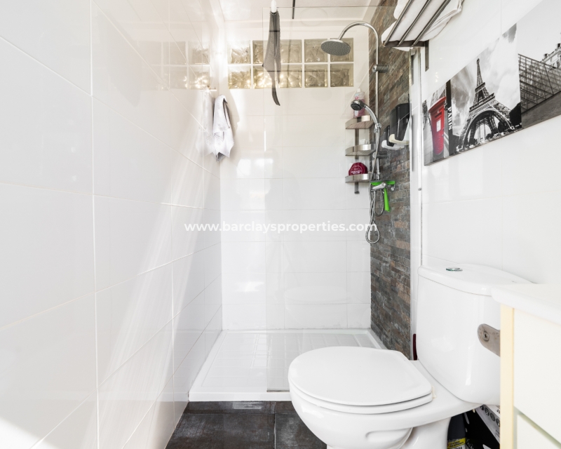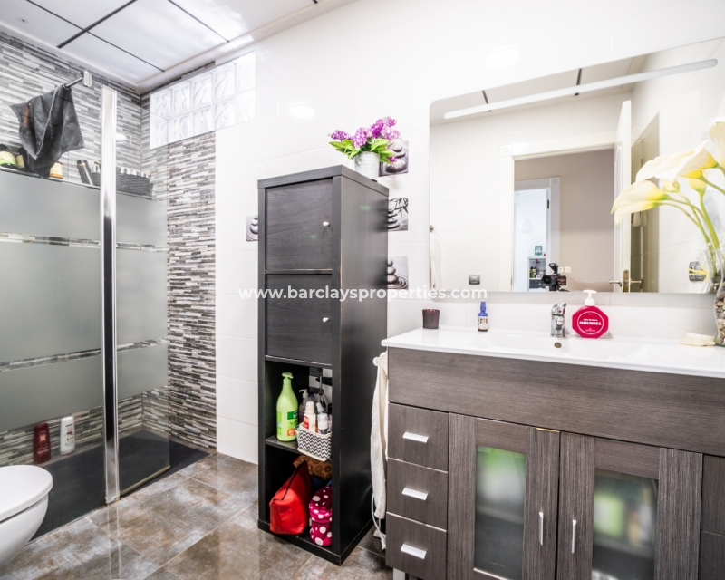 De slaapkamers in deze woning omvatten een tweepersoonsslaapkamer met een 8-deurs inbouwkast ✅en spotlights, toegankelijk via een prachtige glas-in-looddeur vanuit de woonkamer, nog twee tweepersoonsslaapkamers en een eenpersoonskamer die groot genoeg is om een tweepersoonskamer te zijn. De badkamer is ontworpen met een grote douche, wastafelmeubel, WC en bidet. Daarnaast is er een airconditioning unit geïnstalleerd in de gang die naar de slaapkamers leidt voor extra comfort.