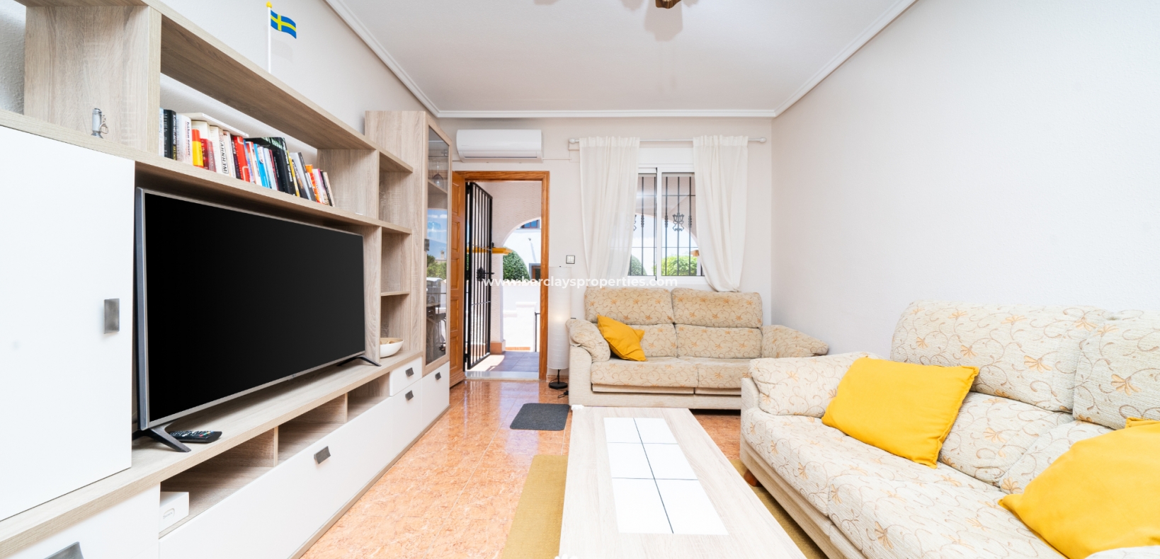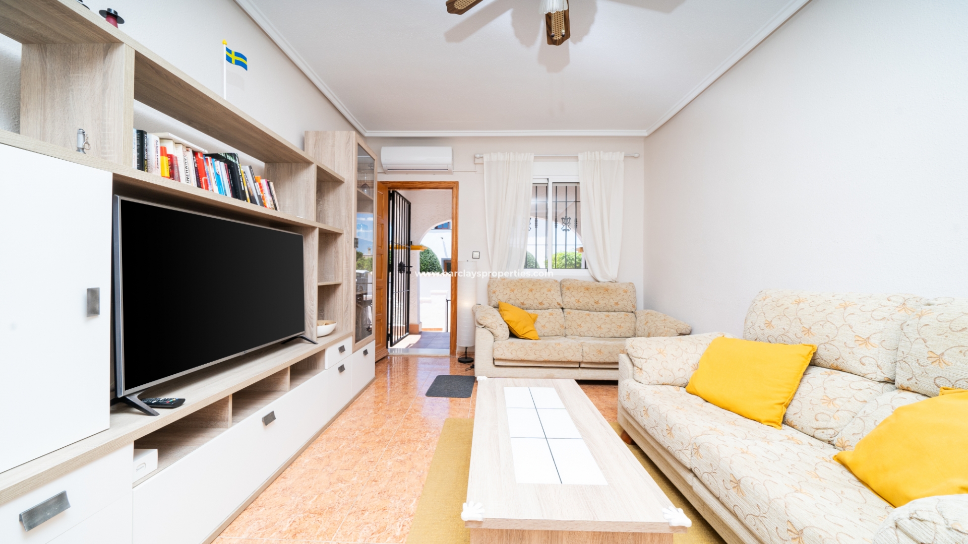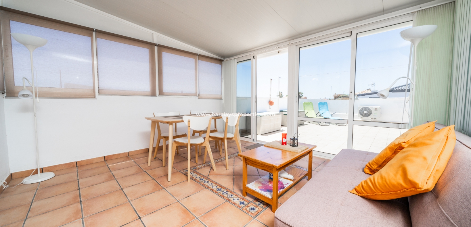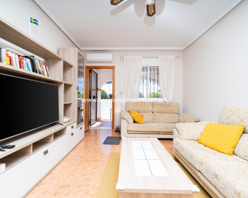 Buitenleven gaat verder in de betegelde en grindtuin en een uitgebreide zonneterras. Vanuit het overdekte veranda gebied, betreden we deze quad villa om de luchtige en lichte woonkamer te vinden, die is uitgerust met een plafondventilator en een nieuw geïnstalleerd airconditioningsysteem, dat comfort het hele jaar door verzekert.