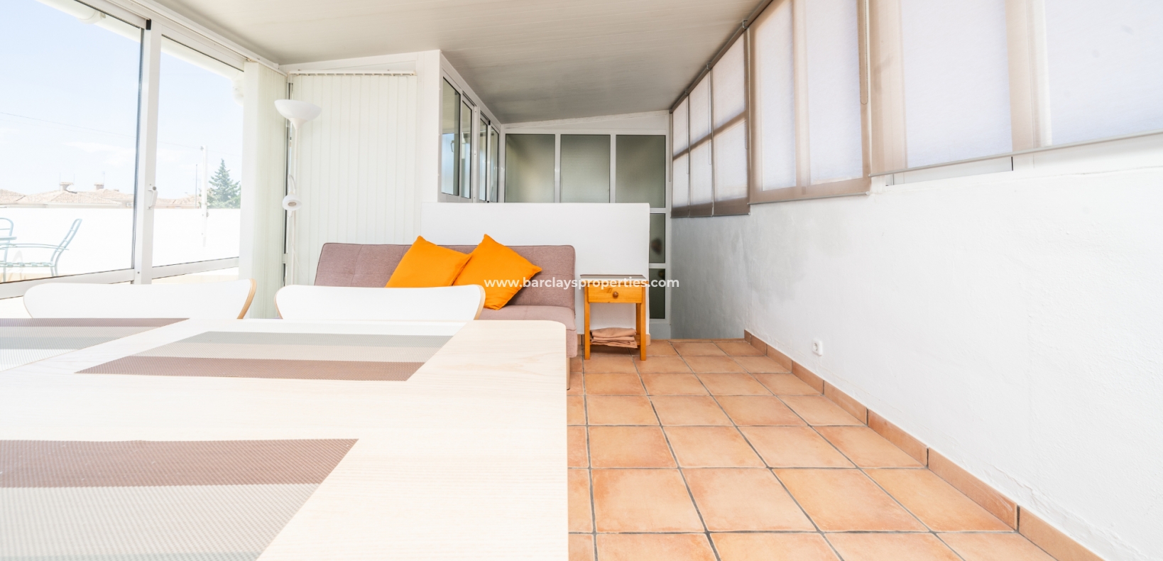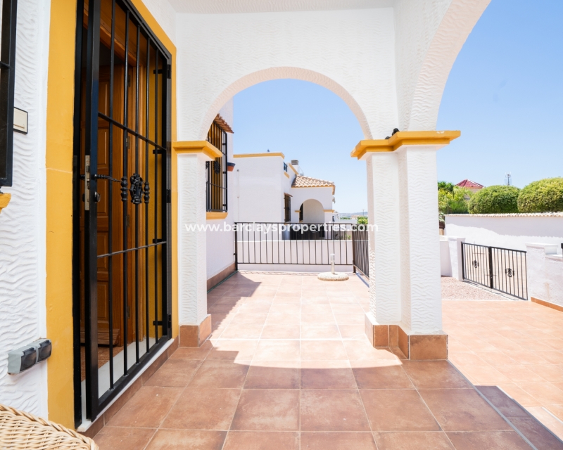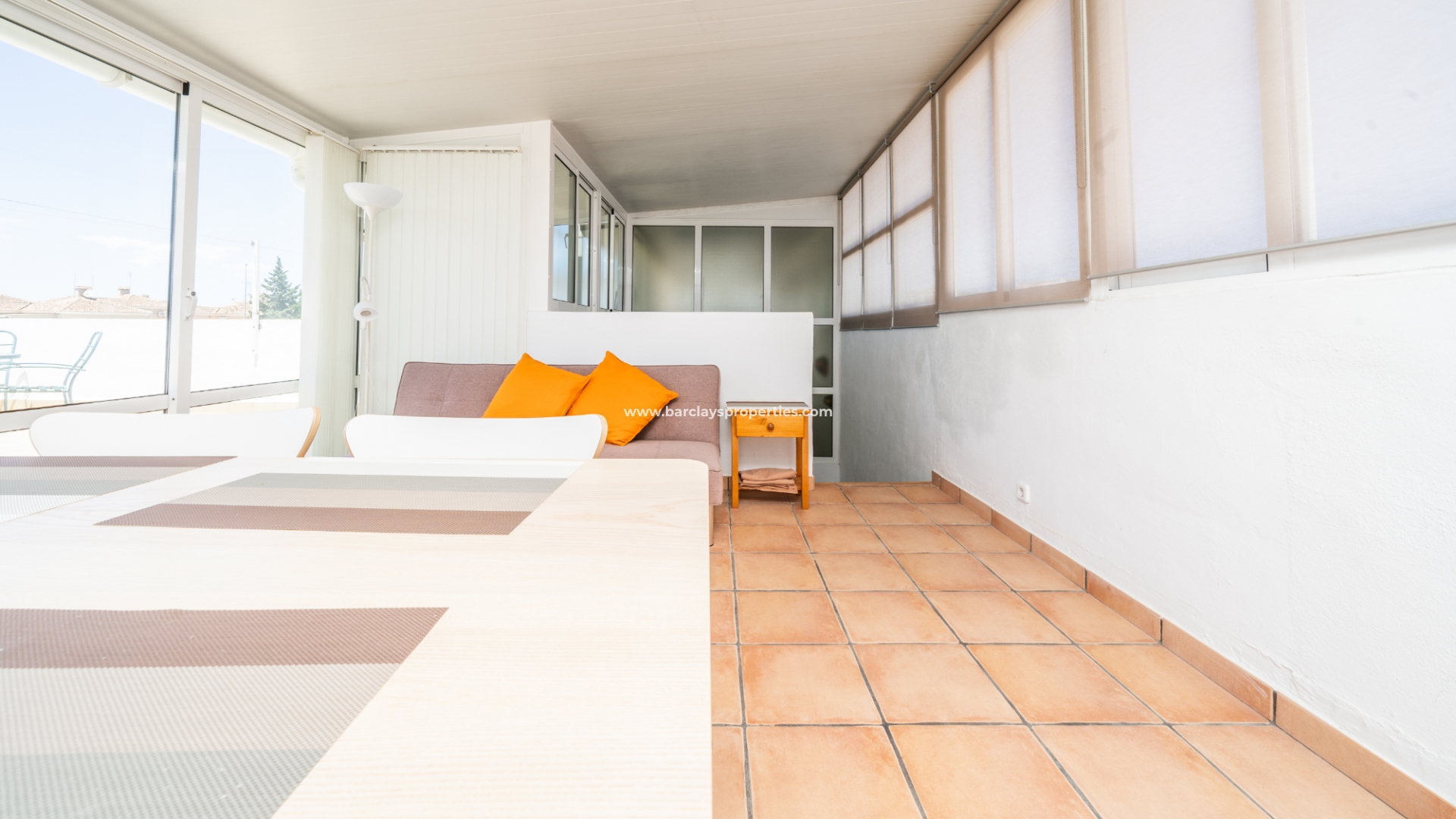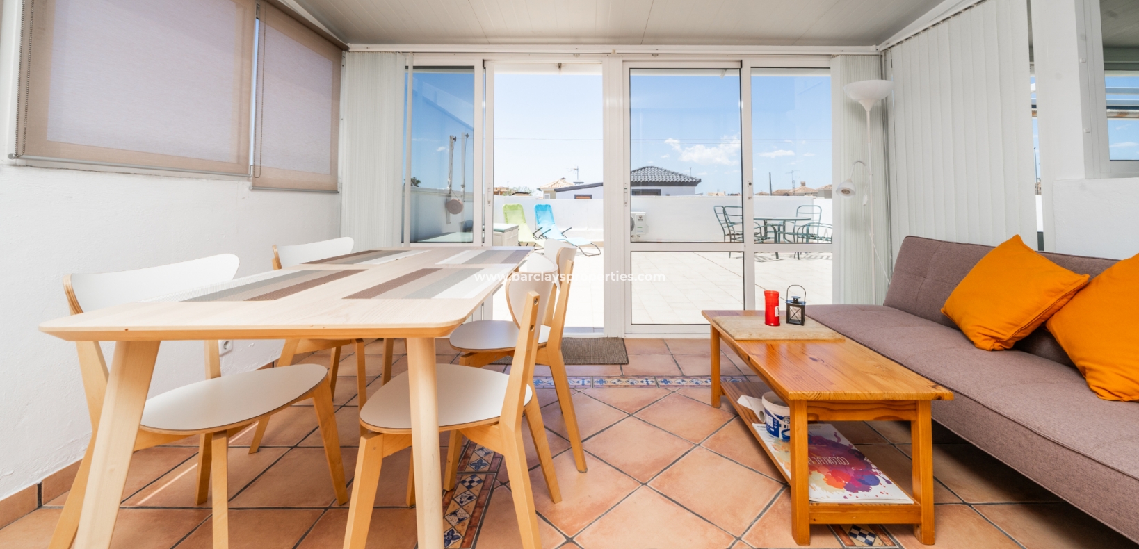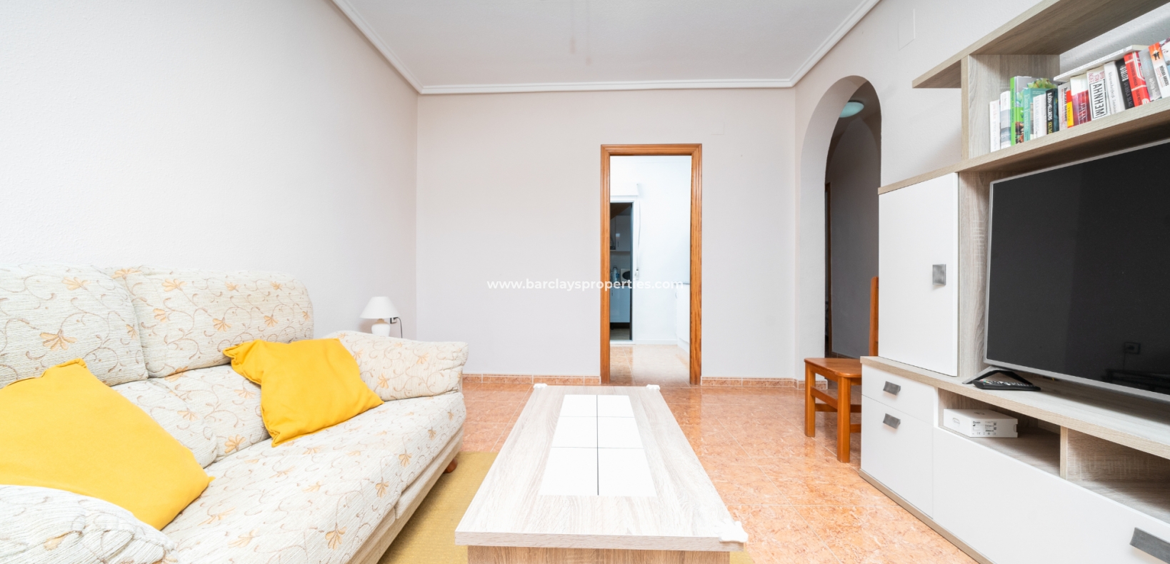 Buitenleven gaat verder in de betegelde en grindtuin en een uitgebreide zonneterras. Vanuit het overdekte veranda gebied, betreden we deze quad villa om de luchtige en lichte woonkamer te vinden, die is uitgerust met een plafondventilator en een nieuw geïnstalleerd airconditioningsysteem, dat comfort het hele jaar door verzekert.