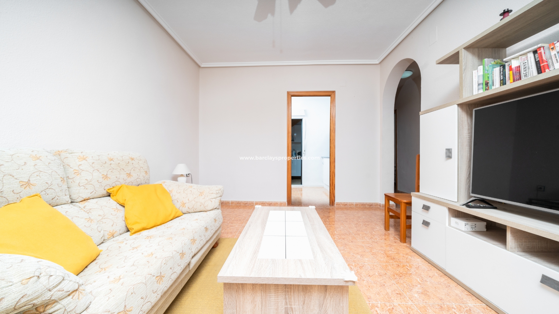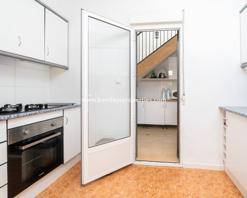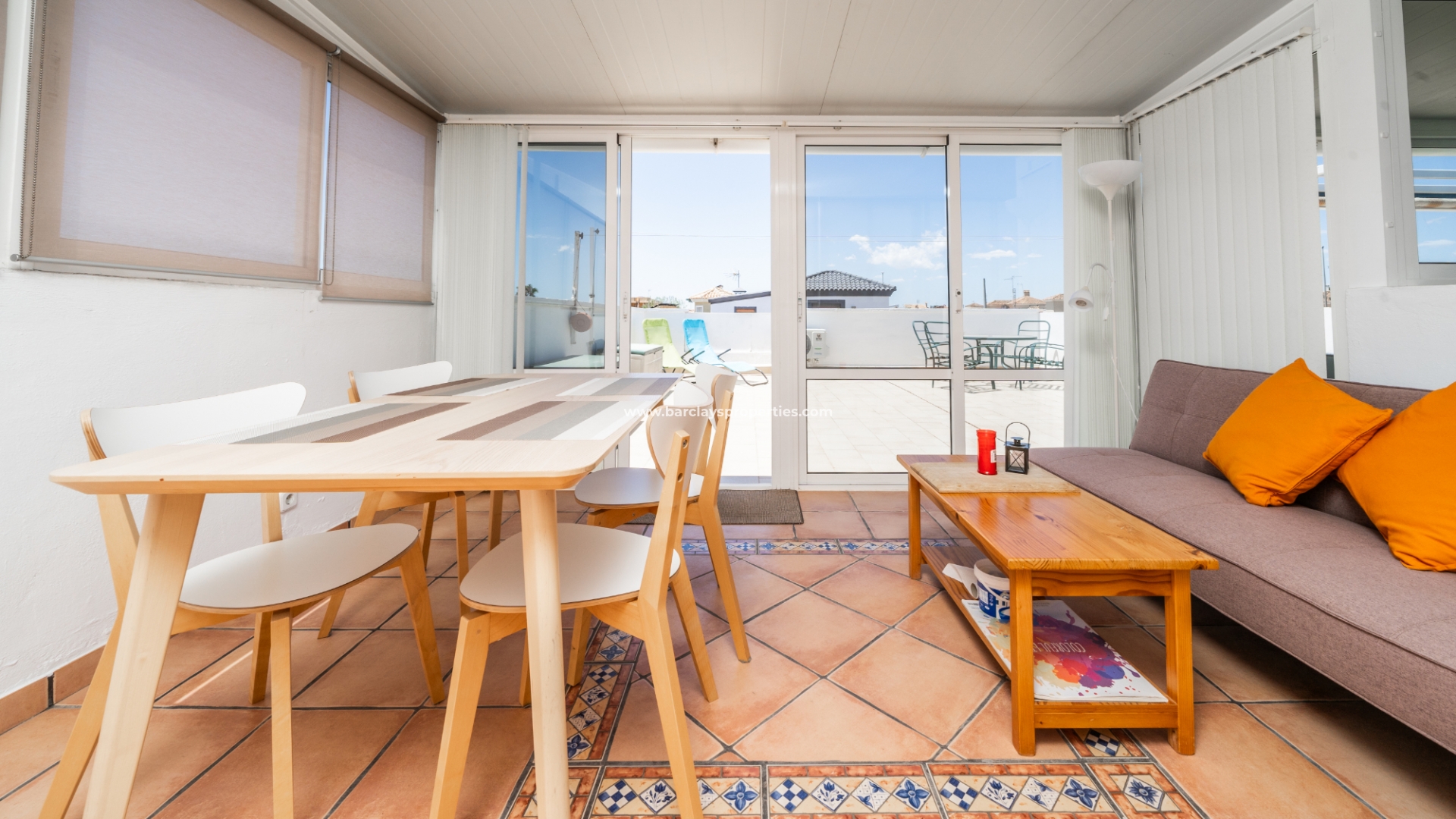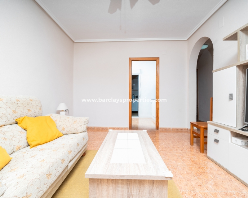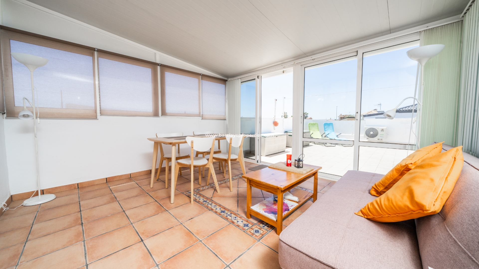 Buitenleven gaat verder in de betegelde en grindtuin en een uitgebreide zonneterras. Vanuit het overdekte veranda gebied, betreden we deze quad villa om de luchtige en lichte woonkamer te vinden, die is uitgerust met een plafondventilator en een nieuw geïnstalleerd airconditioningsysteem, dat comfort het hele jaar door verzekert.