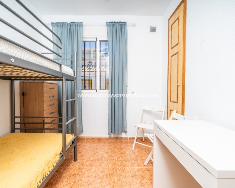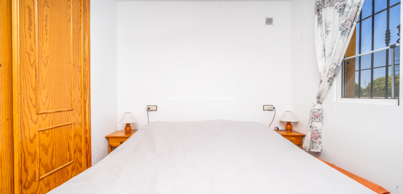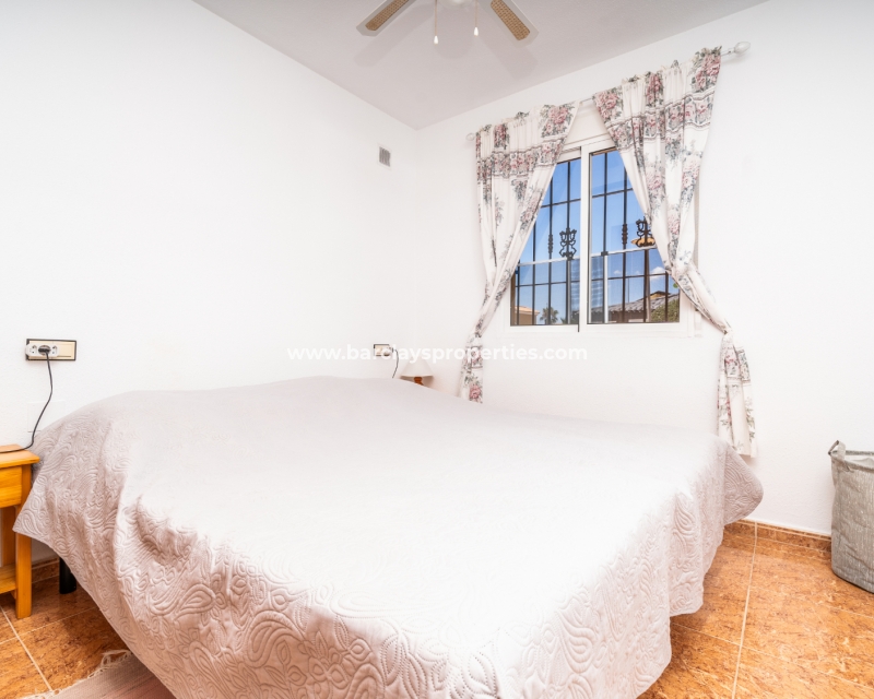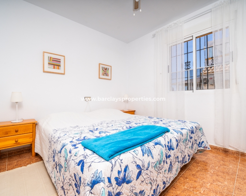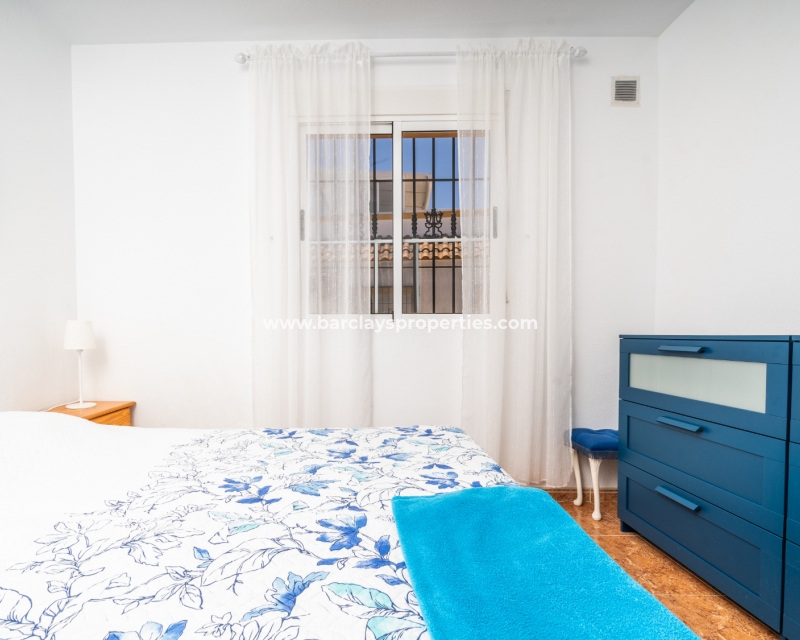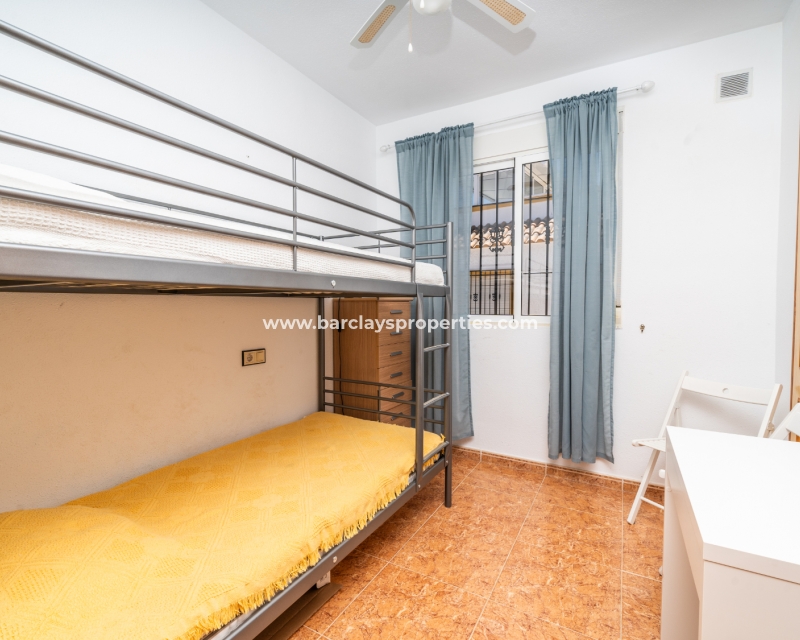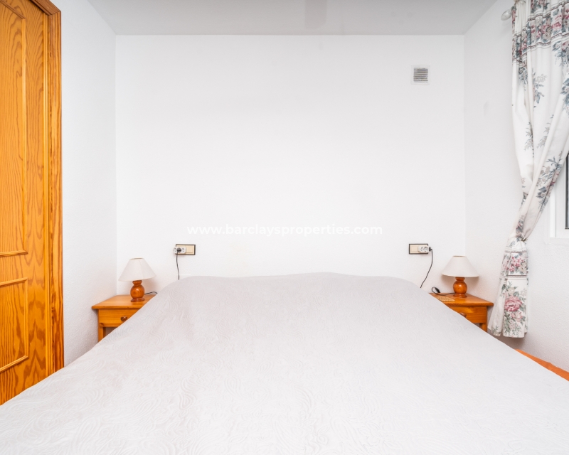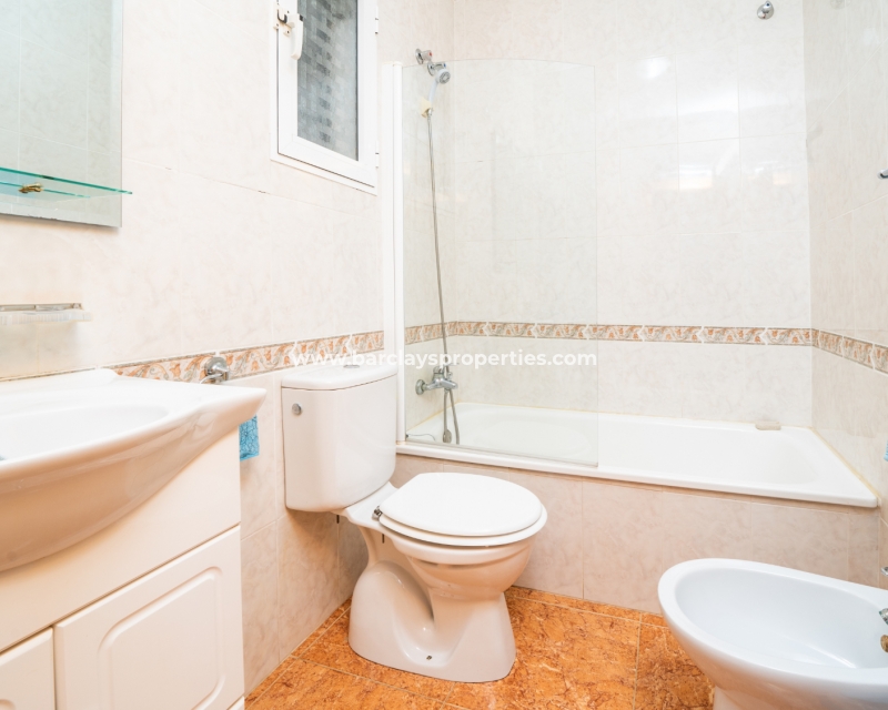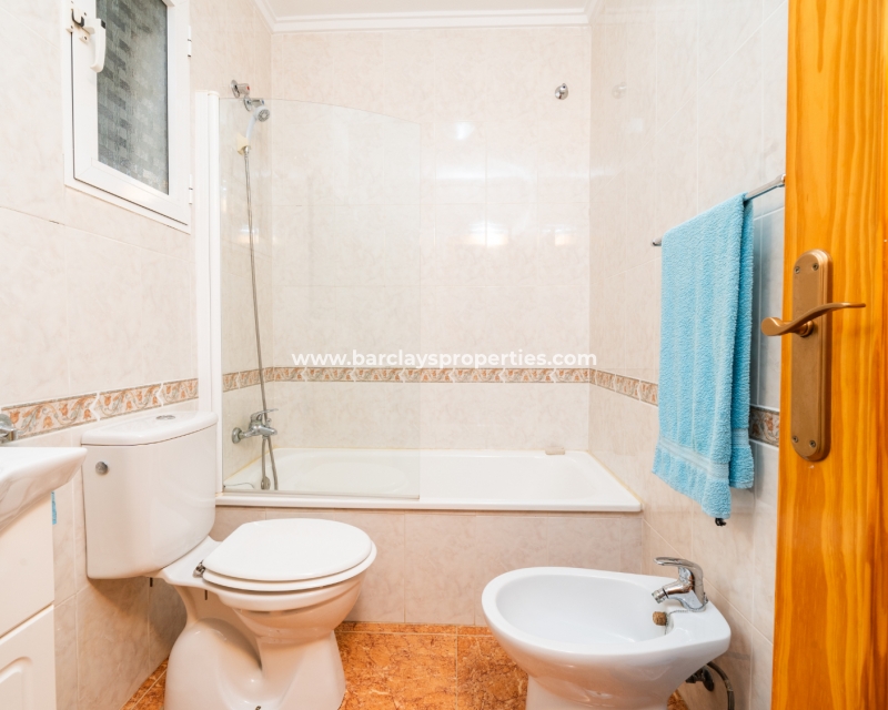 De eerste slaapkamer is een ruime tweepersoonskamer met ingebouwde kasten en een plafondventilator. De tweede slaapkamer heeft ook ingebouwde kasten, terwijl de derde slaapkamer een andere tweepersoonskamer is met een plafondventilator. De familiebadkamer is goed uitgerust met een volwaardig bad, WC, bidet en wastafel.